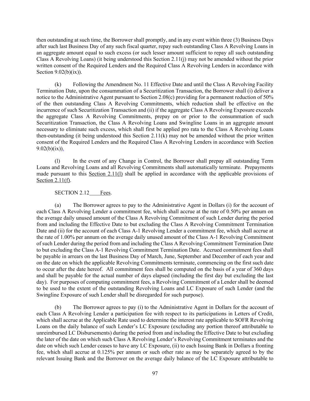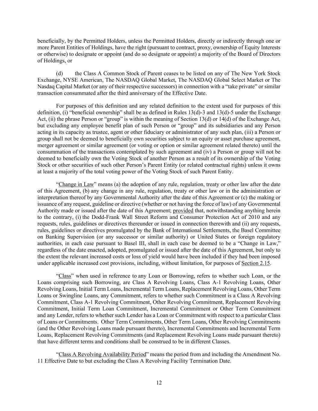 12 beneficially, by the Permitted Holders, unless the Permitted Holders, directly or indirectly through one or more Parent Entities of Holdings, have the right (pursuant to contract, proxy, ownership of Equity Interests or otherwise) to designate or appoint (and do so designate or appoint) a majority of the Board of Directors of Holdings, or (d) the Class A Common Stock of Parent ceases to be listed on any of The New York Stock Exchange, NYSE American, The NASDAQ Global Market, The NASDAQ Global Select Market or The Nasdaq Capital Market (or any of their respective successors) in connection with a “take private” or similar transaction consummated after the third anniversary of the Effective Date. For purposes of this definition and any related definition to the extent used for purposes of this definition, (i) “beneficial ownership” shall be as defined in Rules 13(d)-3 and 13(d)-5 under the Exchange Act, (ii) the phrase Person or “group” is within the meaning of Section 13(d) or 14(d) of the Exchange Act, but excluding any employee benefit plan of such Person or “group” and its subsidiaries and any Person acting in its capacity as trustee, agent or other fiduciary or administrator of any such plan, (iii) a Person or group shall not be deemed to beneficially own securities subject to an equity or asset purchase agreement, merger agreement or similar agreement (or voting or option or similar agreement related thereto) until the consummation of the transactions contemplated by such agreement and (iv) a Person or group will not be deemed to beneficially own the Voting Stock of another Person as a result of its ownership of the Voting Stock or other securities of such other Person’s Parent Entity (or related contractual rights) unless it owns at least a majority of the total voting power of the Voting Stock of such Parent Entity. “Change in Law” means (a) the adoption of any rule, regulation, treaty or other law after the date of this Agreement, (b) any change in any rule, regulation, treaty or other law or in the administration or interpretation thereof by any Governmental Authority after the date of this Agreement or (c) the making or issuance of any request, guideline or directive (whether or not having the force of law) of any Governmental Authority made or issued after the date of this Agreement; provided that, notwithstanding anything herein to the contrary, (i) the Dodd-Frank Wall Street Reform and Consumer Protection Act of 2010 and any requests, rules, guidelines or directives thereunder or issued in connection therewith and (ii) any requests, rules, guidelines or directives promulgated by the Bank of International Settlements, the Basel Committee on Banking Supervision (or any successor or similar authority) or United States or foreign regulatory authorities, in each case pursuant to Basel III, shall in each case be deemed to be a “Change in Law,” regardless of the date enacted, adopted, promulgated or issued after the date of this Agreement, but only to the extent the relevant increased costs or loss of yield would have been included if they had been imposed under applicable increased cost provisions, including, without limitation, for purposes of Section 2.15. “Class” when used in reference to any Loan or Borrowing, refers to whether such Loan, or the Loans comprising such Borrowing, are Class A Revolving Loans, Class A-1 Revolving Loans, Other Revolving Loans, Initial Term Loans, Incremental Term Loans, Replacement Revolving Loans, Other Term Loans or Swingline Loans, any Commitment, refers to whether such Commitment is a Class A Revolving Commitment, Class A-1 Revolving Commitment, Other Revolving Commitment, Replacement Revolving Commitment, Initial Term Loan Commitment, Incremental Commitment or Other Term Commitment and any Lender, refers to whether such Lender has a Loan or Commitment with respect to a particular Class of Loans or Commitments. Other Term Commitments, Other Term Loans, Other Revolving Commitments (and the Other Revolving Loans made pursuant thereto), Incremental Commitments and Incremental Term Loans, Replacement Revolving Commitments (and Replacement Revolving Loans made pursuant thereto) that have different terms and conditions shall be construed to be in different Classes. “Class A Revolving Availability Period” means the period from and including the Amendment No. 11 Effective Date to but excluding the Class A Revolving Facility Termination Date.