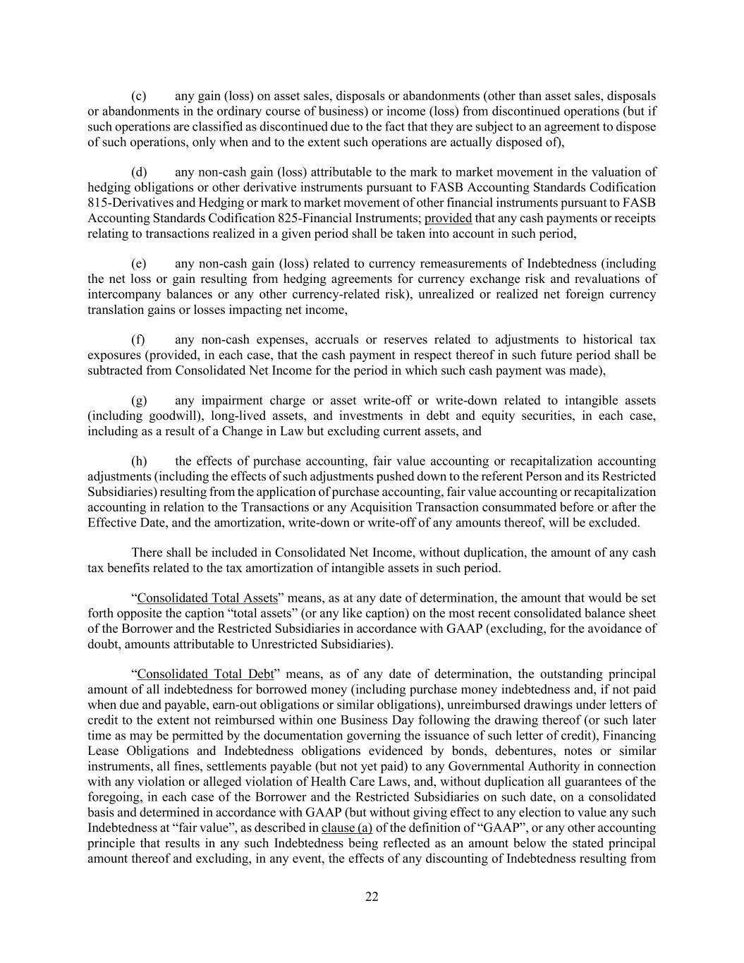 22 (c) any gain (loss) on asset sales, disposals or abandonments (other than asset sales, disposals or abandonments in the ordinary course of business) or income (loss) from discontinued operations (but if such operations are classified as discontinued due to the fact that they are subject to an agreement to dispose of such operations, only when and to the extent such operations are actually disposed of), (d) any non-cash gain (loss) attributable to the mark to market movement in the valuation of hedging obligations or other derivative instruments pursuant to FASB Accounting Standards Codification 815-Derivatives and Hedging or mark to market movement of other financial instruments pursuant to FASB Accounting Standards Codification 825-Financial Instruments; provided that any cash payments or receipts relating to transactions realized in a given period shall be taken into account in such period, (e) any non-cash gain (loss) related to currency remeasurements of Indebtedness (including the net loss or gain resulting from hedging agreements for currency exchange risk and revaluations of intercompany balances or any other currency-related risk), unrealized or realized net foreign currency translation gains or losses impacting net income, (f) any non-cash expenses, accruals or reserves related to adjustments to historical tax exposures (provided, in each case, that the cash payment in respect thereof in such future period shall be subtracted from Consolidated Net Income for the period in which such cash payment was made), (g) any impairment charge or asset write-off or write-down related to intangible assets (including goodwill), long-lived assets, and investments in debt and equity securities, in each case, including as a result of a Change in Law but excluding current assets, and (h) the effects of purchase accounting, fair value accounting or recapitalization accounting adjustments (including the effects of such adjustments pushed down to the referent Person and its Restricted Subsidiaries) resulting from the application of purchase accounting, fair value accounting or recapitalization accounting in relation to the Transactions or any Acquisition Transaction consummated before or after the Effective Date, and the amortization, write-down or write-off of any amounts thereof, will be excluded. There shall be included in Consolidated Net Income, without duplication, the amount of any cash tax benefits related to the tax amortization of intangible assets in such period. “Consolidated Total Assets” means, as at any date of determination, the amount that would be set forth opposite the caption “total assets” (or any like caption) on the most recent consolidated balance sheet of the Borrower and the Restricted Subsidiaries in accordance with GAAP (excluding, for the avoidance of doubt, amounts attributable to Unrestricted Subsidiaries). “Consolidated Total Debt” means, as of any date of determination, the outstanding principal amount of all indebtedness for borrowed money (including purchase money indebtedness and, if not paid when due and payable, earn-out obligations or similar obligations), unreimbursed drawings under letters of credit to the extent not reimbursed within one Business Day following the drawing thereof (or such later time as may be permitted by the documentation governing the issuance of such letter of credit), Financing Lease Obligations and Indebtedness obligations evidenced by bonds, debentures, notes or similar instruments, all fines, settlements payable (but not yet paid) to any Governmental Authority in connection with any violation or alleged violation of Health Care Laws, and, without duplication all guarantees of the foregoing, in each case of the Borrower and the Restricted Subsidiaries on such date, on a consolidated basis and determined in accordance with GAAP (but without giving effect to any election to value any such Indebtedness at “fair value”, as described in clause (a) of the definition of “GAAP”, or any other accounting principle that results in any such Indebtedness being reflected as an amount below the stated principal amount thereof and excluding, in any event, the effects of any discounting of Indebtedness resulting from