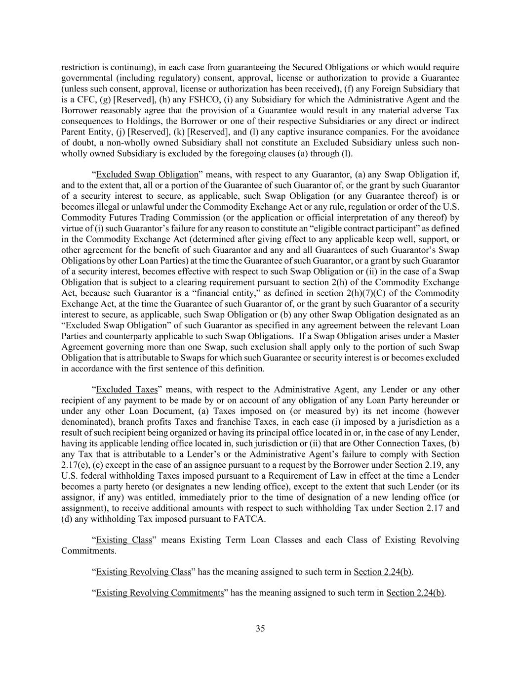 35 restriction is continuing), in each case from guaranteeing the Secured Obligations or which would require governmental (including regulatory) consent, approval, license or authorization to provide a Guarantee (unless such consent, approval, license or authorization has been received), (f) any Foreign Subsidiary that is a CFC, (g) [Reserved], (h) any FSHCO, (i) any Subsidiary for which the Administrative Agent and the Borrower reasonably agree that the provision of a Guarantee would result in any material adverse Tax consequences to Holdings, the Borrower or one of their respective Subsidiaries or any direct or indirect Parent Entity, (j) [Reserved], (k) [Reserved], and (l) any captive insurance companies. For the avoidance of doubt, a non-wholly owned Subsidiary shall not constitute an Excluded Subsidiary unless such non- wholly owned Subsidiary is excluded by the foregoing clauses (a) through (l). “Excluded Swap Obligation” means, with respect to any Guarantor, (a) any Swap Obligation if, and to the extent that, all or a portion of the Guarantee of such Guarantor of, or the grant by such Guarantor of a security interest to secure, as applicable, such Swap Obligation (or any Guarantee thereof) is or becomes illegal or unlawful under the Commodity Exchange Act or any rule, regulation or order of the U.S. Commodity Futures Trading Commission (or the application or official interpretation of any thereof) by virtue of (i) such Guarantor’s failure for any reason to constitute an “eligible contract participant” as defined in the Commodity Exchange Act (determined after giving effect to any applicable keep well, support, or other agreement for the benefit of such Guarantor and any and all Guarantees of such Guarantor’s Swap Obligations by other Loan Parties) at the time the Guarantee of such Guarantor, or a grant by such Guarantor of a security interest, becomes effective with respect to such Swap Obligation or (ii) in the case of a Swap Obligation that is subject to a clearing requirement pursuant to section 2(h) of the Commodity Exchange Act, because such Guarantor is a “financial entity,” as defined in section 2(h)(7)(C) of the Commodity Exchange Act, at the time the Guarantee of such Guarantor of, or the grant by such Guarantor of a security interest to secure, as applicable, such Swap Obligation or (b) any other Swap Obligation designated as an “Excluded Swap Obligation” of such Guarantor as specified in any agreement between the relevant Loan Parties and counterparty applicable to such Swap Obligations. If a Swap Obligation arises under a Master Agreement governing more than one Swap, such exclusion shall apply only to the portion of such Swap Obligation that is attributable to Swaps for which such Guarantee or security interest is or becomes excluded in accordance with the first sentence of this definition. “Excluded Taxes” means, with respect to the Administrative Agent, any Lender or any other recipient of any payment to be made by or on account of any obligation of any Loan Party hereunder or under any other Loan Document, (a) Taxes imposed on (or measured by) its net income (however denominated), branch profits Taxes and franchise Taxes, in each case (i) imposed by a jurisdiction as a result of such recipient being organized or having its principal office located in or, in the case of any Lender, having its applicable lending office located in, such jurisdiction or (ii) that are Other Connection Taxes, (b) any Tax that is attributable to a Lender’s or the Administrative Agent’s failure to comply with Section 2.17(e), (c) except in the case of an assignee pursuant to a request by the Borrower under Section 2.19, any U.S. federal withholding Taxes imposed pursuant to a Requirement of Law in effect at the time a Lender becomes a party hereto (or designates a new lending office), except to the extent that such Lender (or its assignor, if any) was entitled, immediately prior to the time of designation of a new lending office (or assignment), to receive additional amounts with respect to such withholding Tax under Section 2.17 and (d) any withholding Tax imposed pursuant to FATCA. “Existing Class” means Existing Term Loan Classes and each Class of Existing Revolving Commitments. “Existing Revolving Class” has the meaning assigned to such term in Section 2.24(b). “Existing Revolving Commitments” has the meaning assigned to such term in Section 2.24(b).