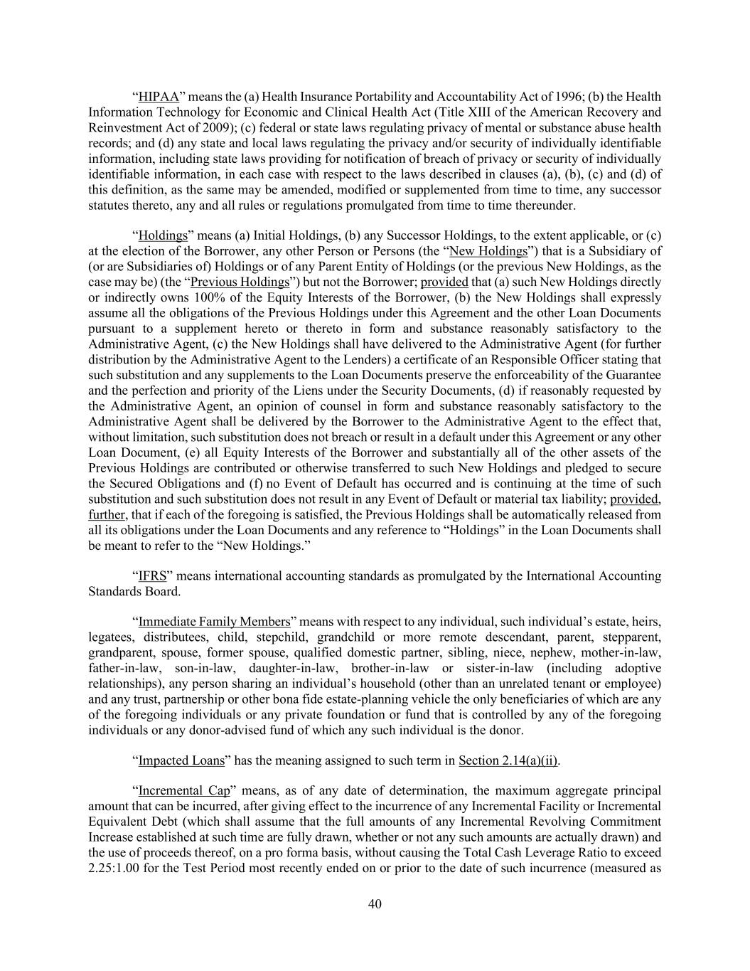 40 “HIPAA” means the (a) Health Insurance Portability and Accountability Act of 1996; (b) the Health Information Technology for Economic and Clinical Health Act (Title XIII of the American Recovery and Reinvestment Act of 2009); (c) federal or state laws regulating privacy of mental or substance abuse health records; and (d) any state and local laws regulating the privacy and/or security of individually identifiable information, including state laws providing for notification of breach of privacy or security of individually identifiable information, in each case with respect to the laws described in clauses (a), (b), (c) and (d) of this definition, as the same may be amended, modified or supplemented from time to time, any successor statutes thereto, any and all rules or regulations promulgated from time to time thereunder. “Holdings” means (a) Initial Holdings, (b) any Successor Holdings, to the extent applicable, or (c) at the election of the Borrower, any other Person or Persons (the “New Holdings”) that is a Subsidiary of (or are Subsidiaries of) Holdings or of any Parent Entity of Holdings (or the previous New Holdings, as the case may be) (the “Previous Holdings”) but not the Borrower; provided that (a) such New Holdings directly or indirectly owns 100% of the Equity Interests of the Borrower, (b) the New Holdings shall expressly assume all the obligations of the Previous Holdings under this Agreement and the other Loan Documents pursuant to a supplement hereto or thereto in form and substance reasonably satisfactory to the Administrative Agent, (c) the New Holdings shall have delivered to the Administrative Agent (for further distribution by the Administrative Agent to the Lenders) a certificate of an Responsible Officer stating that such substitution and any supplements to the Loan Documents preserve the enforceability of the Guarantee and the perfection and priority of the Liens under the Security Documents, (d) if reasonably requested by the Administrative Agent, an opinion of counsel in form and substance reasonably satisfactory to the Administrative Agent shall be delivered by the Borrower to the Administrative Agent to the effect that, without limitation, such substitution does not breach or result in a default under this Agreement or any other Loan Document, (e) all Equity Interests of the Borrower and substantially all of the other assets of the Previous Holdings are contributed or otherwise transferred to such New Holdings and pledged to secure the Secured Obligations and (f) no Event of Default has occurred and is continuing at the time of such substitution and such substitution does not result in any Event of Default or material tax liability; provided, further, that if each of the foregoing is satisfied, the Previous Holdings shall be automatically released from all its obligations under the Loan Documents and any reference to “Holdings” in the Loan Documents shall be meant to refer to the “New Holdings.” “IFRS” means international accounting standards as promulgated by the International Accounting Standards Board. “Immediate Family Members” means with respect to any individual, such individual’s estate, heirs, legatees, distributees, child, stepchild, grandchild or more remote descendant, parent, stepparent, grandparent, spouse, former spouse, qualified domestic partner, sibling, niece, nephew, mother-in-law, father-in-law, son-in-law, daughter-in-law, brother-in-law or sister-in-law (including adoptive relationships), any person sharing an individual’s household (other than an unrelated tenant or employee) and any trust, partnership or other bona fide estate-planning vehicle the only beneficiaries of which are any of the foregoing individuals or any private foundation or fund that is controlled by any of the foregoing individuals or any donor-advised fund of which any such individual is the donor. “Impacted Loans” has the meaning assigned to such term in Section 2.14(a)(ii). “Incremental Cap” means, as of any date of determination, the maximum aggregate principal amount that can be incurred, after giving effect to the incurrence of any Incremental Facility or Incremental Equivalent Debt (which shall assume that the full amounts of any Incremental Revolving Commitment Increase established at such time are fully drawn, whether or not any such amounts are actually drawn) and the use of proceeds thereof, on a pro forma basis, without causing the Total Cash Leverage Ratio to exceed 2.25:1.00 for the Test Period most recently ended on or prior to the date of such incurrence (measured as