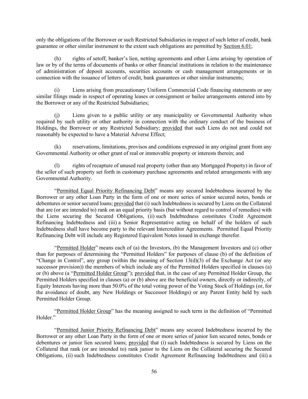 56 only the obligations of the Borrower or such Restricted Subsidiaries in respect of such letter of credit, bank guarantee or other similar instrument to the extent such obligations are permitted by Section 6.01; (h) rights of setoff, banker’s lien, netting agreements and other Liens arising by operation of law or by of the terms of documents of banks or other financial institutions in relation to the maintenance of administration of deposit accounts, securities accounts or cash management arrangements or in connection with the issuance of letters of credit, bank guarantees or other similar instruments; (i) Liens arising from precautionary Uniform Commercial Code financing statements or any similar filings made in respect of operating leases or consignment or bailee arrangements entered into by the Borrower or any of the Restricted Subsidiaries; (j) Liens given to a public utility or any municipality or Governmental Authority when required by such utility or other authority in connection with the ordinary conduct of the business of Holdings, the Borrower or any Restricted Subsidiary; provided that such Liens do not and could not reasonably be expected to have a Material Adverse Effect; (k) reservations, limitations, provisos and conditions expressed in any original grant from any Governmental Authority or other grant of real or immovable property or interests therein; and (l) rights of recapture of unused real property (other than any Mortgaged Property) in favor of the seller of such property set forth in customary purchase agreements and related arrangements with any Governmental Authority. “Permitted Equal Priority Refinancing Debt” means any secured Indebtedness incurred by the Borrower or any other Loan Party in the form of one or more series of senior secured notes, bonds or debentures or senior secured loans; provided that (i) such Indebtedness is secured by Liens on the Collateral that are (or are intended to) rank on an equal priority basis (but without regard to control of remedies) with the Liens securing the Secured Obligations, (ii) such Indebtedness constitutes Credit Agreement Refinancing Indebtedness and (iii) a Senior Representative acting on behalf of the holders of such Indebtedness shall have become party to the relevant Intercreditor Agreements. Permitted Equal Priority Refinancing Debt will include any Registered Equivalent Notes issued in exchange therefor. “Permitted Holder” means each of (a) the Investors, (b) the Management Investors and (c) other than for purposes of determining the “Permitted Holders” for purposes of clause (b) of the definition of “Change in Control”, any group (within the meaning of Section 13(d)(3) of the Exchange Act (or any successor provision)) the members of which include any of the Permitted Holders specified in clauses (a) or (b) above (a “Permitted Holder Group”); provided that, in the case of any Permitted Holder Group, the Permitted Holders specified in clauses (a) or (b) above are the beneficial owners, directly or indirectly, of Equity Interests having more than 50.0% of the total voting power of the Voting Stock of Holdings (or, for the avoidance of doubt, any New Holdings or Successor Holdings) or any Parent Entity held by such Permitted Holder Group. “Permitted Holder Group” has the meaning assigned to such term in the definition of “Permitted Holder.” “Permitted Junior Priority Refinancing Debt” means any secured Indebtedness incurred by the Borrower or any other Loan Party in the form of one or more series of junior lien secured notes, bonds or debentures or junior lien secured loans; provided that (i) such Indebtedness is secured by Liens on the Collateral that rank (or are intended to) rank junior to the Liens on the Collateral securing the Secured Obligations, (ii) such Indebtedness constitutes Credit Agreement Refinancing Indebtedness and (iii) a