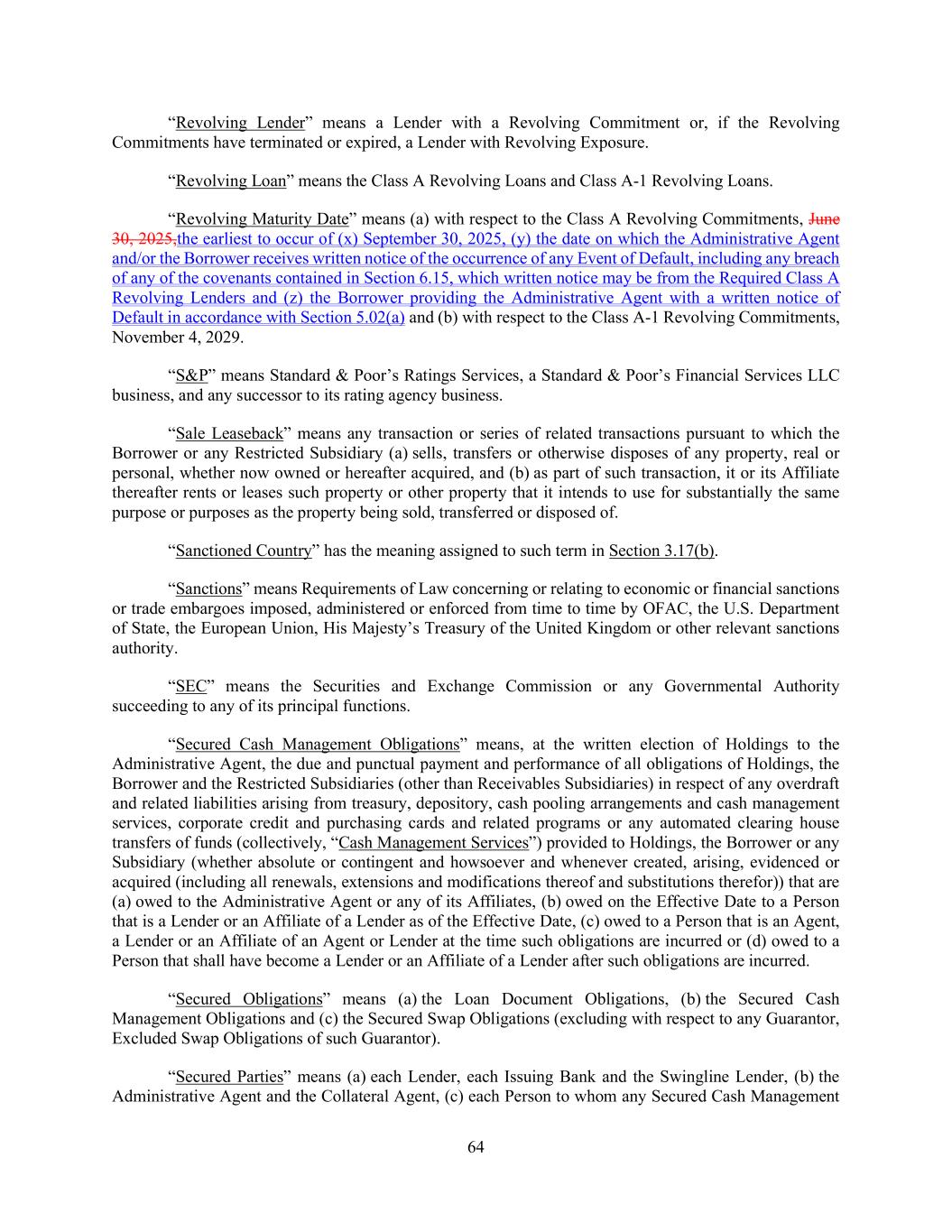 64 “Revolving Lender” means a Lender with a Revolving Commitment or, if the Revolving Commitments have terminated or expired, a Lender with Revolving Exposure. “Revolving Loan” means the Class A Revolving Loans and Class A-1 Revolving Loans. “Revolving Maturity Date” means (a) with respect to the Class A Revolving Commitments, June 30, 2025,the earliest to occur of (x) September 30, 2025, (y) the date on which the Administrative Agent and/or the Borrower receives written notice of the occurrence of any Event of Default, including any breach of any of the covenants contained in Section 6.15, which written notice may be from the Required Class A Revolving Lenders and (z) the Borrower providing the Administrative Agent with a written notice of Default in accordance with Section 5.02(a) and (b) with respect to the Class A-1 Revolving Commitments, November 4, 2029. “S&P” means Standard & Poor’s Ratings Services, a Standard & Poor’s Financial Services LLC business, and any successor to its rating agency business. “Sale Leaseback” means any transaction or series of related transactions pursuant to which the Borrower or any Restricted Subsidiary (a) sells, transfers or otherwise disposes of any property, real or personal, whether now owned or hereafter acquired, and (b) as part of such transaction, it or its Affiliate thereafter rents or leases such property or other property that it intends to use for substantially the same purpose or purposes as the property being sold, transferred or disposed of. “Sanctioned Country” has the meaning assigned to such term in Section 3.17(b). “Sanctions” means Requirements of Law concerning or relating to economic or financial sanctions or trade embargoes imposed, administered or enforced from time to time by OFAC, the U.S. Department of State, the European Union, His Majesty’s Treasury of the United Kingdom or other relevant sanctions authority. “SEC” means the Securities and Exchange Commission or any Governmental Authority succeeding to any of its principal functions. “Secured Cash Management Obligations” means, at the written election of Holdings to the Administrative Agent, the due and punctual payment and performance of all obligations of Holdings, the Borrower and the Restricted Subsidiaries (other than Receivables Subsidiaries) in respect of any overdraft and related liabilities arising from treasury, depository, cash pooling arrangements and cash management services, corporate credit and purchasing cards and related programs or any automated clearing house transfers of funds (collectively, “Cash Management Services”) provided to Holdings, the Borrower or any Subsidiary (whether absolute or contingent and howsoever and whenever created, arising, evidenced or acquired (including all renewals, extensions and modifications thereof and substitutions therefor)) that are (a) owed to the Administrative Agent or any of its Affiliates, (b) owed on the Effective Date to a Person that is a Lender or an Affiliate of a Lender as of the Effective Date, (c) owed to a Person that is an Agent, a Lender or an Affiliate of an Agent or Lender at the time such obligations are incurred or (d) owed to a Person that shall have become a Lender or an Affiliate of a Lender after such obligations are incurred. “Secured Obligations” means (a) the Loan Document Obligations, (b) the Secured Cash Management Obligations and (c) the Secured Swap Obligations (excluding with respect to any Guarantor, Excluded Swap Obligations of such Guarantor). “Secured Parties” means (a) each Lender, each Issuing Bank and the Swingline Lender, (b) the Administrative Agent and the Collateral Agent, (c) each Person to whom any Secured Cash Management