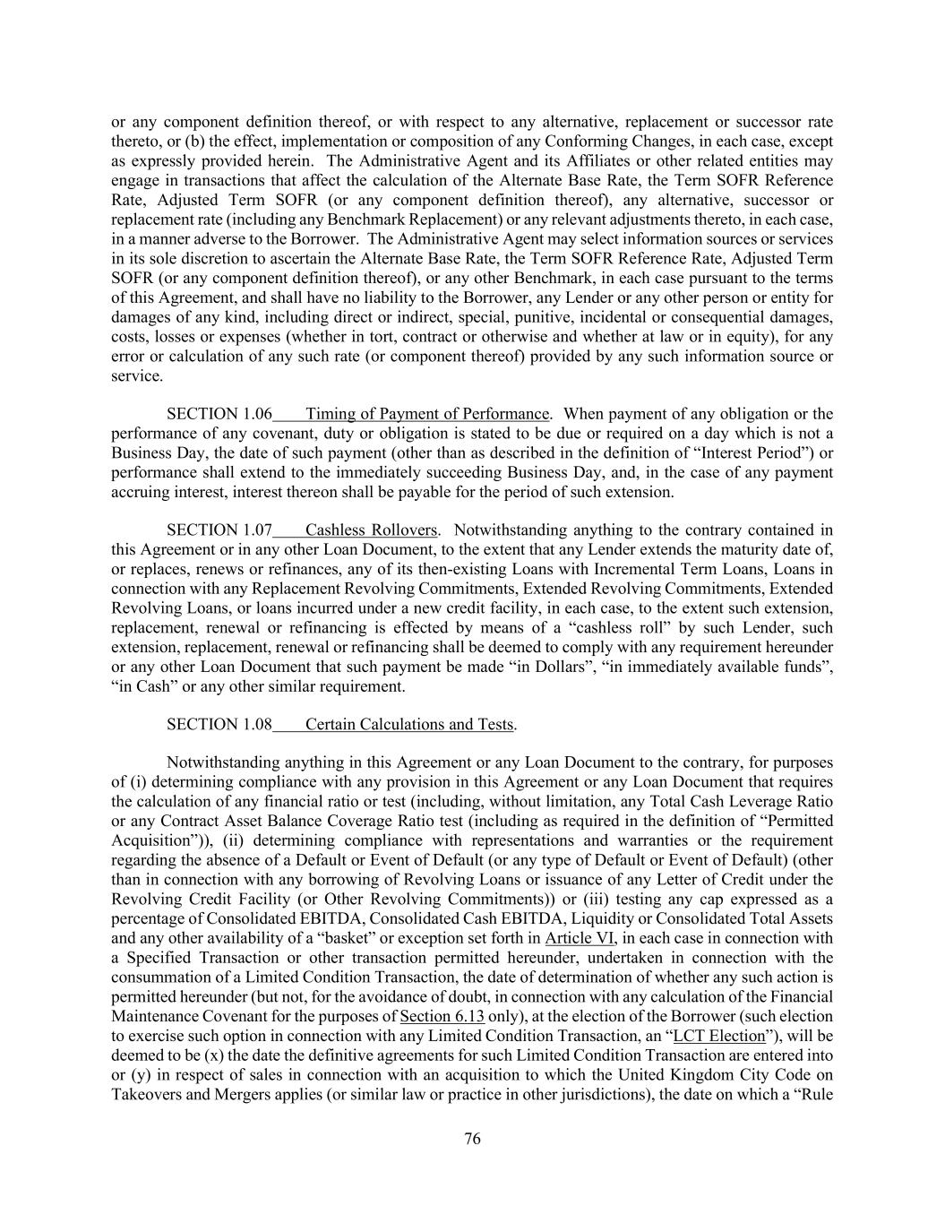 75 faith to enter into an amendment of the relevant affected provisions (without the payment of any amendment or similar fee to the Lenders) to preserve the original intent thereof in light of such change in GAAP or the application thereof. Notwithstanding any other provision contained herein, (a) all terms of an accounting or financial nature used herein shall be construed, and all computations of amounts and ratios referred to herein shall be made, without giving effect to any election under FASB Accounting Standards Codification 825-Financial Instruments, or any successor thereto (including pursuant to the FASB Accounting Standards Codification), to value any Indebtedness of Holdings or any Subsidiary at “fair value,” as defined therein and (b) the amount of any Indebtedness under GAAP with respect to Financing Lease Obligations shall be determined in accordance with the definition of Financing Lease Obligations. (e) For the avoidance of doubt, notwithstanding any classification under GAAP of any Person or business in respect of which a definitive agreement for the Disposition thereof has been entered into as discontinued operations, the Net Income of such Person or business shall not be excluded from the calculation of Net Income until such Disposition shall have been consummated. SECTION 1.05 Currency Translation; Rates. (a) For purposes of any determination under Article V, Article VI or Article VII or any determination under any other provision of this Agreement expressly requiring the use of a current exchange rate, all amounts incurred, outstanding or proposed to be incurred or outstanding in currencies other than Dollars shall be translated into Dollars at the Exchange Rate (rounded to the nearest currency unit, with 0.5 or more of a currency unit being rounded upward); provided, however, that for (x) purposes of determining compliance with Article VI with respect to the amount of any Indebtedness, Lien, Investment, Disposition, Restricted Payment or Restricted Debt Payment in a currency other than Dollars, no Default or Event of Default shall be deemed to have occurred solely as a result of changes in rates of exchange occurring after the time such Indebtedness, Lien or Investment is incurred or Disposition, Restricted Payment or Restricted Debt Payment made and (y) for purposes of determining compliance with any Dollar-denominated restriction on the incurrence of Indebtedness, if such Indebtedness is incurred to Refinance other Indebtedness denominated in a foreign currency, and such Refinancing would cause the applicable Dollar- denominated restriction to be exceeded if calculated at the relevant currency Exchange Rate in effect on the date of such Refinancing, such Dollar-denominated restriction shall be deemed not to have been exceeded so long as the principal amount of the Indebtedness that is incurred to Refinance such Indebtedness does not exceed the principal amount (or accreted amount) of such Indebtedness being Refinanced, except by an amount equal to the accrued interest, dividends and premium (including tender premiums), if any, thereon plus defeasance costs, underwriting discounts and other amounts paid and fees and expenses (including original issue discount, closing payments, upfront fees and similar fees) incurred in connection with such Refinancing plus an amount equal to any existing commitment unutilized and letters of credit undrawn thereunder and; provided further that, for the avoidance of doubt, the foregoing provisions of this Section 1.05 shall otherwise apply to such Sections, including with respect to determining whether any Indebtedness, Lien or Investment may be incurred or Disposition, Restricted Payment or Restricted Debt Payment made at any time under such Sections. For purposes of any determination of Consolidated Total Debt, amounts in currencies other than Dollars shall be translated into Dollars at the currency exchange rates used in preparing the most recently delivered financial statements pursuant to Section 5.01(a) or Section 5.01(b). Each provision of this Agreement shall be subject to such reasonable changes of construction as the Administrative Agent may from time to time specify with the Borrower’s consent (such consent not to be unreasonably withheld) to appropriately reflect a change in currency of any country and any relevant market conventions or practices relating to such change in currency. (b) The Administrative Agent does not warrant, nor accept responsibility, nor shall the Administrative Agent have any liability with respect to (a) the administration, submission, calculation or any other matter related to the Alternate Base Rate or the rates in the definition of “Adjusted Term SOFR”