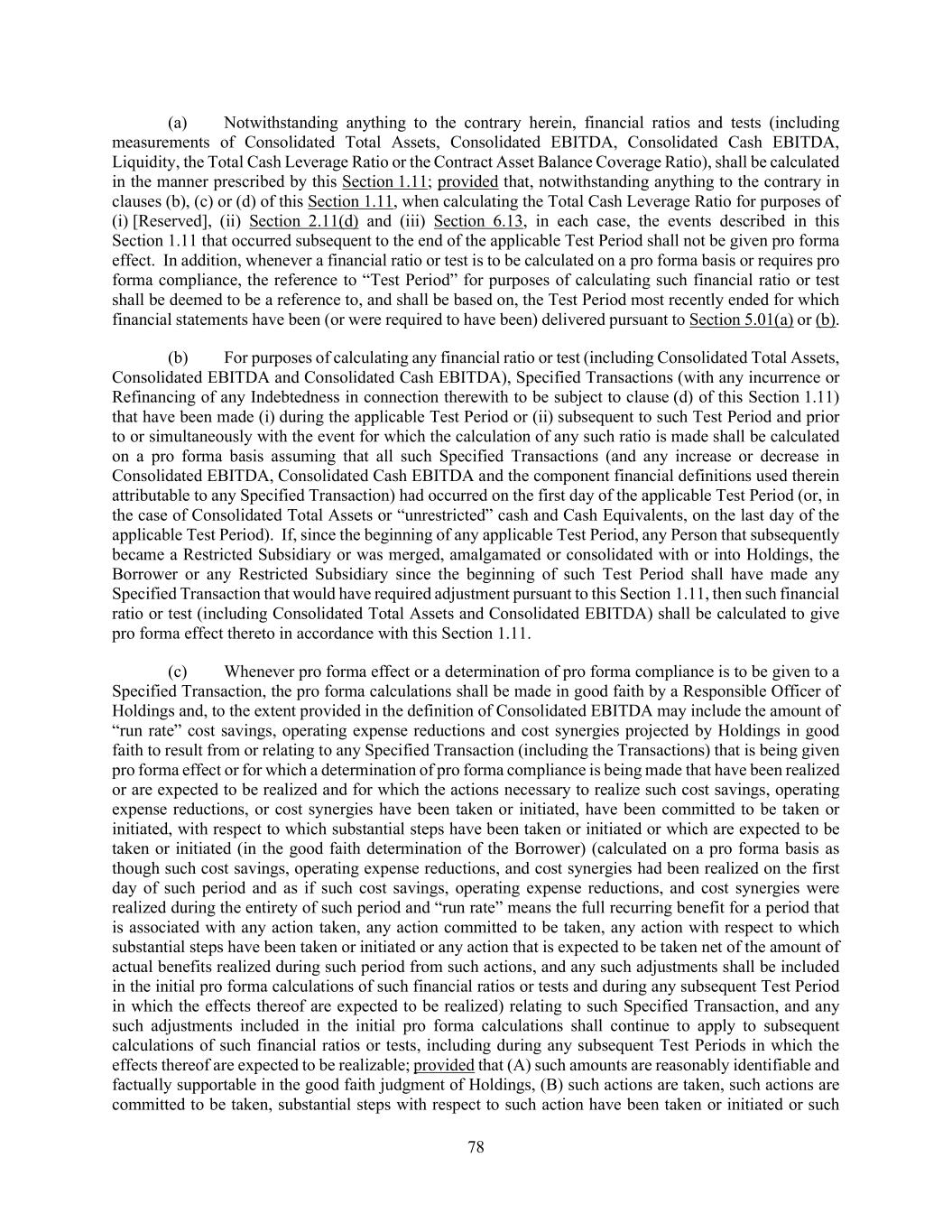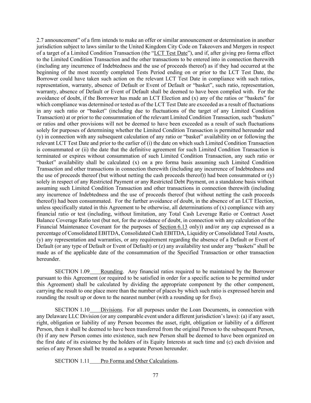 74 the context requires otherwise, (a) any definition of or reference to any agreement (including this Agreement and the other Loan Documents), instrument or other document herein shall be construed as referring to such agreement, instrument or other document as from time to time amended, amended and restated, supplemented or otherwise modified (subject to any restrictions on such amendments, supplements or modifications set forth herein), (b) any reference herein to any Person shall be construed to include such Person’s successors and assigns (subject to any restrictions on assignment set forth herein) and, in the case of any Governmental Authority, any other Governmental Authority that shall have succeeded to any or all functions thereof, (c) the words “herein,” “hereof” and “hereunder,” and words of similar import, shall be construed to refer to this Agreement in its entirety and not to any particular provision hereof, (d) all references herein to Articles, Sections, Exhibits and Schedules shall be construed to refer to Articles and Sections of, and Exhibits and Schedules to, this Agreement and (e) the words “asset” and “property” shall be construed to have the same meaning and effect and to refer to any and all tangible and intangible assets and properties, including cash, securities, accounts and contract rights. SECTION 1.04 Accounting Terms; GAAP. (a) All accounting terms not specifically or completely defined herein shall be construed in conformity with, and all financial data (including financial ratios and other financial calculations) required to be submitted pursuant to this Agreement shall be prepared in conformity with, GAAP, applied in a manner consistent with that used in preparing the Audited Financial Statements, except assuming that ASC 606 has been adopted for the entirety of the period and as otherwise specifically prescribed herein. (b) Where reference is made to “the Borrower and the Restricted Subsidiaries on a consolidated basis” or similar language, such consolidation shall not include any Subsidiaries of Holdings other than the Borrower and the Restricted Subsidiaries. (c) In the event that the Borrower elects to prepare its financial statements in accordance with IFRS and such election results in a change in the method of calculation of financial covenants, standards or terms (collectively, the “Accounting Changes”) in this Agreement, the Borrower and the Administrative Agent agree to enter into good faith negotiations in order to amend such provisions of this Agreement (including the levels applicable herein to any computation of the Total Cash Leverage Ratio or the Contract Asset Balance Coverage Ratio) so as to reflect equitably the Accounting Changes with the desired result that the criteria for evaluating the Borrower’s financial condition shall be substantially the same after such change as if such change had not been made. Until such time as such an amendment shall have been executed and delivered by the Borrower, the Administrative Agent and the Required Lenders, all financial covenants, standards and terms in this Agreement shall continue to be calculated or construed in accordance with GAAP (as determined in good faith by a Responsible Officer of the Borrower) (it being agreed that the reconciliation between GAAP and IFRS used in such determination shall be made available to Lenders) as if such change had not occurred. (d) If the Borrower notifies the Administrative Agent that the Borrower requests an amendment to any provision hereof to eliminate the effect of any change occurring after the Effective Date in GAAP or in the application thereof on the operation of such provision (or if the Administrative Agent notifies the Borrower that the Required Lenders request an amendment to any provision hereof for such purpose), regardless of whether any such notice is given before or after such change in GAAP or in the application thereof, then such provision shall be interpreted on the basis of GAAP as in effect and applied immediately before such change shall have become effective until such notice shall have been withdrawn or such provision amended in accordance herewith (but only to the extent that, without undue burden and expense, the Borrower, its auditors and/or its financial systems are capable of interpreting such provisions as if such change had not occurred); provided, further, that if such an amendment is requested by the Borrower or the Required Lenders, then the Borrower and the Administrative Agent shall negotiate in good