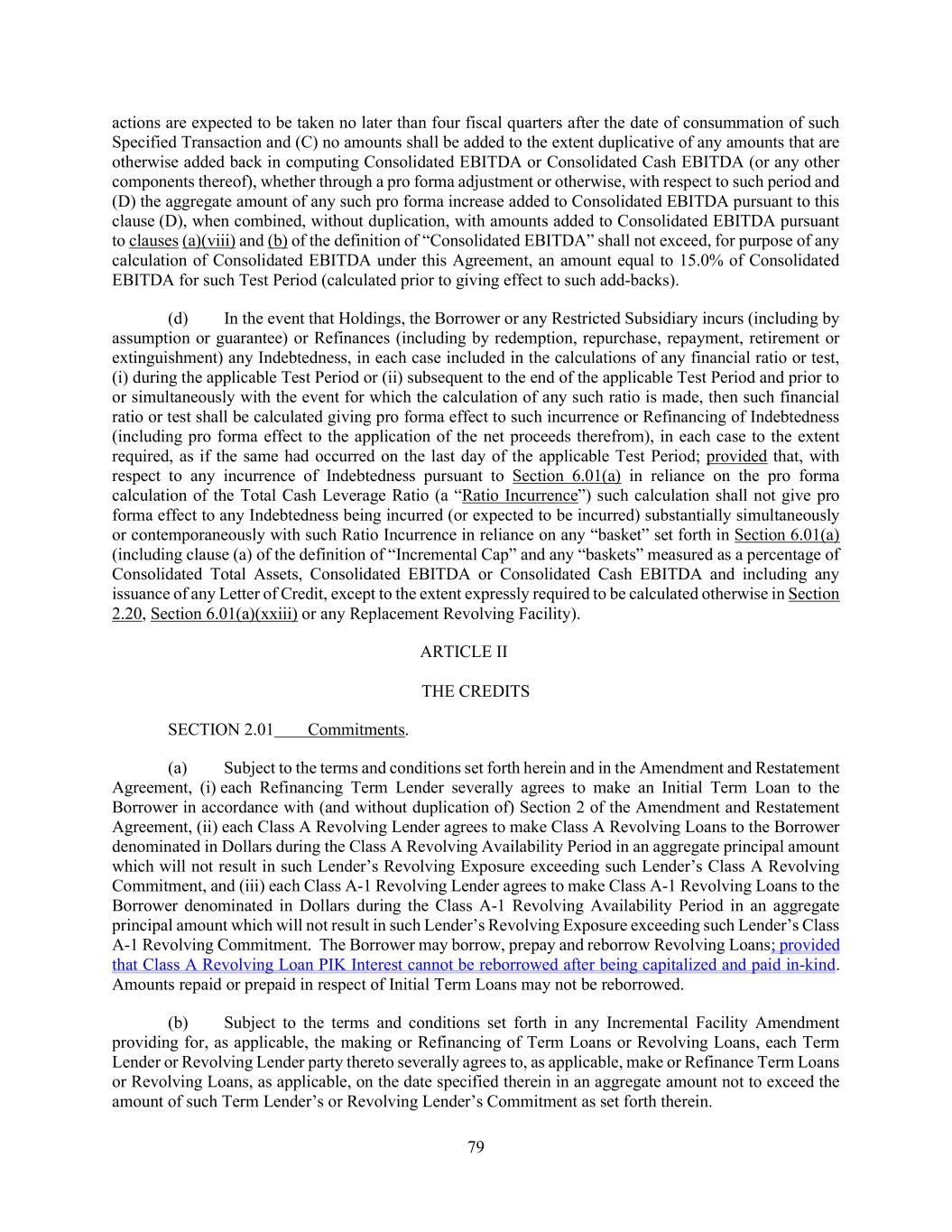 170 (t) any breach of Section 6.15, it being understood and agreed that such Event of Default may only be waived, forebeared upon, amended or modified in any way by the Required Class A Revolving Lenders with the consent of the Borrower and the Required Lenders. then, and in every such event (other than an event with respect to the Borrower described in clause (h) or (i) of this Section), and at any time thereafter during the continuance of such event, the Administrative Agent may, and at the request of the Required Lenders shall, by notice to the Borrower, take any or all of the following actions, at the same or different times: (i) terminate the Commitments, and thereupon the Commitments shall terminate immediately, (ii) declare the Loans then outstanding to be due and payable in whole (or in part, (but ratably as among Classes of Loans and the Loans of each Class at the time outstanding) in which case any principal not so declared to be due and payable may thereafter be declared to be due and payable), and thereupon the principal of the Loans so declared to be due and payable, together with accrued interest thereon and all fees and other obligations of the Borrower accrued hereunder, shall become due and payable immediately, and (iii) require the deposit of cash collateral in respect of LC Exposure as provided in Section 2.05(j), in each case without presentment, demand, protest or other notice of any kind, all of which are hereby waived by Holdings, the Borrower and each other Loan Party; and in the case of any event with respect to the Borrower described in clause (h) or (i) of this Section, the Commitments shall automatically terminate and the principal of the Loans then outstanding, together with accrued interest thereon and all fees and other obligations of the Borrower accrued hereunder, shall immediately and automatically become due and payable and the deposit of such cash collateral in respect of LC Exposure shall immediately and automatically become due, in each case without presentment, demand, protest or other notice of any kind, all of which are hereby waived by Holdings, the Borrower and each other Loan Party. SECTION 7.02 Right to Cure. Notwithstanding anything to the contrary contained in Section 7.01, in the event that the Borrower fails to comply with the requirements of the Financial Maintenance Covenants described in Section 6.13(a) and Section 6.13(b), at any time from the last day of such applicable quarter until the expiration of the tenth Business Day subsequent to the date on which the financial statements with respect to such fiscal quarter (or the fiscal year ended on the last day of such fiscal quarter) are required to be delivered pursuant to Section 5.01(a) or Section 5.01(b), as applicable, the Borrower (or any Parent Entity thereof) shall have the right to issue Qualified Equity Interests or other Equity Interests reasonably satisfactory to the Administrative Agent (but excluding Disqualified Equity Interests) (each such issuance taken pursuant and in accordance with this Section 7.02, a “Specified Equity Issuance”) for cash or otherwise receive cash contributions to (or in the case of any other Parent Entity, receive equity interests in the Borrower for its cash contributions to) the Equity Interests (other than Disqualified Equity Interests) of the Borrower as cash common equity or other Qualified Equity Interests or other Equity Interests reasonably satisfactory to the Administrative Agent, in each case, which are contributed to the Borrower in the form of cash (collectively, the “Cure Right”), and upon the receipt by the Borrower of the Net Proceeds of such issuance that are Not Otherwise Applied (the “Cure Amount”) pursuant to the exercise by the Borrower of such Cure Right, the applicable Financial Maintenance Covenant shall be recalculated giving pro form effect to the following pro forma adjustment: (a) (i) Consolidated Cash EBITDA shall be increased with respect to such applicable fiscal quarter with respect to which such Cure Amount is received by the Borrower and any Test Period that includes such fiscal quarter, solely for the purpose of measuring the Total Cash Leverage Covenant and not for any other purpose under this Agreement, by an amount equal to the Cure Amount and (ii) with respect to the Asset Coverage Covenant, Consolidated Total Debt shall be reduced by the portion of the Cure Amount that is actually applied to prepay such Indebtedness; (b) if, after giving effect to the foregoing recalculation, the Borrower and its Restricted Subsidiaries shall then be in compliance with the applicable Financial Maintenance Covenant, the Borrower