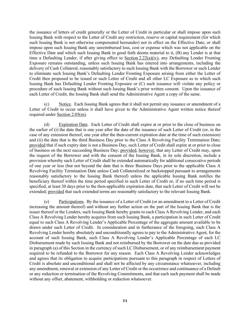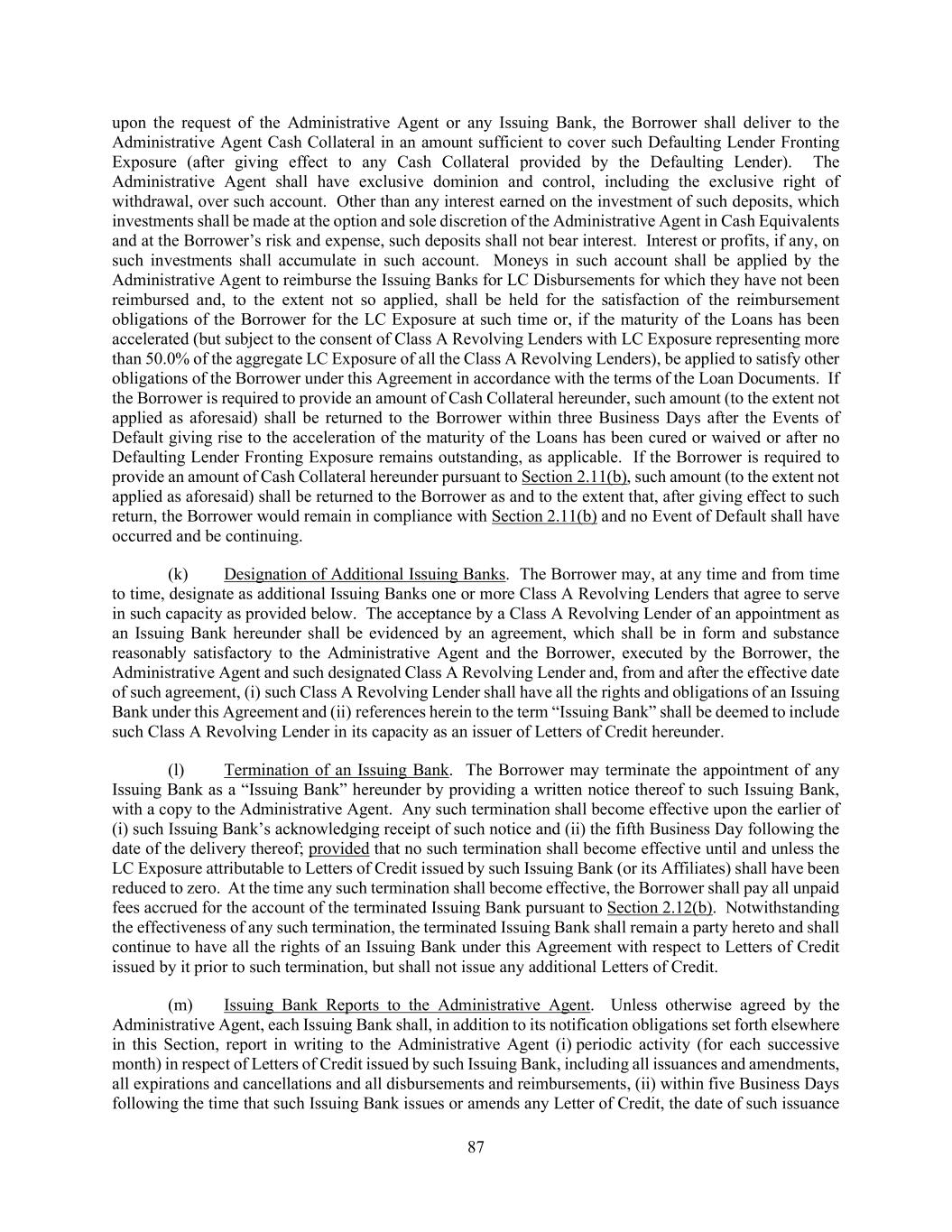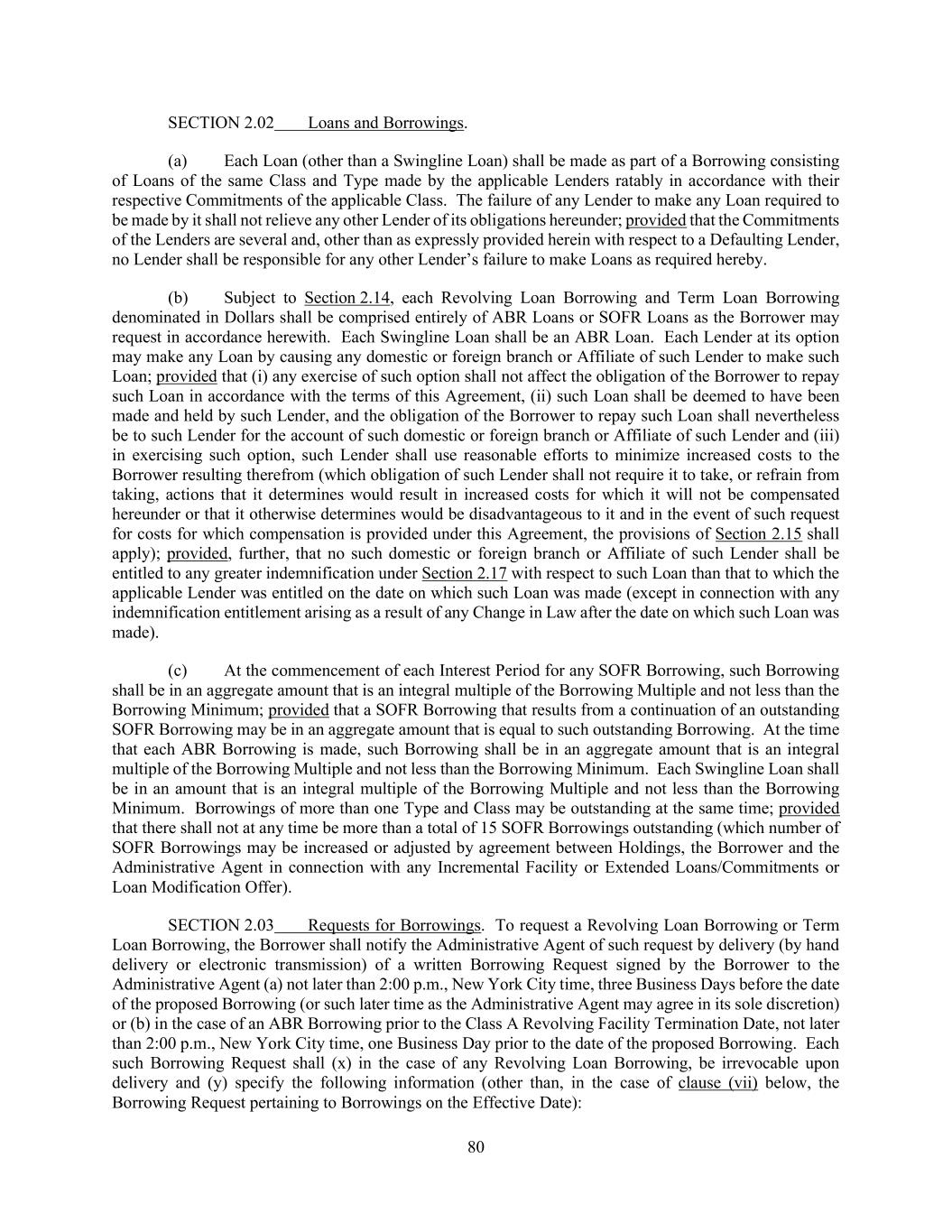 113 Section 2.20 and such technical amendments (including, without limitation, as set forth in clause (f) above) as may be necessary or appropriate in the reasonable opinion of the Administrative Agent and the Borrower in connection with the establishment of such new Classes or sub-Classes, in each case on terms consistent with this Section 2.20. (j) Notwithstanding anything to the contrary, this Section 2.20 shall supersede any provisions in Section 2.18 or Section 9.02 to the contrary. SECTION 2.21 [Reserved]. SECTION 2.22 Defaulting Lenders. (a) General. Notwithstanding anything to the contrary contained in this Agreement, if any Lender becomes a Defaulting Lender, then, until such time as that Lender is no longer a Defaulting Lender, to the extent permitted by applicable law: (i) Waivers and Amendments. Such Defaulting Lender’s right to approve or disapprove any amendment, waiver or consent with respect to this Agreement shall be restricted as set forth in Section 9.02. (ii) Reallocation of Payments. Subject to the last sentence of Section 2.11(f)(i), the last sentence of Section 2.11(f)(ii) and the last sentence of Section 2.11(g), any payment of principal, interest, fees or other amounts received by the Administrative Agent for the account of that Defaulting Lender (whether voluntary or mandatory, at maturity, pursuant to Article VII or otherwise, and including any amounts made available to the Administrative Agent by that Defaulting Lender pursuant to Section 9.08), shall be applied at such time or times as may be determined by the Administrative Agent as follows: first, to the payment of any amounts owing by that Defaulting Lender to the Administrative Agent hereunder; second, in the case of a Revolving Lender, to the payment on a pro rata basis of any amounts owing by that Defaulting Lender to each Issuing Bank and the Swingline Lender hereunder; third, as the Borrower may request (so long as no Default or Event of Default exists), to the funding of any Loan in respect of which that Defaulting Lender has failed to fund its portion thereof as required by this Agreement, as determined by the Administrative Agent; fourth, in the case of a Revolving Lender, if so determined by the Administrative Agent, Holdings and the Borrower, to be held in a non-interest bearing deposit account and released in order to satisfy obligations of that Defaulting Lender to fund Loans under this Agreement; fifth, to the payment of any amounts owing to the Lenders, the Issuing Banks or the Swingline Lender as a result of any judgment of a court of competent jurisdiction obtained by any Lender, such Issuing Bank or the Swingline Lender against that Defaulting Lender as a result of that Defaulting Lender’s breach of its obligations under this Agreement; sixth, so long as no Default or Event of Default exists, to the payment of any amounts owing to the Borrower as a result of any judgment of a court of competent jurisdiction obtained by the Borrower against that Defaulting Lender as a result of that Defaulting Lender’s breach of its obligations under this Agreement; and seventh, to that Defaulting Lender or as otherwise directed by a court of competent jurisdiction; provided that if such payment is a payment of the principal amount of any Loans or LC Disbursements and such Lender is a Defaulting Lender under clause (a) of the definition thereof, such payment shall be applied solely to pay the relevant Loans of, or LC Disbursements owed to, as applicable, the relevant non-Defaulting Lenders on a pro rata basis prior to being applied pursuant to the other provisions of this Section 2.22(a)(ii). Any payments, prepayments or other amounts paid or payable to a Defaulting Lender that are applied (or held) to pay amounts owed by a Defaulting Lender or to post Cash Collateral pursuant to Section 2.05(j) shall be deemed paid to and redirected by that Defaulting Lender, and each Lender irrevocably consents hereto.
