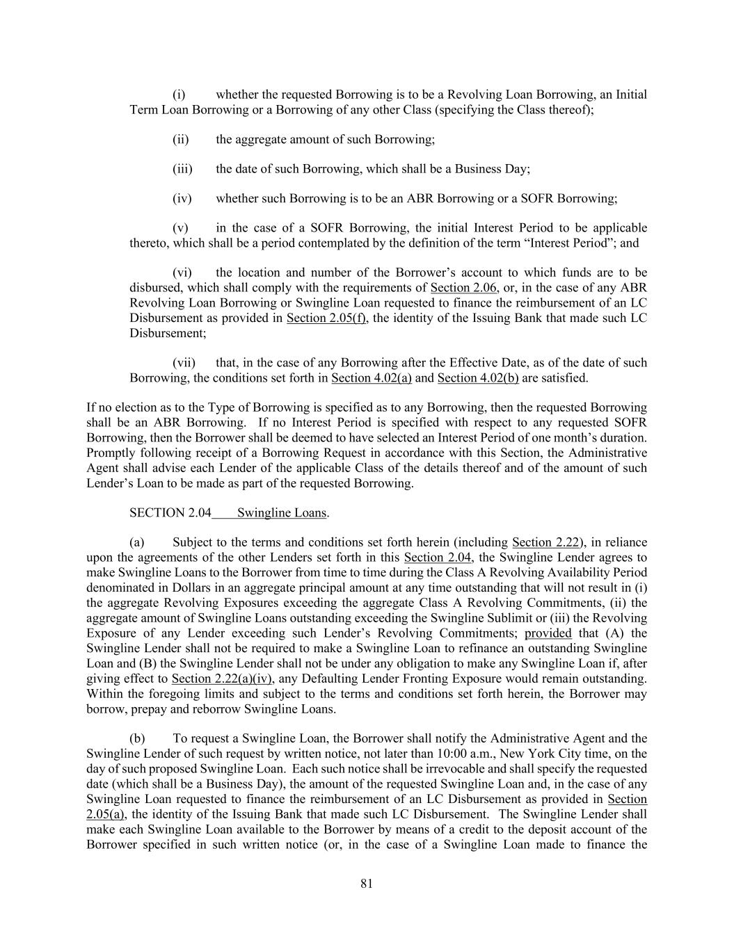 102 definition) for all Benchmark settings at or after such time to reinstate such previously removed tenor. (v) Benchmark Unavailability Period. Upon the Borrower’s receipt of notice of the commencement of a Benchmark Unavailability Period, (A) the Borrower may revoke any pending request for a Borrowing of, conversion to or continuation of SOFR Loans to be made, converted or continued during any Benchmark Unavailability Period and, failing that, the Borrower will be deemed to have converted any such request into a request for a Borrowing of or conversion to ABR Loans and (B) any outstanding affected SOFR Loans will be deemed to have been converted to ABR Loans at the end of the applicable Interest Period. During a Benchmark Unavailability Period or at any time that a tenor for the then-current Benchmark is not an Available Tenor, the component of Alternate Base Rate based upon the then-current Benchmark or such tenor for such Benchmark, as applicable, will not be used in any determination of Alternate Base Rate. SECTION 2.15 Increased Costs. (a) If any Change in Law shall: (i) impose, modify or deem applicable any reserve, special deposit, compulsory loan, insurance charge or similar requirement against assets of, deposits with or for the account of, or credit extended by, any Lender or any Issuing Bank; or (ii) impose on any Lender or any Issuing Bank any other condition, cost or expense (other than with respect to Taxes) affecting this Agreement or SOFR Loans made by such Lender or any Letter of Credit or participation therein; or (iii) subject any Lender or any Issuing Bank to any Taxes on its Loans, letters of credit, Commitments, or other obligations, or its deposits, reserves, other liabilities or capital attributable thereto; and the result of any of the foregoing shall be to increase the cost to such Lender or Issuing Bank of making or maintaining any Loan (or of maintaining its obligation to make any such Loan) or to increase the cost to such Lender or Issuing Bank of participating in, issuing or maintaining any Letter of Credit (or of maintaining its obligation to participate in or issue any Letter of Credit) or to reduce the amount of any sum received or receivable by such Lender or Issuing Bank hereunder (whether of principal, interest or otherwise), then, from time to time upon request of such Lender or Issuing Bank, the Borrower will pay to such Lender or Issuing Bank, as the case may be, such additional amount or amounts as will compensate such Lender or Issuing Bank, as the case may be, for such increased costs actually incurred or reduction actually suffered, provided that the Borrower shall not be liable for such compensation if, in the case of requests for reimbursement under clause (ii) above resulting from a market disruption, (A) the relevant circumstances are not generally affecting the banking market or (B) the applicable request has not been made by Lenders constituting Required Lenders; provided, further, that to the extent any such costs or reductions are incurred by any Lender as a result of any requests, rules, guidelines or directives enacted or promulgated under the Dodd-Frank Wall Street Reform and Consumer Protection Act of 2010 or under Basel III, then such Lender shall be compensated pursuant to this Section 2.15(a) only to the extent such Lender is imposing such charges on similarly situated borrowers where the terms of other syndicated credit facilities permit it to impose such charges. Notwithstanding the foregoing, this paragraph will not apply to (A) Indemnified Taxes, (B) Taxes described in clauses (b) through (d) of the definition of Excluded Taxes and (C) Connection Income Taxes.