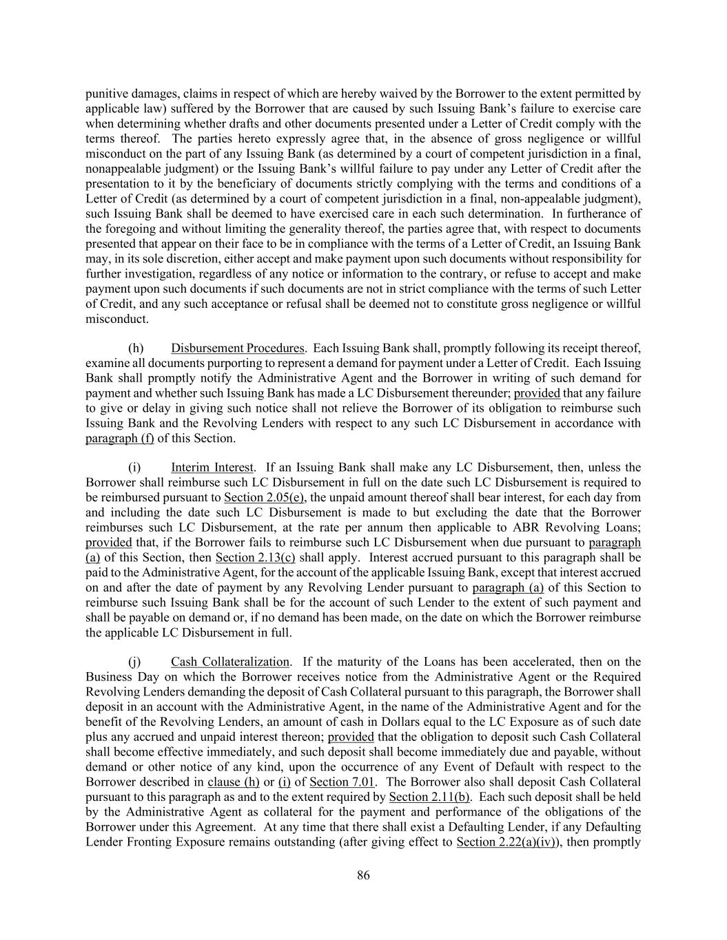 114 (iii) Certain Fees. That Defaulting Lender (x) shall not be entitled to receive or accrue any commitment fee pursuant to Section 2.12(a) for any period during which that Lender is a Defaulting Lender (and the Borrower shall not be required to pay any such fee that otherwise would have been required to have been paid to that Defaulting Lender) and (y) shall be limited in its right to receive Letter of Credit fees as provided in Section 2.12(f). (iv) Reallocation of Applicable Percentages to Reduce Fronting Exposure. During any period in which there is a Defaulting Lender, for purposes of computing the amount of the obligation of each non-Defaulting Lender to acquire, refinance or fund participations in Swingline Loans and Letters of Credit pursuant to Section 2.04 and Section 2.05, the “Applicable Percentage” of each non-Defaulting Lender shall be computed without giving effect to the Revolving Commitment of that Defaulting Lender; provided that the aggregate obligation of each non- Defaulting Lender to acquire, refinance or fund participations in Letters of Credit and Swingline Loans shall not at any time exceed the positive difference, if any, of (1) the Revolving Commitment of that non-Defaulting Lender minus (2) the aggregate Revolving Exposure of that Lender. If the reallocation provided for in the preceding sentence cannot, or can only partially, be effected, the Borrower shall (A) first, prepay the portion of such Defaulting Lender’s Swingline Exposure that has not been reallocated and (B) second, cash collateralize for the benefit of the Issuing Banks the portion of such Defaulting Lender’s LC Exposure that has not been reallocated in accordance with the procedures set forth in Section 2.05(j) for so long as such unreallocated LC Exposure is outstanding. (b) Defaulting Lender Cure. If the Borrower, the Administrative Agent, the Swingline Lender and each Issuing Bank agree in writing in their sole discretion that a Defaulting Lender should no longer be deemed to be a Defaulting Lender, the Administrative Agent will so notify the parties hereto, whereupon as of the effective date specified in such notice and subject to any conditions set forth therein (which may include arrangements with respect to any Cash Collateral), such Lender will, to the extent applicable, purchase that portion of outstanding Loans of the other Lenders or take such other actions as the Administrative Agent may determine to be necessary to cause the Loans and funded and unfunded participations in Letters of Credit and Swingline Loans to be held on a pro rata basis by the Lenders in accordance with their Applicable Percentages (without giving effect to Section 2.22(a)(iv)), whereupon that Lender will cease to be a Defaulting Lender; provided that no adjustments will be made retroactively with respect to fees accrued or payments made by or on behalf of the Borrower while that Lender was a Defaulting Lender; and provided further that except to the extent otherwise expressly agreed by the affected parties, no change hereunder from Defaulting Lender to Lender will constitute a waiver or release of any claim of any party hereunder arising from that Lender’s having been a Defaulting Lender. SECTION 2.23 Illegality. If any Lender determines that any law has made it unlawful, or that any Governmental Authority has asserted that it is unlawful, for any Lender to make, maintain or fund Loans whose interest is determined by reference to Adjusted Term SOFR, or to determine or charge interest rates based upon Adjusted Term SOFR, then, on notice thereof by such Lender to the Borrower through the Administrative Agent, any obligation of such Lender to make or continue SOFR Loans or to convert ABR Loans to SOFR Loans shall be suspended until such Lender notifies the Administrative Agent and the Borrower that the circumstances giving rise to such determination no longer exist. Upon receipt of such notice, (x) the Borrower shall, upon three (3) Business Days’ notice from such Lender (with a copy to the Administrative Agent), prepay or, if applicable, convert all SOFR Loans of such Lender to ABR Loans, either on the last day of the Interest Period therefor, if such Lender may lawfully continue to maintain such SOFR Loans to such day, or immediately, if such Lender may not lawfully continue to maintain such SOFR Loans, and (y) if such notice asserts the illegality of such Lender determining or charging interest rates based upon Adjusted Term SOFR, the Administrative Agent shall, during the period of such suspension, compute the Alternate Base Rate applicable to such Lender without reference to the Adjusted Term SOFR