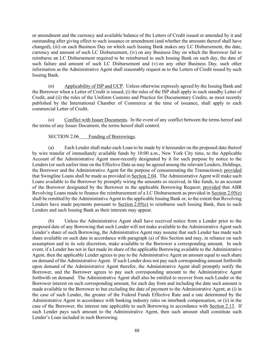 47 the Uniform Customs and Practice for Documentary Credits or applicable law, or the express terms of the Letter of Credit, such Letter of Credit shall be deemed to be “outstanding” in the amount so remaining available to be drawn. Unless otherwise specified herein, the amount of a Letter of Credit at any time shall be deemed to be the amount available to be drawn under such Letter of Credit in effect at such time; provided that with respect to any Letter of Credit that, by its terms or the terms of any document related thereto, provides for one or more automatic increases in the amount available thereunder, the amount of such Letter of Credit shall be deemed to be the maximum amount available to be drawn under such Letter of Credit after giving effect to all such increases, whether or not such maximum amount is available to be drawn immediately at such time. “LCT Election” has the meaning specified in Section 1.08. “LCT Test Date” has the meaning specified in Section 1.08. “Lenders” means the Term Lenders, the Revolving Lenders and any other Person that shall have become a party hereto pursuant to an Assignment and Assumption or an Incremental Facility Amendment, other than any such Person that ceases to be a party hereto pursuant to an Assignment and Assumption. Unless the context otherwise requires, the term “Lenders” includes the Swingline Lender. “Letter of Credit” means any letter of credit issued pursuant to Section 2.05 of this Agreement, other than any such letter of credit that shall have ceased to be a “Letter of Credit” outstanding hereunder pursuant to Section 9.05. A Letter of Credit may be a commercial letter of credit, trade letter of credit or a standby letter of credit; provided that no Issuing Bank shall be required to issue a commercial letter of credit or trade letter of credit without its consent. “Letter of Credit Application” means an application and agreement for the issuance or amendment of a Letter of Credit in the form from time to time in use by the Issuing Bank. “Letter of Credit Sublimit” means $5,000,000. “Liability Management Transaction” shall mean any of the following: (i) any refinancing, retirement, exchange, extension, amendment, repurchase, replacement, or defeasance of any existing Indebtedness of Holdings, the Borrower or any Guarantor with any other Indebtedness, equity or quasi-equity (or the proceeds of any other Indebtedness, equity or quasi-equity) that is/are more contractually, structurally, or temporally senior (or is/are more senior (a) in respect of Lien priority with respect to any Collateral, or (b) by means of additional or separate collateral or additional or separate guarantors, obligors or other credit support or through a “double dip” or “pari plus,” or similar structure) to any of the existing Indebtedness (including, for the avoidance of doubt, through any incurrence of Indebtedness, equity or quasi-equity by a Person that is not a Loan Party, whether or not such Person owns any assets or property), in each case, than it was prior to such transaction; (ii) any transaction or series of related transactions involving any Investment, Restricted Payment, Restricted Debt Payment, Restricted Junior Debt, conveyance, sale, lease or other disposition or transfer of assets to an Affiliate or direct or indirect joint venture of the Borrower that is not a Loan Party to (i) guarantee any existing debt or equity financing, or (ii) facilitate a new debt or equity financing (including any preferred equity financing) incurred by such non-Loan Party that has recourse (directly or indirectly, including through a secured receivable but excluding intercompany claims arising in the ordinary course of business and not incurred in contemplation of or in connection with such capital raise) to Holdings, the Borrower or any Guarantor; or
