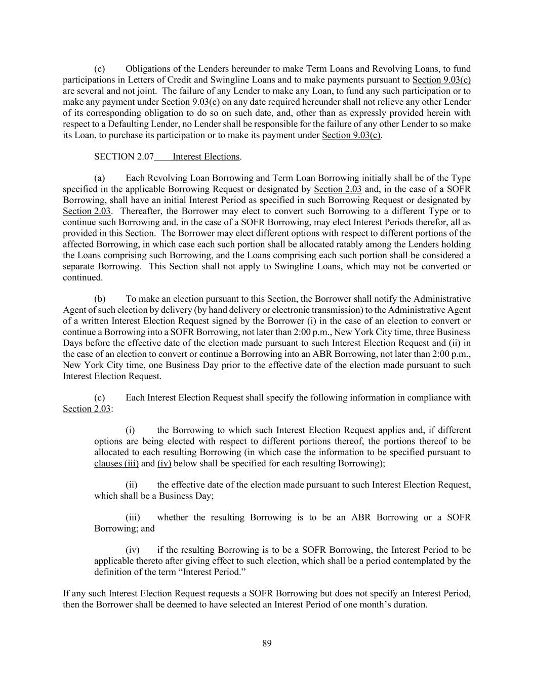 107 (g) Each party’s obligations under this Section 2.17 shall survive the resignation or replacement of the Administrative Agent or any assignment of rights by, or the replacement of, a Lender, or the consummation of the transactions contemplated hereby, the repayment, satisfaction or discharge of all obligations under any Loan Document, the expiration or termination of the Letters of Credit and the Commitments or the termination of this Agreement or any provision hereof. (h) For purposes of this Section 2.17 and the indemnity set forth in Article VIII, the term “Lender” shall include any Issuing Bank and the Swingline Lender and “applicable Requirements of Law” shall include FATCA. SECTION 2.18 Payments Generally; Pro Rata Treatment; Sharing of Setoffs. (a) The Borrower shall make each payment required to be made by it under any Loan Document (whether of principal, interest, fees, or reimbursement of LC Disbursement of amounts payable under Section 2.15, 2.16 or 2.17, or otherwise) prior to the time expressly required hereunder or under such other Loan Document for such payment (or, if no such time is expressly required, prior to 2:00 p.m., New York City time), on the date when due, in immediately available funds, without setoff or counterclaim. Any amounts received after such time on any date may, in the discretion of the Administrative Agent, be deemed to have been received on the next succeeding Business Day for purposes of calculating interest thereon. All such payments shall be made to such account as may be specified by the Administrative Agent, except payments to be made directly to any Issuing Bank or the Swingline Lender shall be made as expressly provided herein and except that payments pursuant to Sections 2.15, 2.16, 2.17 and 9.03 shall be made directly to the Persons entitled thereto and payments pursuant to other Loan Documents shall be made to the Persons specified therein. The Administrative Agent shall distribute any such payments received by it for the account of any other Person to the appropriate recipient promptly following receipt thereof. If any payment (other than payments on the SOFR Loans) under any Loan Document shall be due on a day that is not a Business Day, the date for payment shall be extended to the next succeeding Business Day. If any payment on a SOFR Loan becomes due and payable on a day other than a Business Day, the maturity thereof shall be extended to the next succeeding Business Day unless the result of such extension would be to extend such payment into another calendar month, in which event such payment shall be made on the immediately preceding Business Day. In the case of any payment of principal pursuant to the preceding two sentences, interest thereon shall be payable at the then applicable rate for the period of such extension. All payments or prepayments of any Loan or LC Disbursement (or of interest thereon) and all other payments under each Loan Document, in each case, shall be made in Dollars. (b) If at any time insufficient funds are received by and available to the Administrative Agent to pay fully all amounts of principal, unreimbursed LC Disbursements, interest, premiums and fees then due hereunder, such funds shall be applied (i) first, towards payment of interest, premiums and fees then due hereunder, ratably among the parties entitled thereto in accordance with the amounts of interest, premiums and fees then due to such parties, and (ii) second, towards payment of principal and unreimbursed LC Disbursements then due hereunder, ratably among the parties entitled thereto in accordance with the amounts of principal and unreimbursed LC Disbursements then due to such parties. (c) Except as otherwise set forth in this Agreement or any other Loan Document, if any Lender shall, by exercising any right of setoff or counterclaim or otherwise, obtain payment in respect of any principal of or interest on any of its Loans of a given Class or participations in LC Disbursements or Swingline Loans resulting in such Lender receiving payment of a greater proportion of the aggregate amount of its Loans or participations in LC Disbursements or Swingline Loans and accrued interest thereon than the proportion received by any other Lender and such other Lender would have been entitled to be treated on a pro rata basis with such receiving Lender, then the Lender receiving such greater proportion shall purchase (for cash at face value) participations in the Loans or participations in LC Disbursements or