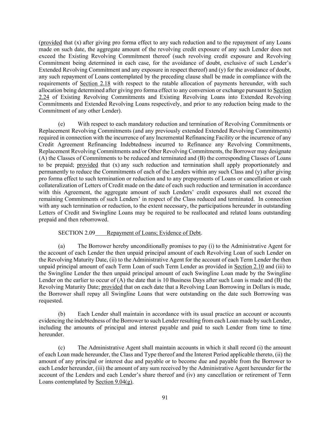 118 (e) Notwithstanding anything to the contrary contained in this Agreement, (A) on any date on which any Existing Term Loan Class or Class of Existing Revolving Commitments is converted or exchanged to extend the related scheduled maturity date(s) in accordance with paragraph (a) above (an “Extension Date”), (I) in the case of the existing Term Loans of each Extending Lender, the aggregate principal amount of such existing Term Loans shall be deemed reduced by an amount equal to the aggregate principal amount of Extended Term Loans so converted or exchanged by such Lender on such date, and the Extended Term Loans shall be established as a separate Class of Term Loans (together with any other Extended Term Loans so established on such date) and (II) in the case of the Existing Revolving Commitments of each Extending Lender under any Specified Existing Revolving Commitment Class, the aggregate principal amount of such Existing Revolving Commitments shall be deemed reduced by an amount equal to the aggregate principal amount of Extended Revolving Commitments so converted or exchanged by such Lender on such date (or by any greater amount as may be agreed by the Borrower and such Lender), and such Extended Revolving Commitments shall be established as a separate Class of revolving credit commitments from the Specified Existing Revolving Commitment Class and from any other Existing Revolving Commitments (together with any other Extended Revolving Commitments so established on such date) and (B) if, on any Extension Date, any Existing Revolving Loans of any Extending Lender are outstanding under the Specified Existing Revolving Commitment Class, such Existing Revolving Loans (and any related participations) shall be deemed to be converted or exchanged to Extended Revolving Loans (and related participations) of the applicable Class in the same proportion as such Extending Lender’s Specified Existing Revolving Commitments to Extended Revolving Commitments of such Class. (f) In the event that the Administrative Agent determines in its sole discretion that the allocation of Extended Term Loans of a given Extension Series or the Extended Revolving Commitments of a given Extension Series, in each case to a given Lender was incorrectly determined as a result of manifest administrative error in the receipt and processing of an Extension Election timely submitted by such Lender in accordance with the procedures set forth in the applicable Loan Modification Agreement, then the Administrative Agent, Holdings, the Borrower and such affected Lender may (and hereby are authorized to), in their sole discretion and without the consent of any other Lender, enter into an amendment to this Agreement and the other Loan Documents (each, a “Corrective Loan Modification Agreement”) within 15 days following the effective date of such Loan Modification Agreement, as the case may be, which Corrective Loan Modification Agreement shall (i) provide for the conversion or exchange and extension of Term Loans under the Existing Term Loan Class or Existing Revolving Commitments (and related Revolving Exposure), as the case may be, in such amount as is required to cause such Lender to hold Extended Term Loans or Extended Revolving Commitments (and related revolving credit exposure) of the applicable Extension Series into which such other Term Loans or Commitments were initially converted or exchanged, as the case may be, in the amount such Lender would have held had such administrative error not occurred and had such Lender received the minimum allocation of the applicable Loans or Commitments to which it was entitled under the terms of such Loan Modification Agreement, in the absence of such error, (ii) be subject to the satisfaction of such conditions as the Administrative Agent, Holdings, the Borrower and such Lender may agree (including conditions of the type required to be satisfied for the effectiveness of a Loan Modification Agreement described in Section 2.24(d)), and (iii) effect such other amendments of the type (with appropriate reference and nomenclature changes) described in the penultimate sentence of Section 2.24(c). (g) No conversion or exchange of Loans or Commitments pursuant to any Loan Modification Agreement in accordance with this Section 2.24 shall constitute a voluntary or mandatory payment or prepayment for purposes of this Agreement. (h) If, in connection with any proposed Loan Modification Offer, any Lender declines to consent to such Loan Modification Offer on the terms and by the deadline set forth in such Loan