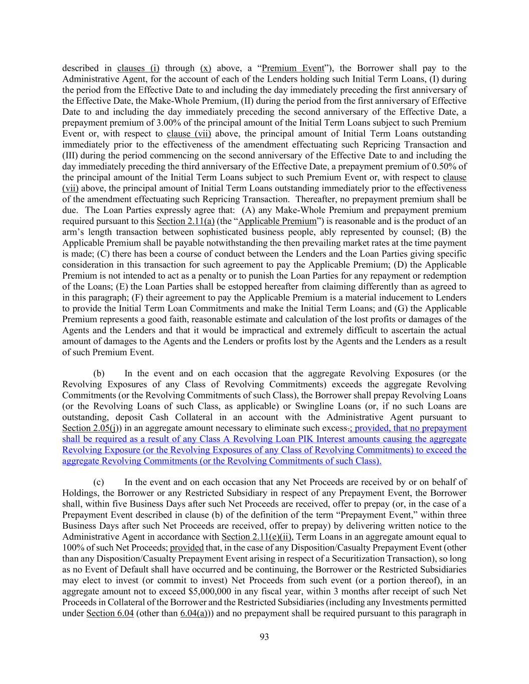 61 giving effect to control of remedies) with the liens on the Collateral securing the Initial Term Loans (i) having an Effective Yield for the respective Type of such Indebtedness that is less than (and not by virtue of any fluctuation in any “base” rate) the Effective Yield for the Initial Term Loans, and (ii) the proceeds of which are used to prepay (or, in the case of a conversion, deemed to prepay or replace), in whole or in part, outstanding principal of Initial Term Loans or (b) any amendment (or any mandatory assignment in connection with any such amendment) resulting in the effective reduction in the Effective Yield for the Initial Term Loans. Any determination by the Administrative Agent with respect to whether a Repricing Transaction shall have occurred shall be conclusive and binding on all Lenders holding the Initial Term Loans. “Required Additional Debt Terms” means, with respect to any Incremental Equivalent Debt and Acquisition Debt, (a) such Indebtedness does not mature earlier than the date that is 91 days after the Latest Maturity Date or have a Weighted Average Life to Maturity less than the greatest Weighted Average Life to Maturity of the then-existing Term Loans outstanding at the time of incurrence of such Indebtedness, (b) the terms of such Indebtedness in respect thereof do not provide for any mandatory prepayments, mandatory redemptions, mandatory commitment reductions, mandatory offers to purchase or mandatory sinking fund obligations prior to the Latest Maturity Date, other than customary prepayments, commitment reductions, repurchases, redemptions, defeasances, acquisitions or satisfactions and discharges, or offers to prepay, reduce, redeem, repurchase, defease, acquire or satisfy and discharge, in each case upon, a change of control, asset sale event or casualty, eminent domain or condemnation event, or on account of the accumulation of excess cash flow (in the case of loans or commitments), AHYDO Catch-Up Payments and customary acceleration rights upon an event of default, (c) except for any of the following that are applicable only to periods following the Latest Maturity Date, the covenants, events of default and other terms for such Indebtedness or commitments (excluding, for the avoidance of doubt, interest rates (including through fixed interest rates), interest rate margins, rate floors, fees, maturity, funding discounts, original issue discounts, currency type and denomination, and redemption or prepayment terms and premiums), when taken as a whole, are not materially more restrictive on Holdings, the Borrower and the Restricted Subsidiaries than the terms of this Agreement, when taken as a whole (provided that, if the documentation governing such Indebtedness or commitments contains any covenant or provision that is not included in this Agreement at such time, the Administrative Agent shall have been given prompt written notice thereof and this Agreement shall have been amended to include such covenant or provision for the benefit of each Credit Facility), (d) in the event that the Effective Yield for any Incremental Equivalent Debt is greater than the Effective Yield for the Initial Term Loans by more than 0.50% per annum, then the Applicable Rate for such Initial Term Loans shall be increased to the extent necessary so that the Effective Yield for such Initial Term Loans shall be equal to the Effective Yield with respect to such Incremental Equivalent Debt minus 0.50% per annum, (e) to the extent such Indebtedness is secured by any assets, such Indebtedness shall not be secured by any assets of a Loan Party other than the Collateral securing the Secured Obligations and shall be subject to the relevant Intercreditor Agreements and (f) to the extent such Indebtedness is incurred or guaranteed by any Loan Party, such Indebtedness shall not be guaranteed by any Person that is not a Loan Party (except to the extent such Indebtedness that is subject to the Required Additional Debt Terms is expressly permitted to be incurred by any Restricted Subsidiary that is not a Loan Party under Section 6.01(a)(xix)). “Required Class A Revolving Lenders” means, at any time after the Amendment No. 11 Effective Date, Class A Revolving Lenders having Class A Revolving Exposures and unused Class A Revolving Commitments representing more than 50.0% of the aggregate Class A Revolving Exposures and unused Class A Revolving Commitments at such time; provided that whenever there are one or more Defaulting Lenders, the total outstanding Class A Revolving Exposures and unused Class A Revolving Commitments of each Defaulting Lender shall be excluded for purposes of making a determination of Required Class A Revolving Lenders.