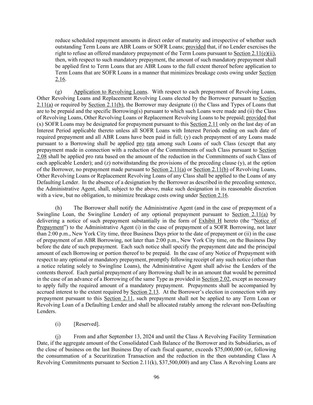 115 component thereof until the Administrative Agent is advised in writing by such Lender that it is no longer illegal for such Lender to determine or charge interest rates based upon Adjusted Term SOFR. Each Lender agrees to notify the Administrative Agent and the Borrower in writing promptly upon becoming aware that it is no longer illegal for such Lender to determine or charge interest rates based upon Adjusted Term SOFR. Upon any such prepayment or conversion, the Borrower shall also pay accrued interest on the amount so prepaid or converted. SECTION 2.24 Loan Modification Offers. (a) The Borrower may at any time and from time to time request that all or a portion of each Term Loan of any Class (an “Existing Term Loan Class”) be converted or exchanged to extend the scheduled final maturity date(s) of any payment of principal with respect to all or a portion of any principal amount of such Term Loans (any such Term Loans which have been so extended, “Extended Term Loans”) and to provide for other terms consistent with this Section 2.24. Prior to entering into any Loan Modification Agreement with respect to any Extended Term Loans, the Borrower shall provide written notice to the Administrative Agent (who shall provide a copy of such notice to each of the Lenders of the applicable Existing Term Loan Class, with such request offered equally to all such Lenders of such Existing Term Loan Class) (a “Term Loan Extension Request”) setting forth the proposed terms of the Extended Term Loans to be established, which terms shall be similar to the Term Loans of the Existing Term Loan Class from which they are to be extended except that (w) the scheduled final maturity date shall be extended and all or any of the scheduled amortization payments of all or a portion of any principal amount of such Extended Term Loans may be delayed to later dates than the scheduled amortization of principal of the Term Loans of such Existing Term Loan Class (with any such delay resulting in a corresponding adjustment to the scheduled amortization payments reflected in Section 2.10 or in the Loan Modification Agreement or the Incremental Facility Amendment, as the case may be, with respect to the Existing Term Loan Class of Term Loans from which such Extended Term Loans were extended, in each case as more particularly set forth in Section 2.24(c) below), (x)(A) the interest rates (including through fixed interest rates), interest margins, rate floors, upfront fees, funding discounts, AHYDO Catch-Up Payments, original issue discounts, currency types and denominations and prepayment terms and premiums with respect to the Extended Term Loans may be different than those for the Term Loans of such Existing Term Loan Class and/or (B) additional fees and/or premiums may be payable to the Lenders providing such Extended Term Loans in addition to any of the items contemplated by the preceding clause (A), in each case, to the extent provided in the applicable Loan Modification Agreement, (y) subject to the provisions set forth in Section 2.11, the Extended Term Loans may have optional prepayment terms (including call protection and prepayment terms and premiums) and mandatory prepayment terms as may be agreed between Holdings, the Borrower and the Lenders thereof and (z) the Loan Modification Agreement may provide for other covenants and terms that apply to any period after the Latest Maturity Date. No Lender shall have any obligation to agree to have any of its Term Loans of any Existing Term Loan Class converted into Extended Term Loans pursuant to any Term Loan Extension Request. Any Extended Term Loans of any Extension Series shall constitute a separate Class of Term Loans from the Existing Term Loan Class of Term Loans from which they were extended. (b) The Borrower may at any time and from time to time request that all or a portion of the Revolving Commitments of any Class (other than Class A Revolving Commitments), the Extended Revolving Commitments of any Class (other than Class A Revolving Commitments) and/or any Replacement Revolving Commitments (and, in each case, including any previously extended Revolving Commitments and/or Replacement Revolving Commitments), existing at the time of such request (each, an “Existing Revolving Commitment” and any related revolving credit loans under any such facility, “Existing Revolving Loans”; each Existing Revolving Commitment and related Existing Revolving Loans together being referred to as an “Existing Revolving Class”) be converted or exchanged to extend the termination date thereof and the scheduled maturity date(s) of any payment of principal with respect to all or a portion