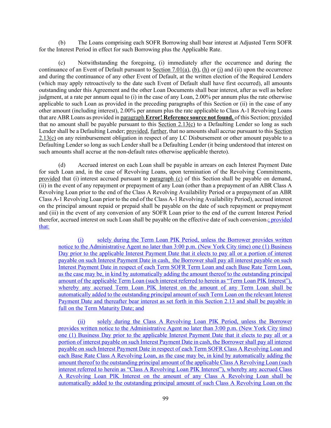 167 (d) pay any interest on any Loan in cash unless the Borrower pays interest on all other Loans in cash. Any transaction in violation of the covenants set forth in this Section 6.15 shall be void ab initio. The foregoing covenants in this Section 6.15 are solely for the benefit of the Class A Revolving Lenders and may only be waived, amended or modified by the Required Class A Revolving Lenders, with the consent of the Borrower and the Required Lenders. ARTICLE VII EVENTS OF DEFAULT SECTION 7.01 Events of Default. If any of the following events (any such event, an “Event of Default”) shall occur: (a) The Borrower shall fail to pay any principal of any Loan or any reimbursement obligations in respect of Letters of Credit when and as the same shall become due and payable hereunder, whether at the due date thereof or at a date fixed for prepayment thereof or otherwise; (b) any Loan Party shall fail to pay any interest on any Loan or any fee or any other amount (other than an amount referred to in clause (a) of this Section) payable under any Loan Document, when and as the same shall become due and payable hereunder, and such failure shall continue unremedied for a period of five Business Days; (c) any representation or warranty made or deemed made by or on behalf of Holdings, the Borrower or any Restricted Subsidiary in or in connection with any Loan Document or any amendment or modification thereof or waiver thereunder, or in any report, certificate, financial statement or other document furnished pursuant to or in connection with any Loan Document or any amendment or modification thereof or waiver thereunder, shall prove to have been incorrect in any material respect when made or deemed made; (d) Holdings, the Borrower or any Restricted Subsidiary shall fail to observe or perform any covenant, condition or agreement contained in Section 5.01(a), 5.01(b), 5.01(c), 5.01(e) (and, with respect to each of the foregoing, such failure shall continue unremedied for a period of two (2) Business Days), 5.02(a), 5.04 (with respect to the existence of the Borrower), 5.08(c), 5.11, 5.12(c), 5.14, 5.16, 5.17, 5.18 or in Article VI; it being understood and agreed that any Event of Default under Section 6.13(a) and Section 6.13(b) (a “Financial Maintenance Covenant Event of Default”) is subject to cure as provided in Section 7.02 and, so long as the Borrower has a right to exercise the Cure Right with respect to the applicable quarter, a Financial Maintenance Covenant Event of Default shall not occur until the expiration of the tenth Business Day subsequent to the date on which the financial statements with respect to the applicable fiscal quarter (or the fiscal year ended on the last day of such fiscal quarter) are required to be delivered pursuant to Section 5.01(a) or Section 5.01(b), as applicable, and then only to the extent that the Cure Amount (in an amount sufficient to comply with the applicable Financial Maintenance Covenant for such period or fiscal quarter, as applicable) has not been received on or prior to such date; (e) any Loan Party shall fail to observe or perform any covenant, condition or agreement contained in any Loan Document (other than those specified in clause (a), (b) or (d) of this Section), and such failure shall continue unremedied for a period of 30 days after the earlier of (i) the date written notice thereof is received by the Borrower from the Administrative Agent or (ii) actual knowledge thereof of a Responsible Officer of the Borrower;