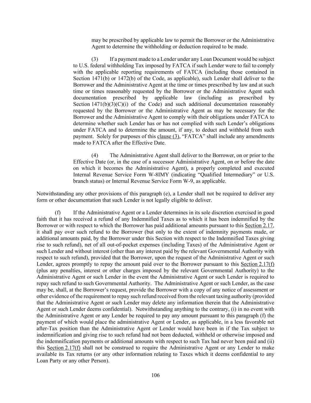 106 may be prescribed by applicable law to permit the Borrower or the Administrative Agent to determine the withholding or deduction required to be made. (3) If a payment made to a Lender under any Loan Document would be subject to U.S. federal withholding Tax imposed by FATCA if such Lender were to fail to comply with the applicable reporting requirements of FATCA (including those contained in Section 1471(b) or 1472(b) of the Code, as applicable), such Lender shall deliver to the Borrower and the Administrative Agent at the time or times prescribed by law and at such time or times reasonably requested by the Borrower or the Administrative Agent such documentation prescribed by applicable law (including as prescribed by Section 1471(b)(3)(C)(i) of the Code) and such additional documentation reasonably requested by the Borrower or the Administrative Agent as may be necessary for the Borrower and the Administrative Agent to comply with their obligations under FATCA to determine whether such Lender has or has not complied with such Lender’s obligations under FATCA and to determine the amount, if any, to deduct and withhold from such payment. Solely for purposes of this clause (3), “FATCA” shall include any amendments made to FATCA after the Effective Date. (4) The Administrative Agent shall deliver to the Borrower, on or prior to the Effective Date (or, in the case of a successor Administrative Agent, on or before the date on which it becomes the Administrative Agent), a properly completed and executed Internal Revenue Service Form W-8IMY (indicating “Qualified Intermediary” or U.S. branch status) or Internal Revenue Service Form W-9, as applicable. Notwithstanding any other provisions of this paragraph (e), a Lender shall not be required to deliver any form or other documentation that such Lender is not legally eligible to deliver. (f) If the Administrative Agent or a Lender determines in its sole discretion exercised in good faith that it has received a refund of any Indemnified Taxes as to which it has been indemnified by the Borrower or with respect to which the Borrower has paid additional amounts pursuant to this Section 2.17, it shall pay over such refund to the Borrower (but only to the extent of indemnity payments made, or additional amounts paid, by the Borrower under this Section with respect to the Indemnified Taxes giving rise to such refund), net of all out-of-pocket expenses (including Taxes) of the Administrative Agent or such Lender and without interest (other than any interest paid by the relevant Governmental Authority with respect to such refund), provided that the Borrower, upon the request of the Administrative Agent or such Lender, agrees promptly to repay the amount paid over to the Borrower pursuant to this Section 2.17(f) (plus any penalties, interest or other charges imposed by the relevant Governmental Authority) to the Administrative Agent or such Lender in the event the Administrative Agent or such Lender is required to repay such refund to such Governmental Authority. The Administrative Agent or such Lender, as the case may be, shall, at the Borrower’s request, provide the Borrower with a copy of any notice of assessment or other evidence of the requirement to repay such refund received from the relevant taxing authority (provided that the Administrative Agent or such Lender may delete any information therein that the Administrative Agent or such Lender deems confidential). Notwithstanding anything to the contrary, (i) in no event with the Administrative Agent or any Lender be required to pay any amount pursuant to this paragraph (f) the payment of which would place the administrative Agent or Lender, as applicable, in a less favorable net after-Tax position than the Administrative Agent or Lender would have been in if the Tax subject to indemnification and giving rise to such refund had not been deducted, withheld or otherwise imposed and the indemnification payments or additional amounts with respect to such Tax had never been paid and (ii) this Section 2.17(f) shall not be construed to require the Administrative Agent or any Lender to make available its Tax returns (or any other information relating to Taxes which it deems confidential to any Loan Party or any other Person).