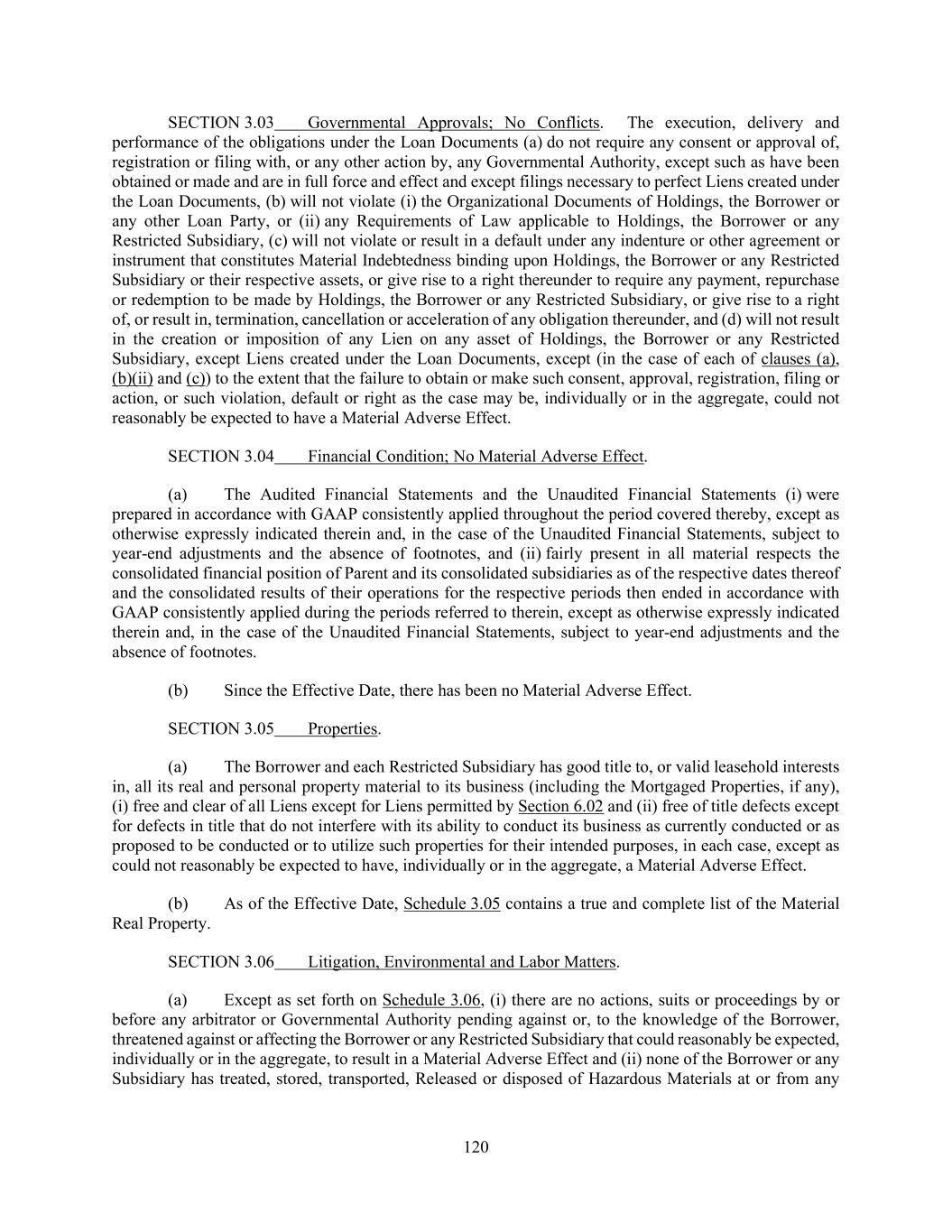 120 SECTION 3.03 Governmental Approvals; No Conflicts. The execution, delivery and performance of the obligations under the Loan Documents (a) do not require any consent or approval of, registration or filing with, or any other action by, any Governmental Authority, except such as have been obtained or made and are in full force and effect and except filings necessary to perfect Liens created under the Loan Documents, (b) will not violate (i) the Organizational Documents of Holdings, the Borrower or any other Loan Party, or (ii) any Requirements of Law applicable to Holdings, the Borrower or any Restricted Subsidiary, (c) will not violate or result in a default under any indenture or other agreement or instrument that constitutes Material Indebtedness binding upon Holdings, the Borrower or any Restricted Subsidiary or their respective assets, or give rise to a right thereunder to require any payment, repurchase or redemption to be made by Holdings, the Borrower or any Restricted Subsidiary, or give rise to a right of, or result in, termination, cancellation or acceleration of any obligation thereunder, and (d) will not result in the creation or imposition of any Lien on any asset of Holdings, the Borrower or any Restricted Subsidiary, except Liens created under the Loan Documents, except (in the case of each of clauses (a), (b)(ii) and (c)) to the extent that the failure to obtain or make such consent, approval, registration, filing or action, or such violation, default or right as the case may be, individually or in the aggregate, could not reasonably be expected to have a Material Adverse Effect. SECTION 3.04 Financial Condition; No Material Adverse Effect. (a) The Audited Financial Statements and the Unaudited Financial Statements (i) were prepared in accordance with GAAP consistently applied throughout the period covered thereby, except as otherwise expressly indicated therein and, in the case of the Unaudited Financial Statements, subject to year-end adjustments and the absence of footnotes, and (ii) fairly present in all material respects the consolidated financial position of Parent and its consolidated subsidiaries as of the respective dates thereof and the consolidated results of their operations for the respective periods then ended in accordance with GAAP consistently applied during the periods referred to therein, except as otherwise expressly indicated therein and, in the case of the Unaudited Financial Statements, subject to year-end adjustments and the absence of footnotes. (b) Since the Effective Date, there has been no Material Adverse Effect. SECTION 3.05 Properties. (a) The Borrower and each Restricted Subsidiary has good title to, or valid leasehold interests in, all its real and personal property material to its business (including the Mortgaged Properties, if any), (i) free and clear of all Liens except for Liens permitted by Section 6.02 and (ii) free of title defects except for defects in title that do not interfere with its ability to conduct its business as currently conducted or as proposed to be conducted or to utilize such properties for their intended purposes, in each case, except as could not reasonably be expected to have, individually or in the aggregate, a Material Adverse Effect. (b) As of the Effective Date, Schedule 3.05 contains a true and complete list of the Material Real Property. SECTION 3.06 Litigation, Environmental and Labor Matters. (a) Except as set forth on Schedule 3.06, (i) there are no actions, suits or proceedings by or before any arbitrator or Governmental Authority pending against or, to the knowledge of the Borrower, threatened against or affecting the Borrower or any Restricted Subsidiary that could reasonably be expected, individually or in the aggregate, to result in a Material Adverse Effect and (ii) none of the Borrower or any Subsidiary has treated, stored, transported, Released or disposed of Hazardous Materials at or from any