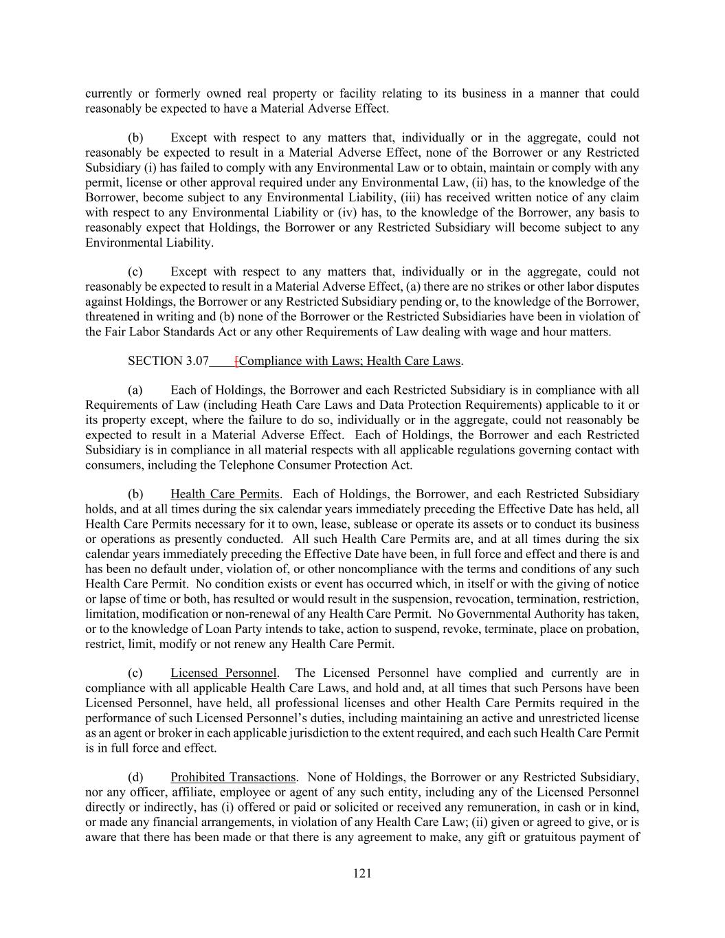 121 currently or formerly owned real property or facility relating to its business in a manner that could reasonably be expected to have a Material Adverse Effect. (b) Except with respect to any matters that, individually or in the aggregate, could not reasonably be expected to result in a Material Adverse Effect, none of the Borrower or any Restricted Subsidiary (i) has failed to comply with any Environmental Law or to obtain, maintain or comply with any permit, license or other approval required under any Environmental Law, (ii) has, to the knowledge of the Borrower, become subject to any Environmental Liability, (iii) has received written notice of any claim with respect to any Environmental Liability or (iv) has, to the knowledge of the Borrower, any basis to reasonably expect that Holdings, the Borrower or any Restricted Subsidiary will become subject to any Environmental Liability. (c) Except with respect to any matters that, individually or in the aggregate, could not reasonably be expected to result in a Material Adverse Effect, (a) there are no strikes or other labor disputes against Holdings, the Borrower or any Restricted Subsidiary pending or, to the knowledge of the Borrower, threatened in writing and (b) none of the Borrower or the Restricted Subsidiaries have been in violation of the Fair Labor Standards Act or any other Requirements of Law dealing with wage and hour matters. SECTION 3.07 [Compliance with Laws; Health Care Laws. (a) Each of Holdings, the Borrower and each Restricted Subsidiary is in compliance with all Requirements of Law (including Heath Care Laws and Data Protection Requirements) applicable to it or its property except, where the failure to do so, individually or in the aggregate, could not reasonably be expected to result in a Material Adverse Effect. Each of Holdings, the Borrower and each Restricted Subsidiary is in compliance in all material respects with all applicable regulations governing contact with consumers, including the Telephone Consumer Protection Act. (b) Health Care Permits. Each of Holdings, the Borrower, and each Restricted Subsidiary holds, and at all times during the six calendar years immediately preceding the Effective Date has held, all Health Care Permits necessary for it to own, lease, sublease or operate its assets or to conduct its business or operations as presently conducted. All such Health Care Permits are, and at all times during the six calendar years immediately preceding the Effective Date have been, in full force and effect and there is and has been no default under, violation of, or other noncompliance with the terms and conditions of any such Health Care Permit. No condition exists or event has occurred which, in itself or with the giving of notice or lapse of time or both, has resulted or would result in the suspension, revocation, termination, restriction, limitation, modification or non-renewal of any Health Care Permit. No Governmental Authority has taken, or to the knowledge of Loan Party intends to take, action to suspend, revoke, terminate, place on probation, restrict, limit, modify or not renew any Health Care Permit. (c) Licensed Personnel. The Licensed Personnel have complied and currently are in compliance with all applicable Health Care Laws, and hold and, at all times that such Persons have been Licensed Personnel, have held, all professional licenses and other Health Care Permits required in the performance of such Licensed Personnel’s duties, including maintaining an active and unrestricted license as an agent or broker in each applicable jurisdiction to the extent required, and each such Health Care Permit is in full force and effect. (d) Prohibited Transactions. None of Holdings, the Borrower or any Restricted Subsidiary, nor any officer, affiliate, employee or agent of any such entity, including any of the Licensed Personnel directly or indirectly, has (i) offered or paid or solicited or received any remuneration, in cash or in kind, or made any financial arrangements, in violation of any Health Care Law; (ii) given or agreed to give, or is aware that there has been made or that there is any agreement to make, any gift or gratuitous payment of