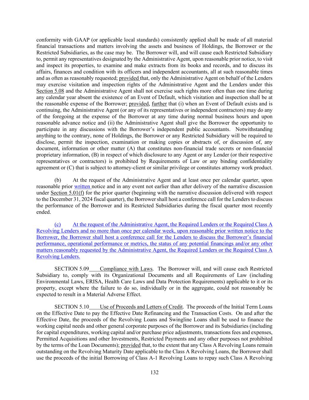 132 conformity with GAAP (or applicable local standards) consistently applied shall be made of all material financial transactions and matters involving the assets and business of Holdings, the Borrower or the Restricted Subsidiaries, as the case may be. The Borrower will, and will cause each Restricted Subsidiary to, permit any representatives designated by the Administrative Agent, upon reasonable prior notice, to visit and inspect its properties, to examine and make extracts from its books and records, and to discuss its affairs, finances and condition with its officers and independent accountants, all at such reasonable times and as often as reasonably requested; provided that, only the Administrative Agent on behalf of the Lenders may exercise visitation and inspection rights of the Administrative Agent and the Lenders under this Section 5.08 and the Administrative Agent shall not exercise such rights more often than one time during any calendar year absent the existence of an Event of Default, which visitation and inspection shall be at the reasonable expense of the Borrower; provided, further that (i) when an Event of Default exists and is continuing, the Administrative Agent (or any of its representatives or independent contractors) may do any of the foregoing at the expense of the Borrower at any time during normal business hours and upon reasonable advance notice and (ii) the Administrative Agent shall give the Borrower the opportunity to participate in any discussions with the Borrower’s independent public accountants. Notwithstanding anything to the contrary, none of Holdings, the Borrower or any Restricted Subsidiary will be required to disclose, permit the inspection, examination or making copies or abstracts of, or discussion of, any document, information or other matter (A) that constitutes non-financial trade secrets or non-financial proprietary information, (B) in respect of which disclosure to any Agent or any Lender (or their respective representatives or contractors) is prohibited by Requirements of Law or any binding confidentiality agreement or (C) that is subject to attorney-client or similar privilege or constitutes attorney work product. (b) At the request of the Administrative Agent and at least once per calendar quarter, upon reasonable prior written notice and in any event not earlier than after delivery of the narrative discussion under Section 5.01(f) for the prior quarter (beginning with the narrative discussion delivered with respect to the December 31, 2024 fiscal quarter), the Borrower shall host a conference call for the Lenders to discuss the performance of the Borrower and its Restricted Subsidiaries during the fiscal quarter most recently ended. (c) At the request of the Administrative Agent, the Required Lenders or the Required Class A Revolving Lenders and no more than once per calendar week, upon reasonable prior written notice to the Borrower, the Borrower shall host a conference call for the Lenders to discuss the Borrower’s financial performance, operational performance or metrics, the status of any potential financings and/or any other matters reasonably requested by the Administrative Agent, the Required Lenders or the Required Class A Revolving Lenders. SECTION 5.09 Compliance with Laws. The Borrower will, and will cause each Restricted Subsidiary to, comply with its Organizational Documents and all Requirements of Law (including Environmental Laws, ERISA, Health Care Laws and Data Protection Requirements) applicable to it or its property, except where the failure to do so, individually or in the aggregate, could not reasonably be expected to result in a Material Adverse Effect. SECTION 5.10 Use of Proceeds and Letters of Credit. The proceeds of the Initial Term Loans on the Effective Date to pay the Effective Date Refinancing and the Transaction Costs. On and after the Effective Date, the proceeds of the Revolving Loans and Swingline Loans shall be used to finance the working capital needs and other general corporate purposes of the Borrower and its Subsidiaries (including for capital expenditures, working capital and/or purchase price adjustments, transactions fees and expenses, Permitted Acquisitions and other Investments, Restricted Payments and any other purposes not prohibited by the terms of the Loan Documents); provided that, to the extent that any Class A Revolving Loans remain outstanding on the Revolving Maturity Date applicable to the Class A Revolving Loans, the Borrower shall use the proceeds of the initial Borrowing of Class A-1 Revolving Loans to repay such Class A Revolving