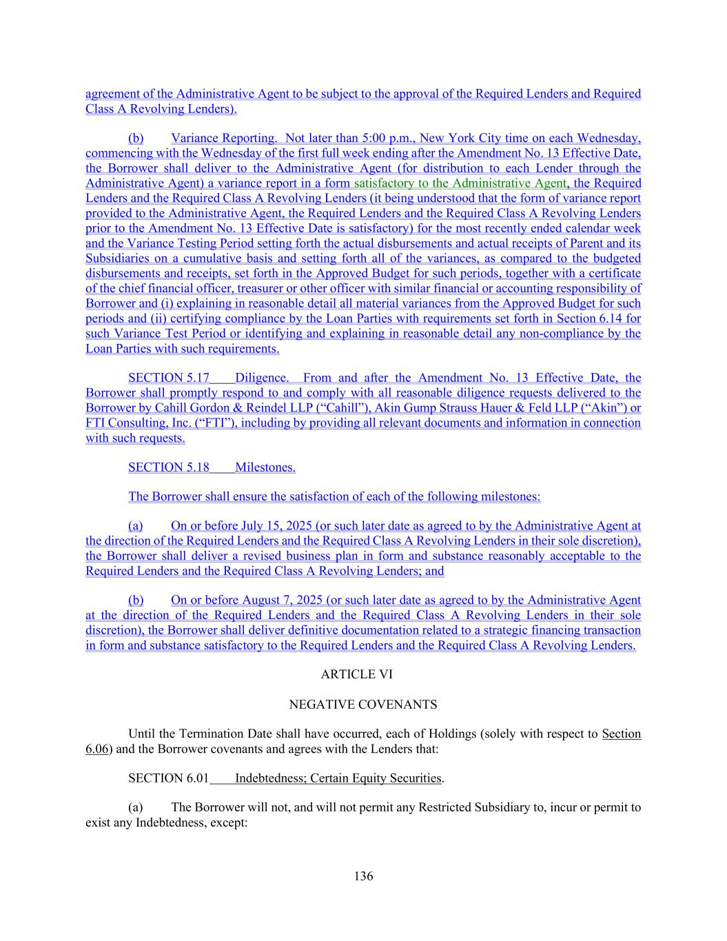 136 agreement of the Administrative Agent to be subject to the approval of the Required Lenders and Required Class A Revolving Lenders). (b) Variance Reporting. Not later than 5:00 p.m., New York City time on each Wednesday, commencing with the Wednesday of the first full week ending after the Amendment No. 13 Effective Date, the Borrower shall deliver to the Administrative Agent (for distribution to each Lender through the Administrative Agent) a variance report in a form satisfactory to the Administrative Agent, the Required Lenders and the Required Class A Revolving Lenders (it being understood that the form of variance report provided to the Administrative Agent, the Required Lenders and the Required Class A Revolving Lenders prior to the Amendment No. 13 Effective Date is satisfactory) for the most recently ended calendar week and the Variance Testing Period setting forth the actual disbursements and actual receipts of Parent and its Subsidiaries on a cumulative basis and setting forth all of the variances, as compared to the budgeted disbursements and receipts, set forth in the Approved Budget for such periods, together with a certificate of the chief financial officer, treasurer or other officer with similar financial or accounting responsibility of Borrower and (i) explaining in reasonable detail all material variances from the Approved Budget for such periods and (ii) certifying compliance by the Loan Parties with requirements set forth in Section 6.14 for such Variance Test Period or identifying and explaining in reasonable detail any non-compliance by the Loan Parties with such requirements. SECTION 5.17 Diligence. From and after the Amendment No. 13 Effective Date, the Borrower shall promptly respond to and comply with all reasonable diligence requests delivered to the Borrower by Cahill Gordon & Reindel LLP (“Cahill”), Akin Gump Strauss Hauer & Feld LLP (“Akin”) or FTI Consulting, Inc. (“FTI”), including by providing all relevant documents and information in connection with such requests. SECTION 5.18 Milestones. The Borrower shall ensure the satisfaction of each of the following milestones: (a) On or before July 15, 2025 (or such later date as agreed to by the Administrative Agent at the direction of the Required Lenders and the Required Class A Revolving Lenders in their sole discretion), the Borrower shall deliver a revised business plan in form and substance reasonably acceptable to the Required Lenders and the Required Class A Revolving Lenders; and (b) On or before August 7, 2025 (or such later date as agreed to by the Administrative Agent at the direction of the Required Lenders and the Required Class A Revolving Lenders in their sole discretion), the Borrower shall deliver definitive documentation related to a strategic financing transaction in form and substance satisfactory to the Required Lenders and the Required Class A Revolving Lenders. ARTICLE VI NEGATIVE COVENANTS Until the Termination Date shall have occurred, each of Holdings (solely with respect to Section 6.06) and the Borrower covenants and agrees with the Lenders that: SECTION 6.01 Indebtedness; Certain Equity Securities. (a) The Borrower will not, and will not permit any Restricted Subsidiary to, incur or permit to exist any Indebtedness, except: