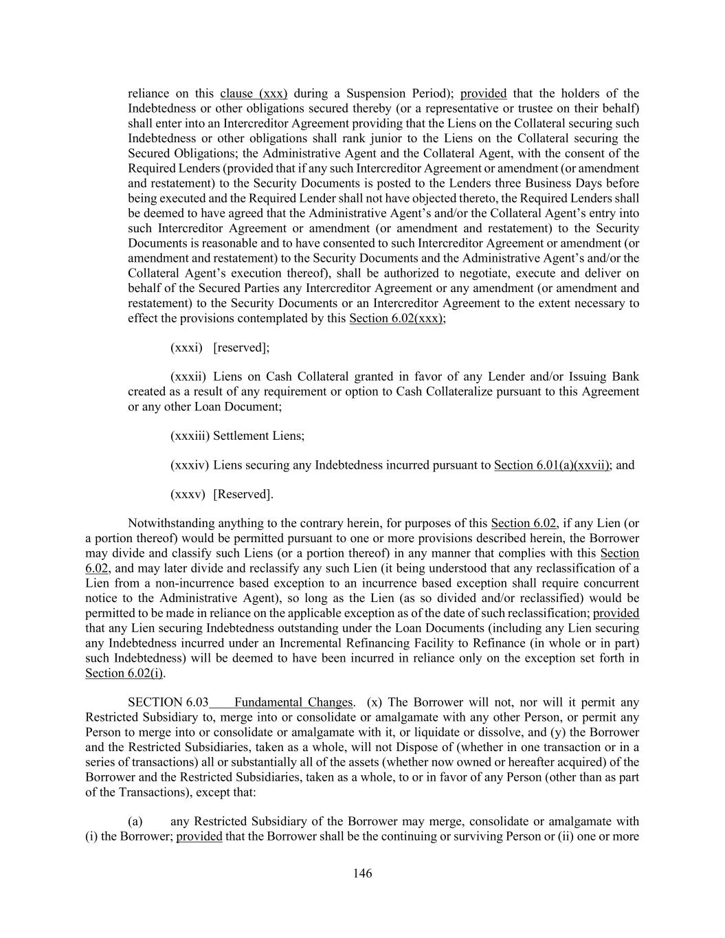 146 reliance on this clause (xxx) during a Suspension Period); provided that the holders of the Indebtedness or other obligations secured thereby (or a representative or trustee on their behalf) shall enter into an Intercreditor Agreement providing that the Liens on the Collateral securing such Indebtedness or other obligations shall rank junior to the Liens on the Collateral securing the Secured Obligations; the Administrative Agent and the Collateral Agent, with the consent of the Required Lenders (provided that if any such Intercreditor Agreement or amendment (or amendment and restatement) to the Security Documents is posted to the Lenders three Business Days before being executed and the Required Lender shall not have objected thereto, the Required Lenders shall be deemed to have agreed that the Administrative Agent’s and/or the Collateral Agent’s entry into such Intercreditor Agreement or amendment (or amendment and restatement) to the Security Documents is reasonable and to have consented to such Intercreditor Agreement or amendment (or amendment and restatement) to the Security Documents and the Administrative Agent’s and/or the Collateral Agent’s execution thereof), shall be authorized to negotiate, execute and deliver on behalf of the Secured Parties any Intercreditor Agreement or any amendment (or amendment and restatement) to the Security Documents or an Intercreditor Agreement to the extent necessary to effect the provisions contemplated by this Section 6.02(xxx); (xxxi) [reserved]; (xxxii) Liens on Cash Collateral granted in favor of any Lender and/or Issuing Bank created as a result of any requirement or option to Cash Collateralize pursuant to this Agreement or any other Loan Document; (xxxiii) Settlement Liens; (xxxiv) Liens securing any Indebtedness incurred pursuant to Section 6.01(a)(xxvii); and (xxxv) [Reserved]. Notwithstanding anything to the contrary herein, for purposes of this Section 6.02, if any Lien (or a portion thereof) would be permitted pursuant to one or more provisions described herein, the Borrower may divide and classify such Liens (or a portion thereof) in any manner that complies with this Section 6.02, and may later divide and reclassify any such Lien (it being understood that any reclassification of a Lien from a non-incurrence based exception to an incurrence based exception shall require concurrent notice to the Administrative Agent), so long as the Lien (as so divided and/or reclassified) would be permitted to be made in reliance on the applicable exception as of the date of such reclassification; provided that any Lien securing Indebtedness outstanding under the Loan Documents (including any Lien securing any Indebtedness incurred under an Incremental Refinancing Facility to Refinance (in whole or in part) such Indebtedness) will be deemed to have been incurred in reliance only on the exception set forth in Section 6.02(i). SECTION 6.03 Fundamental Changes. (x) The Borrower will not, nor will it permit any Restricted Subsidiary to, merge into or consolidate or amalgamate with any other Person, or permit any Person to merge into or consolidate or amalgamate with it, or liquidate or dissolve, and (y) the Borrower and the Restricted Subsidiaries, taken as a whole, will not Dispose of (whether in one transaction or in a series of transactions) all or substantially all of the assets (whether now owned or hereafter acquired) of the Borrower and the Restricted Subsidiaries, taken as a whole, to or in favor of any Person (other than as part of the Transactions), except that: (a) any Restricted Subsidiary of the Borrower may merge, consolidate or amalgamate with (i) the Borrower; provided that the Borrower shall be the continuing or surviving Person or (ii) one or more