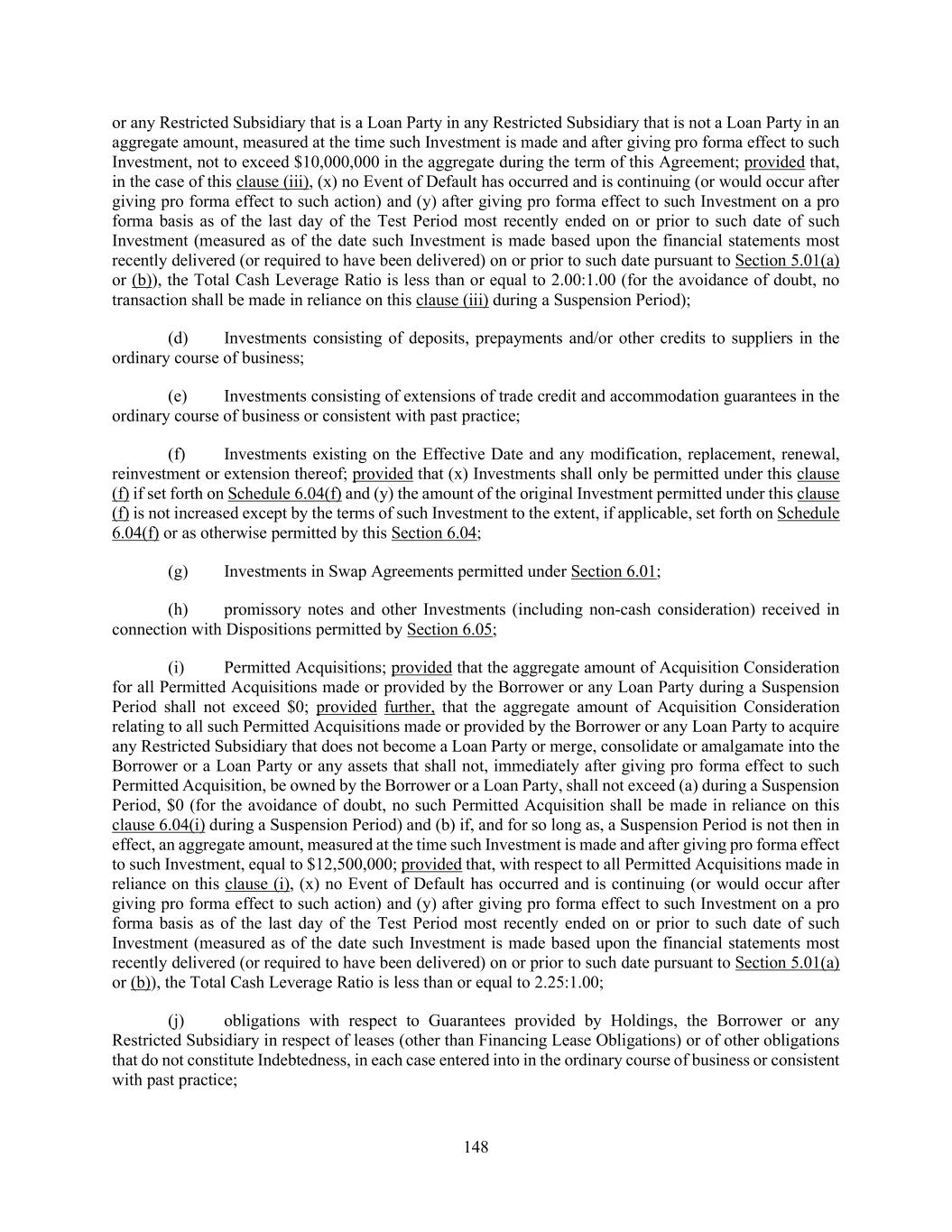 148 or any Restricted Subsidiary that is a Loan Party in any Restricted Subsidiary that is not a Loan Party in an aggregate amount, measured at the time such Investment is made and after giving pro forma effect to such Investment, not to exceed $10,000,000 in the aggregate during the term of this Agreement; provided that, in the case of this clause (iii), (x) no Event of Default has occurred and is continuing (or would occur after giving pro forma effect to such action) and (y) after giving pro forma effect to such Investment on a pro forma basis as of the last day of the Test Period most recently ended on or prior to such date of such Investment (measured as of the date such Investment is made based upon the financial statements most recently delivered (or required to have been delivered) on or prior to such date pursuant to Section 5.01(a) or (b)), the Total Cash Leverage Ratio is less than or equal to 2.00:1.00 (for the avoidance of doubt, no transaction shall be made in reliance on this clause (iii) during a Suspension Period); (d) Investments consisting of deposits, prepayments and/or other credits to suppliers in the ordinary course of business; (e) Investments consisting of extensions of trade credit and accommodation guarantees in the ordinary course of business or consistent with past practice; (f) Investments existing on the Effective Date and any modification, replacement, renewal, reinvestment or extension thereof; provided that (x) Investments shall only be permitted under this clause (f) if set forth on Schedule 6.04(f) and (y) the amount of the original Investment permitted under this clause (f) is not increased except by the terms of such Investment to the extent, if applicable, set forth on Schedule 6.04(f) or as otherwise permitted by this Section 6.04; (g) Investments in Swap Agreements permitted under Section 6.01; (h) promissory notes and other Investments (including non-cash consideration) received in connection with Dispositions permitted by Section 6.05; (i) Permitted Acquisitions; provided that the aggregate amount of Acquisition Consideration for all Permitted Acquisitions made or provided by the Borrower or any Loan Party during a Suspension Period shall not exceed $0; provided further, that the aggregate amount of Acquisition Consideration relating to all such Permitted Acquisitions made or provided by the Borrower or any Loan Party to acquire any Restricted Subsidiary that does not become a Loan Party or merge, consolidate or amalgamate into the Borrower or a Loan Party or any assets that shall not, immediately after giving pro forma effect to such Permitted Acquisition, be owned by the Borrower or a Loan Party, shall not exceed (a) during a Suspension Period, $0 (for the avoidance of doubt, no such Permitted Acquisition shall be made in reliance on this clause 6.04(i) during a Suspension Period) and (b) if, and for so long as, a Suspension Period is not then in effect, an aggregate amount, measured at the time such Investment is made and after giving pro forma effect to such Investment, equal to $12,500,000; provided that, with respect to all Permitted Acquisitions made in reliance on this clause (i), (x) no Event of Default has occurred and is continuing (or would occur after giving pro forma effect to such action) and (y) after giving pro forma effect to such Investment on a pro forma basis as of the last day of the Test Period most recently ended on or prior to such date of such Investment (measured as of the date such Investment is made based upon the financial statements most recently delivered (or required to have been delivered) on or prior to such date pursuant to Section 5.01(a) or (b)), the Total Cash Leverage Ratio is less than or equal to 2.25:1.00; (j) obligations with respect to Guarantees provided by Holdings, the Borrower or any Restricted Subsidiary in respect of leases (other than Financing Lease Obligations) or of other obligations that do not constitute Indebtedness, in each case entered into in the ordinary course of business or consistent with past practice;