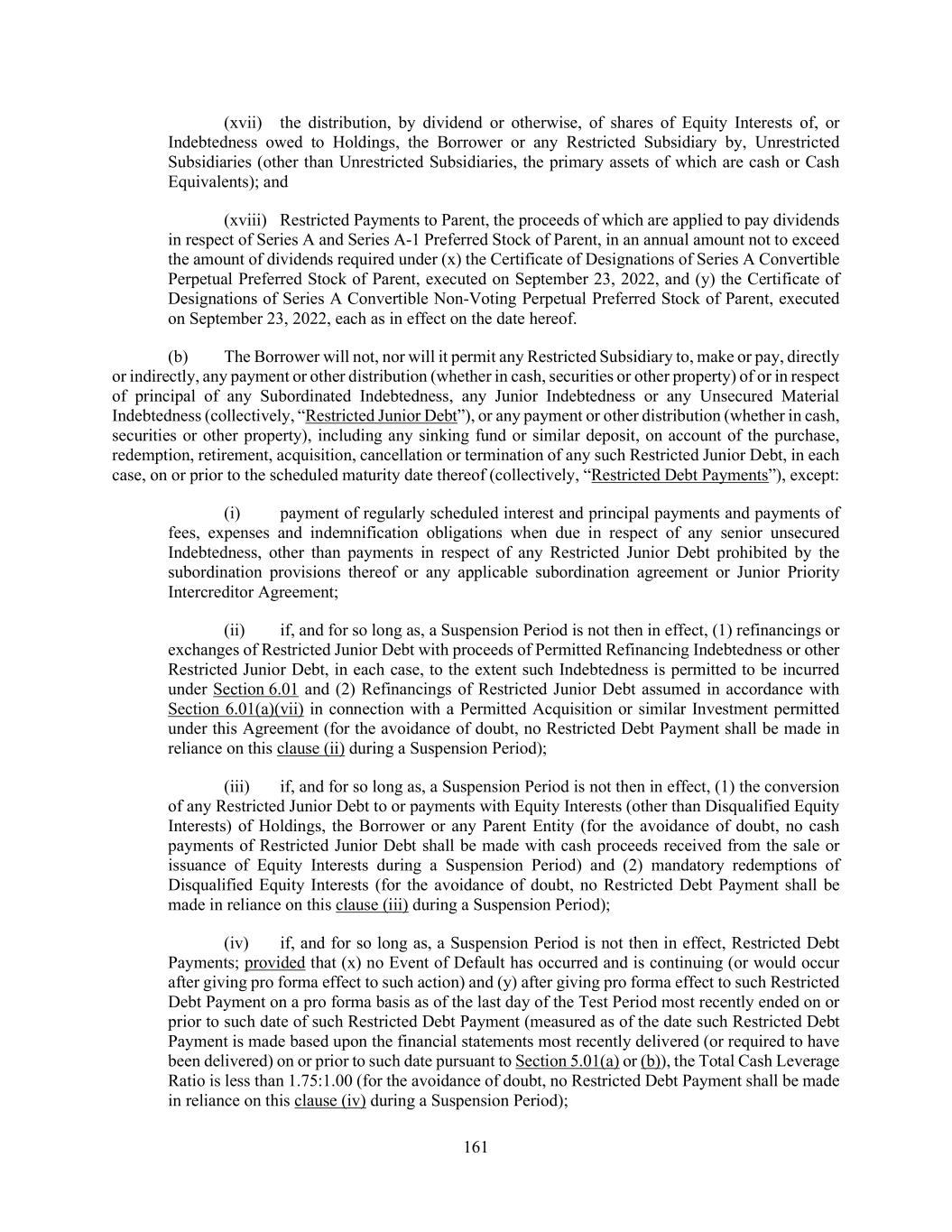 161 (xvii) the distribution, by dividend or otherwise, of shares of Equity Interests of, or Indebtedness owed to Holdings, the Borrower or any Restricted Subsidiary by, Unrestricted Subsidiaries (other than Unrestricted Subsidiaries, the primary assets of which are cash or Cash Equivalents); and (xviii) Restricted Payments to Parent, the proceeds of which are applied to pay dividends in respect of Series A and Series A-1 Preferred Stock of Parent, in an annual amount not to exceed the amount of dividends required under (x) the Certificate of Designations of Series A Convertible Perpetual Preferred Stock of Parent, executed on September 23, 2022, and (y) the Certificate of Designations of Series A Convertible Non-Voting Perpetual Preferred Stock of Parent, executed on September 23, 2022, each as in effect on the date hereof. (b) The Borrower will not, nor will it permit any Restricted Subsidiary to, make or pay, directly or indirectly, any payment or other distribution (whether in cash, securities or other property) of or in respect of principal of any Subordinated Indebtedness, any Junior Indebtedness or any Unsecured Material Indebtedness (collectively, “Restricted Junior Debt”), or any payment or other distribution (whether in cash, securities or other property), including any sinking fund or similar deposit, on account of the purchase, redemption, retirement, acquisition, cancellation or termination of any such Restricted Junior Debt, in each case, on or prior to the scheduled maturity date thereof (collectively, “Restricted Debt Payments”), except: (i) payment of regularly scheduled interest and principal payments and payments of fees, expenses and indemnification obligations when due in respect of any senior unsecured Indebtedness, other than payments in respect of any Restricted Junior Debt prohibited by the subordination provisions thereof or any applicable subordination agreement or Junior Priority Intercreditor Agreement; (ii) if, and for so long as, a Suspension Period is not then in effect, (1) refinancings or exchanges of Restricted Junior Debt with proceeds of Permitted Refinancing Indebtedness or other Restricted Junior Debt, in each case, to the extent such Indebtedness is permitted to be incurred under Section 6.01 and (2) Refinancings of Restricted Junior Debt assumed in accordance with Section 6.01(a)(vii) in connection with a Permitted Acquisition or similar Investment permitted under this Agreement (for the avoidance of doubt, no Restricted Debt Payment shall be made in reliance on this clause (ii) during a Suspension Period); (iii) if, and for so long as, a Suspension Period is not then in effect, (1) the conversion of any Restricted Junior Debt to or payments with Equity Interests (other than Disqualified Equity Interests) of Holdings, the Borrower or any Parent Entity (for the avoidance of doubt, no cash payments of Restricted Junior Debt shall be made with cash proceeds received from the sale or issuance of Equity Interests during a Suspension Period) and (2) mandatory redemptions of Disqualified Equity Interests (for the avoidance of doubt, no Restricted Debt Payment shall be made in reliance on this clause (iii) during a Suspension Period); (iv) if, and for so long as, a Suspension Period is not then in effect, Restricted Debt Payments; provided that (x) no Event of Default has occurred and is continuing (or would occur after giving pro forma effect to such action) and (y) after giving pro forma effect to such Restricted Debt Payment on a pro forma basis as of the last day of the Test Period most recently ended on or prior to such date of such Restricted Debt Payment (measured as of the date such Restricted Debt Payment is made based upon the financial statements most recently delivered (or required to have been delivered) on or prior to such date pursuant to Section 5.01(a) or (b)), the Total Cash Leverage Ratio is less than 1.75:1.00 (for the avoidance of doubt, no Restricted Debt Payment shall be made in reliance on this clause (iv) during a Suspension Period);