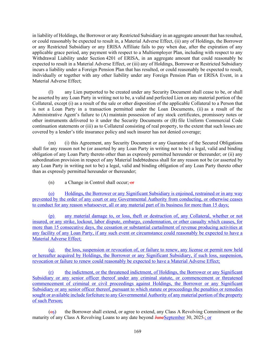 169 in liability of Holdings, the Borrower or any Restricted Subsidiary in an aggregate amount that has resulted, or could reasonably be expected to result in, a Material Adverse Effect, (ii) any of Holdings, the Borrower or any Restricted Subsidiary or any ERISA Affiliate fails to pay when due, after the expiration of any applicable grace period, any payment with respect to a Multiemployer Plan, including with respect to any Withdrawal Liability under Section 4201 of ERISA, in an aggregate amount that could reasonably be expected to result in a Material Adverse Effect, or (iii) any of Holdings, Borrower or Restricted Subsidiary incurs a liability under a Foreign Pension Plan that has resulted, or could reasonably be expected to result, individually or together with any other liability under any Foreign Pension Plan or ERISA Event, in a Material Adverse Effect; (l) any Lien purported to be created under any Security Document shall cease to be, or shall be asserted by any Loan Party in writing not to be, a valid and perfected Lien on any material portion of the Collateral, except (i) as a result of the sale or other disposition of the applicable Collateral to a Person that is not a Loan Party in a transaction permitted under the Loan Documents, (ii) as a result of the Administrative Agent’s failure to (A) maintain possession of any stock certificates, promissory notes or other instruments delivered to it under the Security Documents or (B) file Uniform Commercial Code continuation statements or (iii) as to Collateral consisting of real property, to the extent that such losses are covered by a lender’s title insurance policy and such insurer has not denied coverage; (m) (i) this Agreement, any Security Document or any Guarantee of the Secured Obligations shall for any reason not be (or asserted by any Loan Party in writing not to be) a legal, valid and binding obligation of any Loan Party thereto other than as expressly permitted hereunder or thereunder; or (ii) any subordination provision in respect of any Material Indebtedness shall for any reason not be (or asserted by any Loan Party in writing not to be) a legal, valid and binding obligation of any Loan Party thereto other than as expressly permitted hereunder or thereunder; (n) a Change in Control shall occur; or (o) Holdings, the Borrower or any Significant Subsidiary is enjoined, restrained or in any way prevented by the order of any court or any Governmental Authority from conducting, or otherwise ceases to conduct for any reason whatsoever, all or any material part of its business for more than 15 days; (p) any material damage to, or loss, theft or destruction of, any Collateral, whether or not insured, or any strike, lockout, labor dispute, embargo, condemnation, or other casualty which causes, for more than 15 consecutive days, the cessation or substantial curtailment of revenue producing activities at any facility of any Loan Party, if any such event or circumstance could reasonably be expected to have a Material Adverse Effect; (q) the loss, suspension or revocation of, or failure to renew, any license or permit now held or hereafter acquired by Holdings, the Borrower or any Significant Subsidiary, if such loss, suspension, revocation or failure to renew could reasonably be expected to have a Material Adverse Effect; (r) the indictment, or the threatened indictment, of Holdings, the Borrower or any Significant Subsidiary or any senior officer thereof under any criminal statute, or commencement or threatened commencement of criminal or civil proceedings against Holdings, the Borrower or any Significant Subsidiary or any senior officer thereof, pursuant to which statute or proceedings the penalties or remedies sought or available include forfeiture to any Governmental Authority of any material portion of the property of such Person; (os) the Borrower shall extend, or agree to extend, any Class A Revolving Commitment or the maturity of any Class A Revolving Loans to any date beyond JuneSeptember 30, 2025.; or