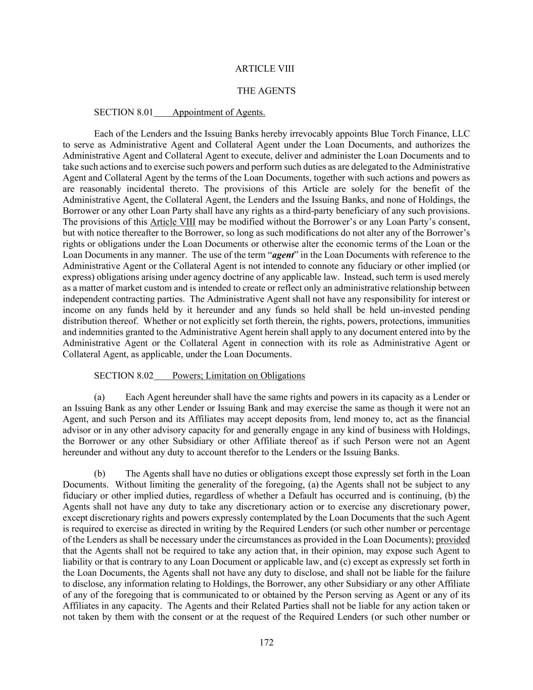172 ARTICLE VIII THE AGENTS SECTION 8.01 Appointment of Agents. Each of the Lenders and the Issuing Banks hereby irrevocably appoints Blue Torch Finance, LLC to serve as Administrative Agent and Collateral Agent under the Loan Documents, and authorizes the Administrative Agent and Collateral Agent to execute, deliver and administer the Loan Documents and to take such actions and to exercise such powers and perform such duties as are delegated to the Administrative Agent and Collateral Agent by the terms of the Loan Documents, together with such actions and powers as are reasonably incidental thereto. The provisions of this Article are solely for the benefit of the Administrative Agent, the Collateral Agent, the Lenders and the Issuing Banks, and none of Holdings, the Borrower or any other Loan Party shall have any rights as a third-party beneficiary of any such provisions. The provisions of this Article VIII may be modified without the Borrower’s or any Loan Party’s consent, but with notice thereafter to the Borrower, so long as such modifications do not alter any of the Borrower’s rights or obligations under the Loan Documents or otherwise alter the economic terms of the Loan or the Loan Documents in any manner. The use of the term “agent” in the Loan Documents with reference to the Administrative Agent or the Collateral Agent is not intended to connote any fiduciary or other implied (or express) obligations arising under agency doctrine of any applicable law. Instead, such term is used merely as a matter of market custom and is intended to create or reflect only an administrative relationship between independent contracting parties. The Administrative Agent shall not have any responsibility for interest or income on any funds held by it hereunder and any funds so held shall be held un-invested pending distribution thereof. Whether or not explicitly set forth therein, the rights, powers, protections, immunities and indemnities granted to the Administrative Agent herein shall apply to any document entered into by the Administrative Agent or the Collateral Agent in connection with its role as Administrative Agent or Collateral Agent, as applicable, under the Loan Documents. SECTION 8.02 Powers; Limitation on Obligations (a) Each Agent hereunder shall have the same rights and powers in its capacity as a Lender or an Issuing Bank as any other Lender or Issuing Bank and may exercise the same as though it were not an Agent, and such Person and its Affiliates may accept deposits from, lend money to, act as the financial advisor or in any other advisory capacity for and generally engage in any kind of business with Holdings, the Borrower or any other Subsidiary or other Affiliate thereof as if such Person were not an Agent hereunder and without any duty to account therefor to the Lenders or the Issuing Banks. (b) The Agents shall have no duties or obligations except those expressly set forth in the Loan Documents. Without limiting the generality of the foregoing, (a) the Agents shall not be subject to any fiduciary or other implied duties, regardless of whether a Default has occurred and is continuing, (b) the Agents shall not have any duty to take any discretionary action or to exercise any discretionary power, except discretionary rights and powers expressly contemplated by the Loan Documents that the such Agent is required to exercise as directed in writing by the Required Lenders (or such other number or percentage of the Lenders as shall be necessary under the circumstances as provided in the Loan Documents); provided that the Agents shall not be required to take any action that, in their opinion, may expose such Agent to liability or that is contrary to any Loan Document or applicable law, and (c) except as expressly set forth in the Loan Documents, the Agents shall not have any duty to disclose, and shall not be liable for the failure to disclose, any information relating to Holdings, the Borrower, any other Subsidiary or any other Affiliate of any of the foregoing that is communicated to or obtained by the Person serving as Agent or any of its Affiliates in any capacity. The Agents and their Related Parties shall not be liable for any action taken or not taken by them with the consent or at the request of the Required Lenders (or such other number or