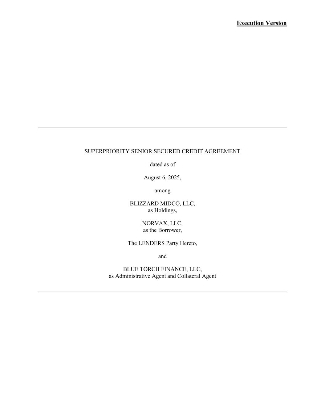 Execution Version SUPERPRIORITY SENIOR SECURED CREDIT AGREEMENT dated as of August 6, 2025, among BLIZZARD MIDCO, LLC, as Holdings, NORVAX, LLC, as the Borrower, The LENDERS Party Hereto, and BLUE TORCH FINANCE, LLC, as Administrative Agent and Collateral Agent