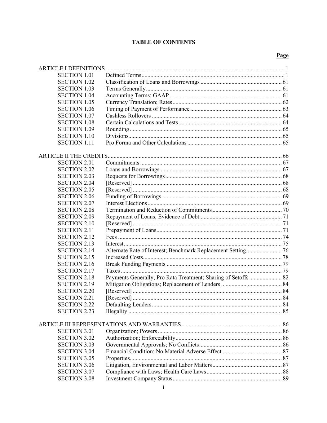 i TABLE OF CONTENTS Page ARTICLE I DEFINITIONS ......................................................................................................................... 1 SECTION 1.01 Defined Terms ................................................................................................. 1 SECTION 1.02 Classification of Loans and Borrowings ....................................................... 61 SECTION 1.03 Terms Generally ............................................................................................ 61 SECTION 1.04 Accounting Terms; GAAP ............................................................................ 61 SECTION 1.05 Currency Translation; Rates .......................................................................... 62 SECTION 1.06 Timing of Payment of Performance .............................................................. 63 SECTION 1.07 Cashless Rollovers ........................................................................................ 64 SECTION 1.08 Certain Calculations and Tests ...................................................................... 64 SECTION 1.09 Rounding ....................................................................................................... 65 SECTION 1.10 Divisions........................................................................................................ 65 SECTION 1.11 Pro Forma and Other Calculations ................................................................ 65 ARTICLE II THE CREDITS ...................................................................................................................... 66 SECTION 2.01 Commitments ................................................................................................ 67 SECTION 2.02 Loans and Borrowings .................................................................................. 67 SECTION 2.03 Requests for Borrowings ............................................................................... 68 SECTION 2.04 [Reserved] ..................................................................................................... 68 SECTION 2.05 [Reserved] ..................................................................................................... 68 SECTION 2.06 Funding of Borrowings ................................................................................. 69 SECTION 2.07 Interest Elections ........................................................................................... 69 SECTION 2.08 Termination and Reduction of Commitments ............................................... 70 SECTION 2.09 Repayment of Loans; Evidence of Debt ........................................................ 71 SECTION 2.10 [Reserved] ..................................................................................................... 71 SECTION 2.11 Prepayment of Loans ..................................................................................... 71 SECTION 2.12 Fees ............................................................................................................... 74 SECTION 2.13 Interest ........................................................................................................... 75 SECTION 2.14 Alternate Rate of Interest; Benchmark Replacement Setting. ....................... 76 SECTION 2.15 Increased Costs .............................................................................................. 78 SECTION 2.16 Break Funding Payments .............................................................................. 79 SECTION 2.17 Taxes ............................................................................................................. 79 SECTION 2.18 Payments Generally; Pro Rata Treatment; Sharing of Setoffs ...................... 82 SECTION 2.19 Mitigation Obligations; Replacement of Lenders ......................................... 84 SECTION 2.20 [Reserved] ..................................................................................................... 84 SECTION 2.21 [Reserved] ..................................................................................................... 84 SECTION 2.22 Defaulting Lenders ........................................................................................ 84 SECTION 2.23 Illegality ........................................................................................................ 85 ARTICLE III REPRESENTATIONS AND WARRANTIES .................................................................... 86 SECTION 3.01 Organization; Powers .................................................................................... 86 SECTION 3.02 Authorization; Enforceability ........................................................................ 86 SECTION 3.03 Governmental Approvals; No Conflicts ........................................................ 86 SECTION 3.04 Financial Condition; No Material Adverse Effect......................................... 87 SECTION 3.05 Properties ....................................................................................................... 87 SECTION 3.06 Litigation, Environmental and Labor Matters ............................................... 87 SECTION 3.07 Compliance with Laws; Health Care Laws ................................................... 88 SECTION 3.08 Investment Company Status .......................................................................... 89