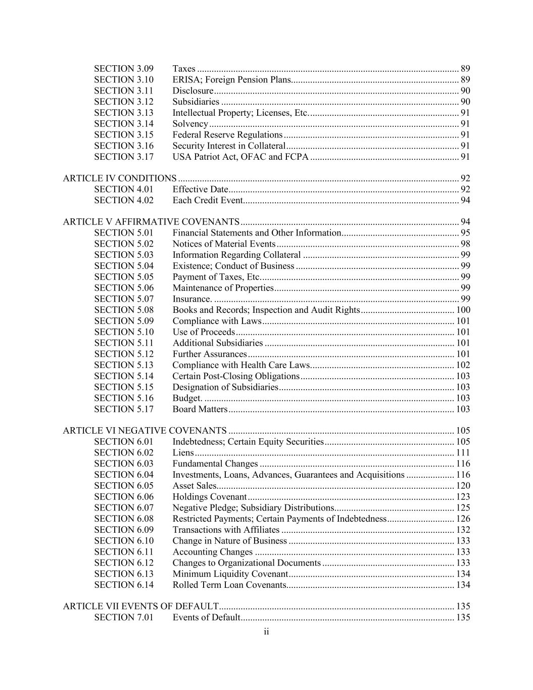 ii SECTION 3.09 Taxes ............................................................................................................. 89 SECTION 3.10 ERISA; Foreign Pension Plans...................................................................... 89 SECTION 3.11 Disclosure ...................................................................................................... 90 SECTION 3.12 Subsidiaries ................................................................................................... 90 SECTION 3.13 Intellectual Property; Licenses, Etc. .............................................................. 91 SECTION 3.14 Solvency ........................................................................................................ 91 SECTION 3.15 Federal Reserve Regulations ......................................................................... 91 SECTION 3.16 Security Interest in Collateral ........................................................................ 91 SECTION 3.17 USA Patriot Act, OFAC and FCPA .............................................................. 91 ARTICLE IV CONDITIONS ..................................................................................................................... 92 SECTION 4.01 Effective Date ................................................................................................ 92 SECTION 4.02 Each Credit Event .......................................................................................... 94 ARTICLE V AFFIRMATIVE COVENANTS ........................................................................................... 94 SECTION 5.01 Financial Statements and Other Information ................................................. 95 SECTION 5.02 Notices of Material Events ............................................................................ 98 SECTION 5.03 Information Regarding Collateral ................................................................. 99 SECTION 5.04 Existence; Conduct of Business .................................................................... 99 SECTION 5.05 Payment of Taxes, Etc. .................................................................................. 99 SECTION 5.06 Maintenance of Properties ............................................................................. 99 SECTION 5.07 Insurance. ...................................................................................................... 99 SECTION 5.08 Books and Records; Inspection and Audit Rights ....................................... 100 SECTION 5.09 Compliance with Laws ................................................................................ 101 SECTION 5.10 Use of Proceeds ........................................................................................... 101 SECTION 5.11 Additional Subsidiaries ............................................................................... 101 SECTION 5.12 Further Assurances ...................................................................................... 101 SECTION 5.13 Compliance with Health Care Laws. ........................................................... 102 SECTION 5.14 Certain Post-Closing Obligations ................................................................ 103 SECTION 5.15 Designation of Subsidiaries ......................................................................... 103 SECTION 5.16 Budget. ........................................................................................................ 103 SECTION 5.17 Board Matters .............................................................................................. 103 ARTICLE VI NEGATIVE COVENANTS .............................................................................................. 105 SECTION 6.01 Indebtedness; Certain Equity Securities ...................................................... 105 SECTION 6.02 Liens ............................................................................................................ 111 SECTION 6.03 Fundamental Changes ................................................................................. 116 SECTION 6.04 Investments, Loans, Advances, Guarantees and Acquisitions .................... 116 SECTION 6.05 Asset Sales................................................................................................... 120 SECTION 6.06 Holdings Covenant ...................................................................................... 123 SECTION 6.07 Negative Pledge; Subsidiary Distributions .................................................. 125 SECTION 6.08 Restricted Payments; Certain Payments of Indebtedness ............................ 126 SECTION 6.09 Transactions with Affiliates ........................................................................ 132 SECTION 6.10 Change in Nature of Business ..................................................................... 133 SECTION 6.11 Accounting Changes ................................................................................... 133 SECTION 6.12 Changes to Organizational Documents ....................................................... 133 SECTION 6.13 Minimum Liquidity Covenant ..................................................................... 134 SECTION 6.14 Rolled Term Loan Covenants...................................................................... 134 ARTICLE VII EVENTS OF DEFAULT .................................................................................................. 135 SECTION 7.01 Events of Default ......................................................................................... 135