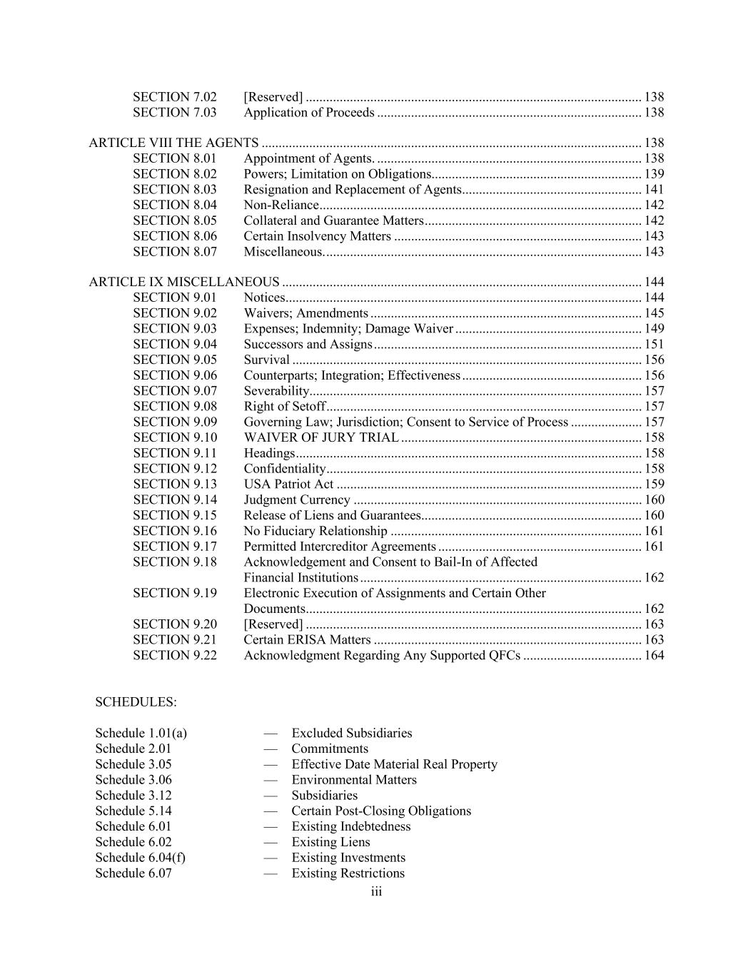 iii SECTION 7.02 [Reserved] ................................................................................................... 138 SECTION 7.03 Application of Proceeds .............................................................................. 138 ARTICLE VIII THE AGENTS ................................................................................................................ 138 SECTION 8.01 Appointment of Agents. .............................................................................. 138 SECTION 8.02 Powers; Limitation on Obligations.............................................................. 139 SECTION 8.03 Resignation and Replacement of Agents ..................................................... 141 SECTION 8.04 Non-Reliance ............................................................................................... 142 SECTION 8.05 Collateral and Guarantee Matters ................................................................ 142 SECTION 8.06 Certain Insolvency Matters ......................................................................... 143 SECTION 8.07 Miscellaneous. ............................................................................................. 143 ARTICLE IX MISCELLANEOUS .......................................................................................................... 144 SECTION 9.01 Notices ......................................................................................................... 144 SECTION 9.02 Waivers; Amendments ................................................................................ 145 SECTION 9.03 Expenses; Indemnity; Damage Waiver ....................................................... 149 SECTION 9.04 Successors and Assigns ............................................................................... 151 SECTION 9.05 Survival ....................................................................................................... 156 SECTION 9.06 Counterparts; Integration; Effectiveness ..................................................... 156 SECTION 9.07 Severability.................................................................................................. 157 SECTION 9.08 Right of Setoff ............................................................................................. 157 SECTION 9.09 Governing Law; Jurisdiction; Consent to Service of Process ..................... 157 SECTION 9.10 WAIVER OF JURY TRIAL ....................................................................... 158 SECTION 9.11 Headings ...................................................................................................... 158 SECTION 9.12 Confidentiality ............................................................................................. 158 SECTION 9.13 USA Patriot Act .......................................................................................... 159 SECTION 9.14 Judgment Currency ..................................................................................... 160 SECTION 9.15 Release of Liens and Guarantees ................................................................. 160 SECTION 9.16 No Fiduciary Relationship .......................................................................... 161 SECTION 9.17 Permitted Intercreditor Agreements ............................................................ 161 SECTION 9.18 Acknowledgement and Consent to Bail-In of Affected Financial Institutions ................................................................................... 162 SECTION 9.19 Electronic Execution of Assignments and Certain Other Documents ................................................................................................... 162 SECTION 9.20 [Reserved] ................................................................................................... 163 SECTION 9.21 Certain ERISA Matters ............................................................................... 163 SECTION 9.22 Acknowledgment Regarding Any Supported QFCs ................................... 164 SCHEDULES: Schedule 1.01(a) — Excluded Subsidiaries Schedule 2.01 — Commitments Schedule 3.05 — Effective Date Material Real Property Schedule 3.06 — Environmental Matters Schedule 3.12 — Subsidiaries Schedule 5.14 — Certain Post-Closing Obligations Schedule 6.01 — Existing Indebtedness Schedule 6.02 — Existing Liens Schedule 6.04(f) — Existing Investments Schedule 6.07 — Existing Restrictions