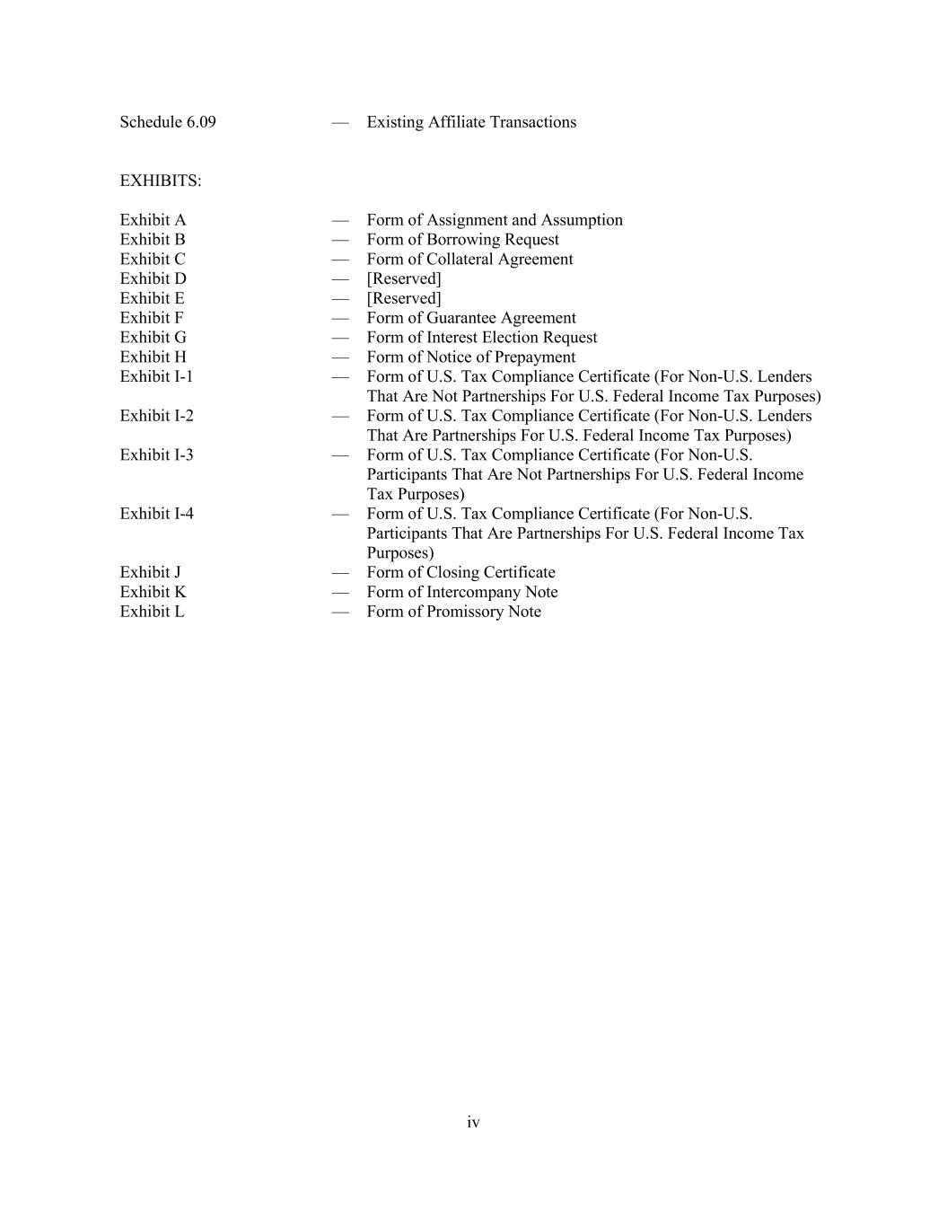 iv Schedule 6.09 — Existing Affiliate Transactions EXHIBITS: Exhibit A — Form of Assignment and Assumption Exhibit B — Form of Borrowing Request Exhibit C — Form of Collateral Agreement Exhibit D — [Reserved] Exhibit E — [Reserved] Exhibit F — Form of Guarantee Agreement Exhibit G — Form of Interest Election Request Exhibit H — Form of Notice of Prepayment Exhibit I-1 — Form of U.S. Tax Compliance Certificate (For Non-U.S. Lenders That Are Not Partnerships For U.S. Federal Income Tax Purposes) Exhibit I-2 — Form of U.S. Tax Compliance Certificate (For Non-U.S. Lenders That Are Partnerships For U.S. Federal Income Tax Purposes) Exhibit I-3 — Form of U.S. Tax Compliance Certificate (For Non-U.S. Participants That Are Not Partnerships For U.S. Federal Income Tax Purposes) Exhibit I-4 — Form of U.S. Tax Compliance Certificate (For Non-U.S. Participants That Are Partnerships For U.S. Federal Income Tax Purposes) Exhibit J — Form of Closing Certificate Exhibit K — Form of Intercompany Note Exhibit L — Form of Promissory Note