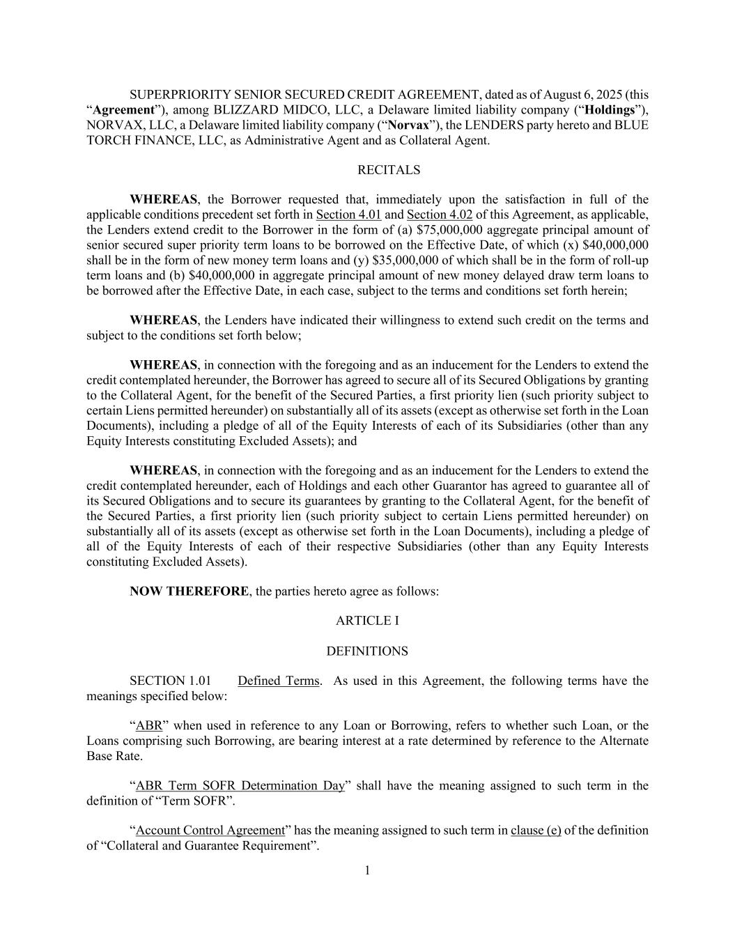 1 SUPERPRIORITY SENIOR SECURED CREDIT AGREEMENT, dated as of August 6, 2025 (this “Agreement”), among BLIZZARD MIDCO, LLC, a Delaware limited liability company (“Holdings”), NORVAX, LLC, a Delaware limited liability company (“Norvax”), the LENDERS party hereto and BLUE TORCH FINANCE, LLC, as Administrative Agent and as Collateral Agent. RECITALS WHEREAS, the Borrower requested that, immediately upon the satisfaction in full of the applicable conditions precedent set forth in Section 4.01 and Section 4.02 of this Agreement, as applicable, the Lenders extend credit to the Borrower in the form of (a) $75,000,000 aggregate principal amount of senior secured super priority term loans to be borrowed on the Effective Date, of which (x) $40,000,000 shall be in the form of new money term loans and (y) $35,000,000 of which shall be in the form of roll-up term loans and (b) $40,000,000 in aggregate principal amount of new money delayed draw term loans to be borrowed after the Effective Date, in each case, subject to the terms and conditions set forth herein; WHEREAS, the Lenders have indicated their willingness to extend such credit on the terms and subject to the conditions set forth below; WHEREAS, in connection with the foregoing and as an inducement for the Lenders to extend the credit contemplated hereunder, the Borrower has agreed to secure all of its Secured Obligations by granting to the Collateral Agent, for the benefit of the Secured Parties, a first priority lien (such priority subject to certain Liens permitted hereunder) on substantially all of its assets (except as otherwise set forth in the Loan Documents), including a pledge of all of the Equity Interests of each of its Subsidiaries (other than any Equity Interests constituting Excluded Assets); and WHEREAS, in connection with the foregoing and as an inducement for the Lenders to extend the credit contemplated hereunder, each of Holdings and each other Guarantor has agreed to guarantee all of its Secured Obligations and to secure its guarantees by granting to the Collateral Agent, for the benefit of the Secured Parties, a first priority lien (such priority subject to certain Liens permitted hereunder) on substantially all of its assets (except as otherwise set forth in the Loan Documents), including a pledge of all of the Equity Interests of each of their respective Subsidiaries (other than any Equity Interests constituting Excluded Assets). NOW THEREFORE, the parties hereto agree as follows: ARTICLE I DEFINITIONS SECTION 1.01 Defined Terms. As used in this Agreement, the following terms have the meanings specified below: “ABR” when used in reference to any Loan or Borrowing, refers to whether such Loan, or the Loans comprising such Borrowing, are bearing interest at a rate determined by reference to the Alternate Base Rate. “ABR Term SOFR Determination Day” shall have the meaning assigned to such term in the definition of “Term SOFR”. “Account Control Agreement” has the meaning assigned to such term in clause (e) of the definition of “Collateral and Guarantee Requirement”.