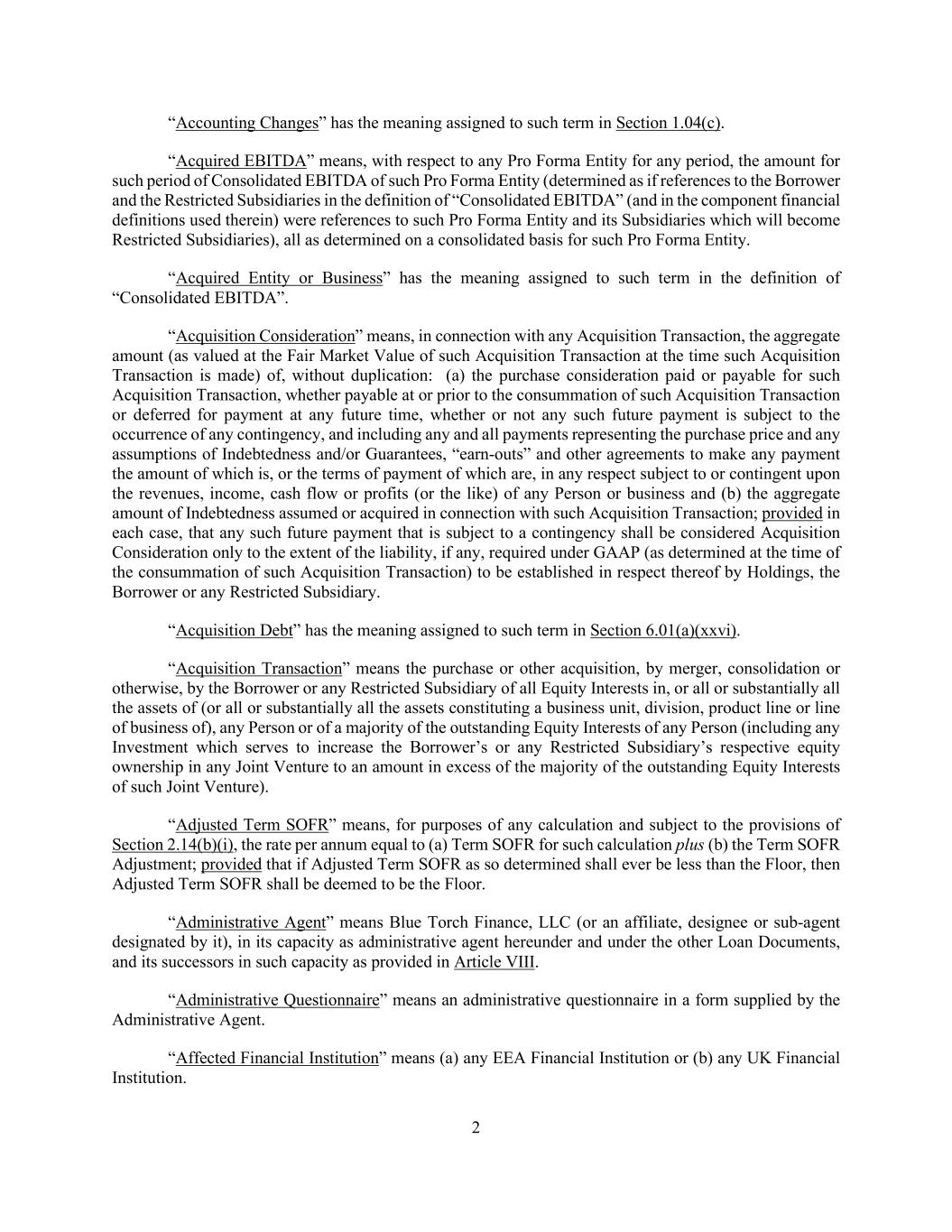 2 “Accounting Changes” has the meaning assigned to such term in Section 1.04(c). “Acquired EBITDA” means, with respect to any Pro Forma Entity for any period, the amount for such period of Consolidated EBITDA of such Pro Forma Entity (determined as if references to the Borrower and the Restricted Subsidiaries in the definition of “Consolidated EBITDA” (and in the component financial definitions used therein) were references to such Pro Forma Entity and its Subsidiaries which will become Restricted Subsidiaries), all as determined on a consolidated basis for such Pro Forma Entity. “Acquired Entity or Business” has the meaning assigned to such term in the definition of “Consolidated EBITDA”. “Acquisition Consideration” means, in connection with any Acquisition Transaction, the aggregate amount (as valued at the Fair Market Value of such Acquisition Transaction at the time such Acquisition Transaction is made) of, without duplication: (a) the purchase consideration paid or payable for such Acquisition Transaction, whether payable at or prior to the consummation of such Acquisition Transaction or deferred for payment at any future time, whether or not any such future payment is subject to the occurrence of any contingency, and including any and all payments representing the purchase price and any assumptions of Indebtedness and/or Guarantees, “earn-outs” and other agreements to make any payment the amount of which is, or the terms of payment of which are, in any respect subject to or contingent upon the revenues, income, cash flow or profits (or the like) of any Person or business and (b) the aggregate amount of Indebtedness assumed or acquired in connection with such Acquisition Transaction; provided in each case, that any such future payment that is subject to a contingency shall be considered Acquisition Consideration only to the extent of the liability, if any, required under GAAP (as determined at the time of the consummation of such Acquisition Transaction) to be established in respect thereof by Holdings, the Borrower or any Restricted Subsidiary. “Acquisition Debt” has the meaning assigned to such term in Section 6.01(a)(xxvi). “Acquisition Transaction” means the purchase or other acquisition, by merger, consolidation or otherwise, by the Borrower or any Restricted Subsidiary of all Equity Interests in, or all or substantially all the assets of (or all or substantially all the assets constituting a business unit, division, product line or line of business of), any Person or of a majority of the outstanding Equity Interests of any Person (including any Investment which serves to increase the Borrower’s or any Restricted Subsidiary’s respective equity ownership in any Joint Venture to an amount in excess of the majority of the outstanding Equity Interests of such Joint Venture). “Adjusted Term SOFR” means, for purposes of any calculation and subject to the provisions of Section 2.14(b)(i), the rate per annum equal to (a) Term SOFR for such calculation plus (b) the Term SOFR Adjustment; provided that if Adjusted Term SOFR as so determined shall ever be less than the Floor, then Adjusted Term SOFR shall be deemed to be the Floor. “Administrative Agent” means Blue Torch Finance, LLC (or an affiliate, designee or sub-agent designated by it), in its capacity as administrative agent hereunder and under the other Loan Documents, and its successors in such capacity as provided in Article VIII. “Administrative Questionnaire” means an administrative questionnaire in a form supplied by the Administrative Agent. “Affected Financial Institution” means (a) any EEA Financial Institution or (b) any UK Financial Institution.