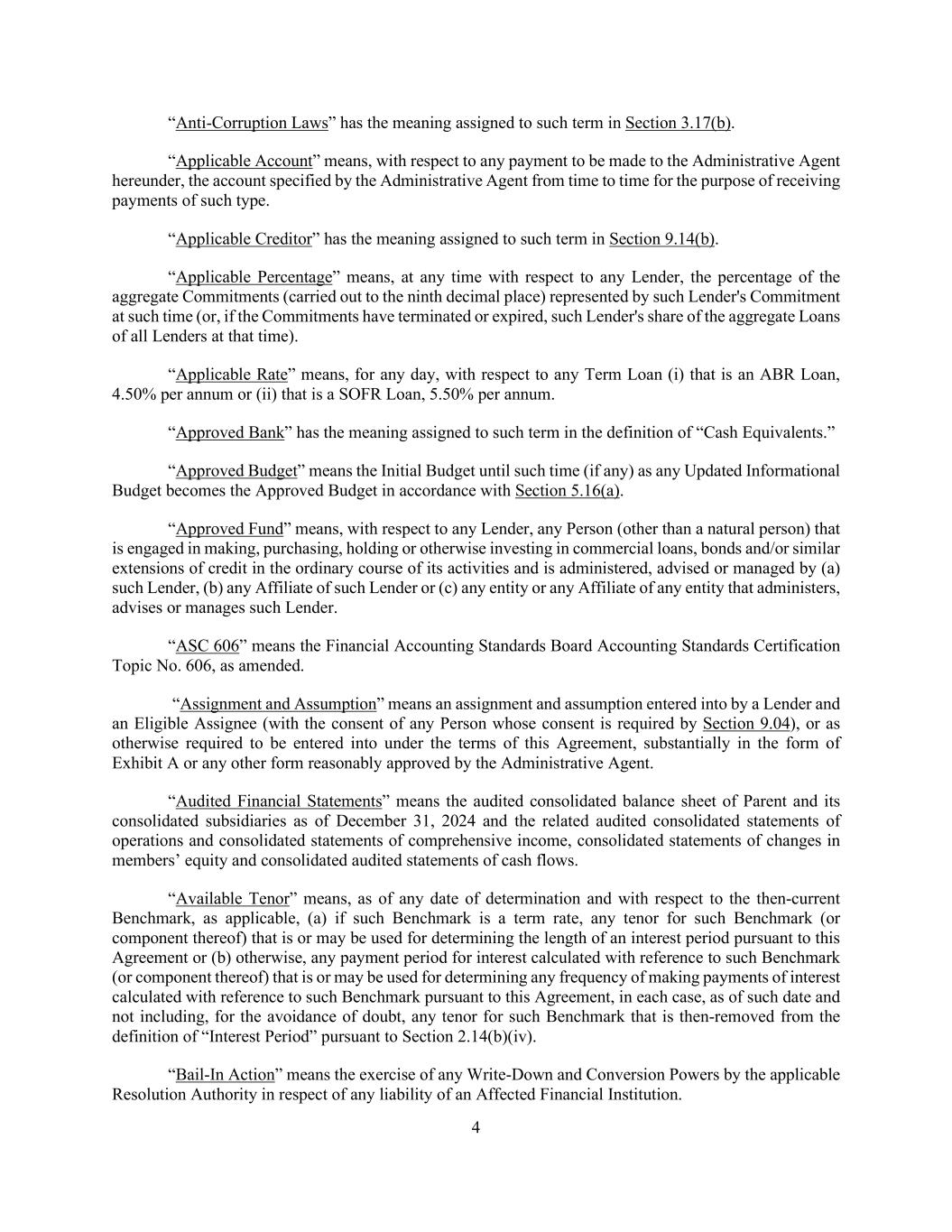 4 “Anti-Corruption Laws” has the meaning assigned to such term in Section 3.17(b). “Applicable Account” means, with respect to any payment to be made to the Administrative Agent hereunder, the account specified by the Administrative Agent from time to time for the purpose of receiving payments of such type. “Applicable Creditor” has the meaning assigned to such term in Section 9.14(b). “Applicable Percentage” means, at any time with respect to any Lender, the percentage of the aggregate Commitments (carried out to the ninth decimal place) represented by such Lender's Commitment at such time (or, if the Commitments have terminated or expired, such Lender's share of the aggregate Loans of all Lenders at that time). “Applicable Rate” means, for any day, with respect to any Term Loan (i) that is an ABR Loan, 4.50% per annum or (ii) that is a SOFR Loan, 5.50% per annum. “Approved Bank” has the meaning assigned to such term in the definition of “Cash Equivalents.” “Approved Budget” means the Initial Budget until such time (if any) as any Updated Informational Budget becomes the Approved Budget in accordance with Section 5.16(a). “Approved Fund” means, with respect to any Lender, any Person (other than a natural person) that is engaged in making, purchasing, holding or otherwise investing in commercial loans, bonds and/or similar extensions of credit in the ordinary course of its activities and is administered, advised or managed by (a) such Lender, (b) any Affiliate of such Lender or (c) any entity or any Affiliate of any entity that administers, advises or manages such Lender. “ASC 606” means the Financial Accounting Standards Board Accounting Standards Certification Topic No. 606, as amended. “Assignment and Assumption” means an assignment and assumption entered into by a Lender and an Eligible Assignee (with the consent of any Person whose consent is required by Section 9.04), or as otherwise required to be entered into under the terms of this Agreement, substantially in the form of Exhibit A or any other form reasonably approved by the Administrative Agent. “Audited Financial Statements” means the audited consolidated balance sheet of Parent and its consolidated subsidiaries as of December 31, 2024 and the related audited consolidated statements of operations and consolidated statements of comprehensive income, consolidated statements of changes in members’ equity and consolidated audited statements of cash flows. “Available Tenor” means, as of any date of determination and with respect to the then-current Benchmark, as applicable, (a) if such Benchmark is a term rate, any tenor for such Benchmark (or component thereof) that is or may be used for determining the length of an interest period pursuant to this Agreement or (b) otherwise, any payment period for interest calculated with reference to such Benchmark (or component thereof) that is or may be used for determining any frequency of making payments of interest calculated with reference to such Benchmark pursuant to this Agreement, in each case, as of such date and not including, for the avoidance of doubt, any tenor for such Benchmark that is then-removed from the definition of “Interest Period” pursuant to Section 2.14(b)(iv). “Bail-In Action” means the exercise of any Write-Down and Conversion Powers by the applicable Resolution Authority in respect of any liability of an Affected Financial Institution.