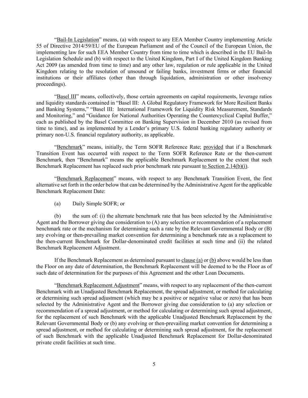 5 “Bail-In Legislation” means, (a) with respect to any EEA Member Country implementing Article 55 of Directive 2014/59/EU of the European Parliament and of the Council of the European Union, the implementing law for such EEA Member Country from time to time which is described in the EU Bail-In Legislation Schedule and (b) with respect to the United Kingdom, Part I of the United Kingdom Banking Act 2009 (as amended from time to time) and any other law, regulation or rule applicable in the United Kingdom relating to the resolution of unsound or failing banks, investment firms or other financial institutions or their affiliates (other than through liquidation, administration or other insolvency proceedings). “Basel III” means, collectively, those certain agreements on capital requirements, leverage ratios and liquidity standards contained in “Basel III: A Global Regulatory Framework for More Resilient Banks and Banking Systems,” “Basel III: International Framework for Liquidity Risk Measurement, Standards and Monitoring,” and “Guidance for National Authorities Operating the Countercyclical Capital Buffer,” each as published by the Basel Committee on Banking Supervision in December 2010 (as revised from time to time), and as implemented by a Lender’s primary U.S. federal banking regulatory authority or primary non-U.S. financial regulatory authority, as applicable. “Benchmark” means, initially, the Term SOFR Reference Rate; provided that if a Benchmark Transition Event has occurred with respect to the Term SOFR Reference Rate or the then-current Benchmark, then “Benchmark” means the applicable Benchmark Replacement to the extent that such Benchmark Replacement has replaced such prior benchmark rate pursuant to Section 2.14(b)(i). “Benchmark Replacement” means, with respect to any Benchmark Transition Event, the first alternative set forth in the order below that can be determined by the Administrative Agent for the applicable Benchmark Replacement Date: (a) Daily Simple SOFR; or (b) the sum of: (i) the alternate benchmark rate that has been selected by the Administrative Agent and the Borrower giving due consideration to (A) any selection or recommendation of a replacement benchmark rate or the mechanism for determining such a rate by the Relevant Governmental Body or (B) any evolving or then-prevailing market convention for determining a benchmark rate as a replacement to the then-current Benchmark for Dollar-denominated credit facilities at such time and (ii) the related Benchmark Replacement Adjustment. If the Benchmark Replacement as determined pursuant to clause (a) or (b) above would be less than the Floor on any date of determination, the Benchmark Replacement will be deemed to be the Floor as of such date of determination for the purposes of this Agreement and the other Loan Documents. “Benchmark Replacement Adjustment” means, with respect to any replacement of the then-current Benchmark with an Unadjusted Benchmark Replacement, the spread adjustment, or method for calculating or determining such spread adjustment (which may be a positive or negative value or zero) that has been selected by the Administrative Agent and the Borrower giving due consideration to (a) any selection or recommendation of a spread adjustment, or method for calculating or determining such spread adjustment, for the replacement of such Benchmark with the applicable Unadjusted Benchmark Replacement by the Relevant Governmental Body or (b) any evolving or then-prevailing market convention for determining a spread adjustment, or method for calculating or determining such spread adjustment, for the replacement of such Benchmark with the applicable Unadjusted Benchmark Replacement for Dollar-denominated private credit facilities at such time.
