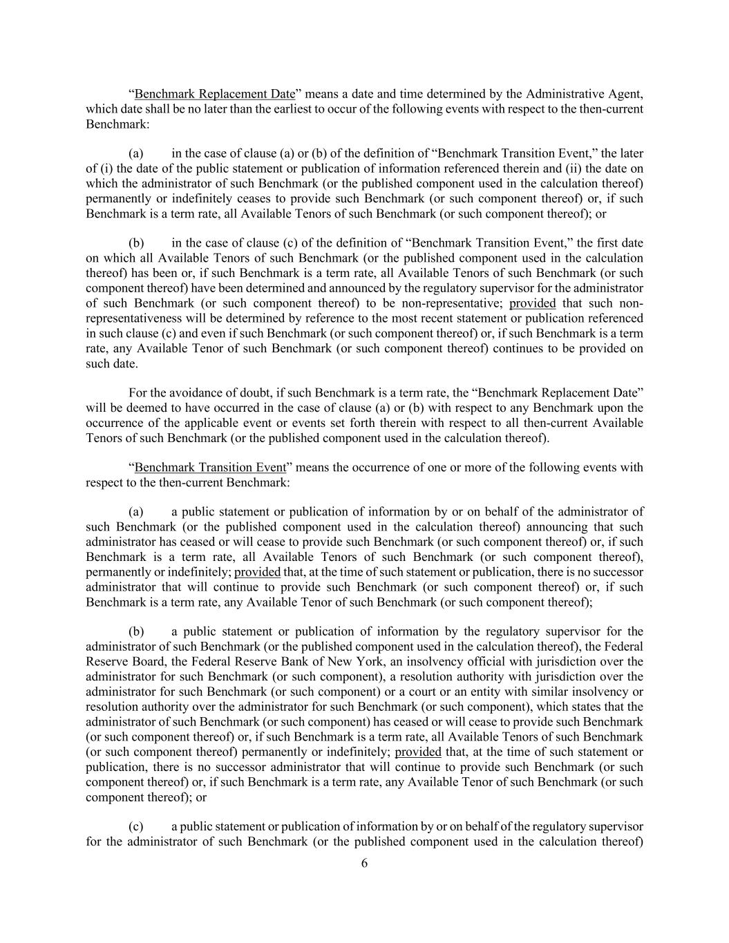 6 “Benchmark Replacement Date” means a date and time determined by the Administrative Agent, which date shall be no later than the earliest to occur of the following events with respect to the then-current Benchmark: (a) in the case of clause (a) or (b) of the definition of “Benchmark Transition Event,” the later of (i) the date of the public statement or publication of information referenced therein and (ii) the date on which the administrator of such Benchmark (or the published component used in the calculation thereof) permanently or indefinitely ceases to provide such Benchmark (or such component thereof) or, if such Benchmark is a term rate, all Available Tenors of such Benchmark (or such component thereof); or (b) in the case of clause (c) of the definition of “Benchmark Transition Event,” the first date on which all Available Tenors of such Benchmark (or the published component used in the calculation thereof) has been or, if such Benchmark is a term rate, all Available Tenors of such Benchmark (or such component thereof) have been determined and announced by the regulatory supervisor for the administrator of such Benchmark (or such component thereof) to be non-representative; provided that such non- representativeness will be determined by reference to the most recent statement or publication referenced in such clause (c) and even if such Benchmark (or such component thereof) or, if such Benchmark is a term rate, any Available Tenor of such Benchmark (or such component thereof) continues to be provided on such date. For the avoidance of doubt, if such Benchmark is a term rate, the “Benchmark Replacement Date” will be deemed to have occurred in the case of clause (a) or (b) with respect to any Benchmark upon the occurrence of the applicable event or events set forth therein with respect to all then-current Available Tenors of such Benchmark (or the published component used in the calculation thereof). “Benchmark Transition Event” means the occurrence of one or more of the following events with respect to the then-current Benchmark: (a) a public statement or publication of information by or on behalf of the administrator of such Benchmark (or the published component used in the calculation thereof) announcing that such administrator has ceased or will cease to provide such Benchmark (or such component thereof) or, if such Benchmark is a term rate, all Available Tenors of such Benchmark (or such component thereof), permanently or indefinitely; provided that, at the time of such statement or publication, there is no successor administrator that will continue to provide such Benchmark (or such component thereof) or, if such Benchmark is a term rate, any Available Tenor of such Benchmark (or such component thereof); (b) a public statement or publication of information by the regulatory supervisor for the administrator of such Benchmark (or the published component used in the calculation thereof), the Federal Reserve Board, the Federal Reserve Bank of New York, an insolvency official with jurisdiction over the administrator for such Benchmark (or such component), a resolution authority with jurisdiction over the administrator for such Benchmark (or such component) or a court or an entity with similar insolvency or resolution authority over the administrator for such Benchmark (or such component), which states that the administrator of such Benchmark (or such component) has ceased or will cease to provide such Benchmark (or such component thereof) or, if such Benchmark is a term rate, all Available Tenors of such Benchmark (or such component thereof) permanently or indefinitely; provided that, at the time of such statement or publication, there is no successor administrator that will continue to provide such Benchmark (or such component thereof) or, if such Benchmark is a term rate, any Available Tenor of such Benchmark (or such component thereof); or (c) a public statement or publication of information by or on behalf of the regulatory supervisor for the administrator of such Benchmark (or the published component used in the calculation thereof)