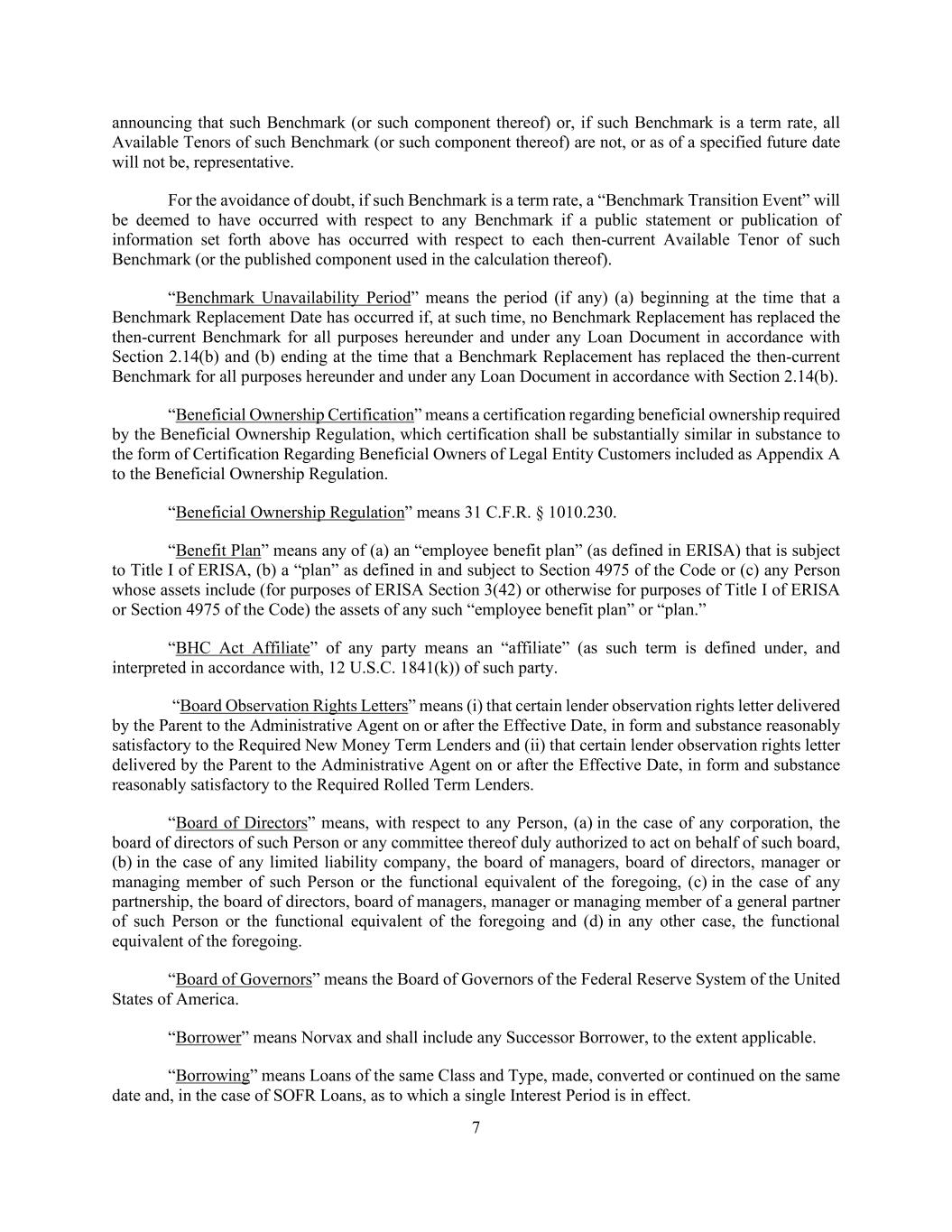 7 announcing that such Benchmark (or such component thereof) or, if such Benchmark is a term rate, all Available Tenors of such Benchmark (or such component thereof) are not, or as of a specified future date will not be, representative. For the avoidance of doubt, if such Benchmark is a term rate, a “Benchmark Transition Event” will be deemed to have occurred with respect to any Benchmark if a public statement or publication of information set forth above has occurred with respect to each then-current Available Tenor of such Benchmark (or the published component used in the calculation thereof). “Benchmark Unavailability Period” means the period (if any) (a) beginning at the time that a Benchmark Replacement Date has occurred if, at such time, no Benchmark Replacement has replaced the then-current Benchmark for all purposes hereunder and under any Loan Document in accordance with Section 2.14(b) and (b) ending at the time that a Benchmark Replacement has replaced the then-current Benchmark for all purposes hereunder and under any Loan Document in accordance with Section 2.14(b). “Beneficial Ownership Certification” means a certification regarding beneficial ownership required by the Beneficial Ownership Regulation, which certification shall be substantially similar in substance to the form of Certification Regarding Beneficial Owners of Legal Entity Customers included as Appendix A to the Beneficial Ownership Regulation. “Beneficial Ownership Regulation” means 31 C.F.R. § 1010.230. “Benefit Plan” means any of (a) an “employee benefit plan” (as defined in ERISA) that is subject to Title I of ERISA, (b) a “plan” as defined in and subject to Section 4975 of the Code or (c) any Person whose assets include (for purposes of ERISA Section 3(42) or otherwise for purposes of Title I of ERISA or Section 4975 of the Code) the assets of any such “employee benefit plan” or “plan.” “BHC Act Affiliate” of any party means an “affiliate” (as such term is defined under, and interpreted in accordance with, 12 U.S.C. 1841(k)) of such party. “Board Observation Rights Letters” means (i) that certain lender observation rights letter delivered by the Parent to the Administrative Agent on or after the Effective Date, in form and substance reasonably satisfactory to the Required New Money Term Lenders and (ii) that certain lender observation rights letter delivered by the Parent to the Administrative Agent on or after the Effective Date, in form and substance reasonably satisfactory to the Required Rolled Term Lenders. “Board of Directors” means, with respect to any Person, (a) in the case of any corporation, the board of directors of such Person or any committee thereof duly authorized to act on behalf of such board, (b) in the case of any limited liability company, the board of managers, board of directors, manager or managing member of such Person or the functional equivalent of the foregoing, (c) in the case of any partnership, the board of directors, board of managers, manager or managing member of a general partner of such Person or the functional equivalent of the foregoing and (d) in any other case, the functional equivalent of the foregoing. “Board of Governors” means the Board of Governors of the Federal Reserve System of the United States of America. “Borrower” means Norvax and shall include any Successor Borrower, to the extent applicable. “Borrowing” means Loans of the same Class and Type, made, converted or continued on the same date and, in the case of SOFR Loans, as to which a single Interest Period is in effect.
