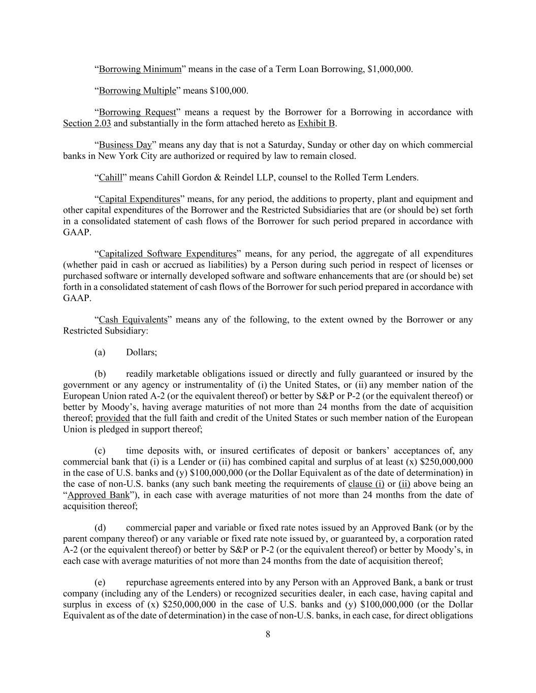 8 “Borrowing Minimum” means in the case of a Term Loan Borrowing, $1,000,000. “Borrowing Multiple” means $100,000. “Borrowing Request” means a request by the Borrower for a Borrowing in accordance with Section 2.03 and substantially in the form attached hereto as Exhibit B. “Business Day” means any day that is not a Saturday, Sunday or other day on which commercial banks in New York City are authorized or required by law to remain closed. “Cahill” means Cahill Gordon & Reindel LLP, counsel to the Rolled Term Lenders. “Capital Expenditures” means, for any period, the additions to property, plant and equipment and other capital expenditures of the Borrower and the Restricted Subsidiaries that are (or should be) set forth in a consolidated statement of cash flows of the Borrower for such period prepared in accordance with GAAP. “Capitalized Software Expenditures” means, for any period, the aggregate of all expenditures (whether paid in cash or accrued as liabilities) by a Person during such period in respect of licenses or purchased software or internally developed software and software enhancements that are (or should be) set forth in a consolidated statement of cash flows of the Borrower for such period prepared in accordance with GAAP. “Cash Equivalents” means any of the following, to the extent owned by the Borrower or any Restricted Subsidiary: (a) Dollars; (b) readily marketable obligations issued or directly and fully guaranteed or insured by the government or any agency or instrumentality of (i) the United States, or (ii) any member nation of the European Union rated A-2 (or the equivalent thereof) or better by S&P or P-2 (or the equivalent thereof) or better by Moody’s, having average maturities of not more than 24 months from the date of acquisition thereof; provided that the full faith and credit of the United States or such member nation of the European Union is pledged in support thereof; (c) time deposits with, or insured certificates of deposit or bankers’ acceptances of, any commercial bank that (i) is a Lender or (ii) has combined capital and surplus of at least (x) $250,000,000 in the case of U.S. banks and (y) $100,000,000 (or the Dollar Equivalent as of the date of determination) in the case of non-U.S. banks (any such bank meeting the requirements of clause (i) or (ii) above being an “Approved Bank”), in each case with average maturities of not more than 24 months from the date of acquisition thereof; (d) commercial paper and variable or fixed rate notes issued by an Approved Bank (or by the parent company thereof) or any variable or fixed rate note issued by, or guaranteed by, a corporation rated A-2 (or the equivalent thereof) or better by S&P or P-2 (or the equivalent thereof) or better by Moody’s, in each case with average maturities of not more than 24 months from the date of acquisition thereof; (e) repurchase agreements entered into by any Person with an Approved Bank, a bank or trust company (including any of the Lenders) or recognized securities dealer, in each case, having capital and surplus in excess of (x) $250,000,000 in the case of U.S. banks and (y) $100,000,000 (or the Dollar Equivalent as of the date of determination) in the case of non-U.S. banks, in each case, for direct obligations