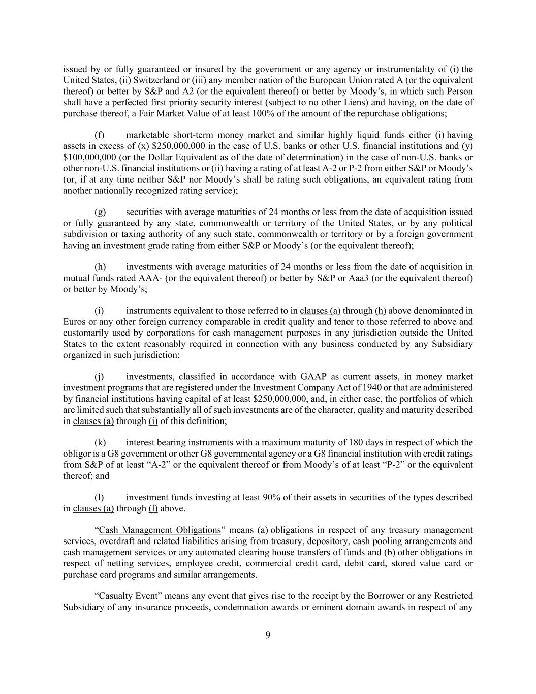 9 issued by or fully guaranteed or insured by the government or any agency or instrumentality of (i) the United States, (ii) Switzerland or (iii) any member nation of the European Union rated A (or the equivalent thereof) or better by S&P and A2 (or the equivalent thereof) or better by Moody’s, in which such Person shall have a perfected first priority security interest (subject to no other Liens) and having, on the date of purchase thereof, a Fair Market Value of at least 100% of the amount of the repurchase obligations; (f) marketable short-term money market and similar highly liquid funds either (i) having assets in excess of (x) $250,000,000 in the case of U.S. banks or other U.S. financial institutions and (y) $100,000,000 (or the Dollar Equivalent as of the date of determination) in the case of non-U.S. banks or other non-U.S. financial institutions or (ii) having a rating of at least A-2 or P-2 from either S&P or Moody’s (or, if at any time neither S&P nor Moody’s shall be rating such obligations, an equivalent rating from another nationally recognized rating service); (g) securities with average maturities of 24 months or less from the date of acquisition issued or fully guaranteed by any state, commonwealth or territory of the United States, or by any political subdivision or taxing authority of any such state, commonwealth or territory or by a foreign government having an investment grade rating from either S&P or Moody’s (or the equivalent thereof); (h) investments with average maturities of 24 months or less from the date of acquisition in mutual funds rated AAA- (or the equivalent thereof) or better by S&P or Aaa3 (or the equivalent thereof) or better by Moody’s; (i) instruments equivalent to those referred to in clauses (a) through (h) above denominated in Euros or any other foreign currency comparable in credit quality and tenor to those referred to above and customarily used by corporations for cash management purposes in any jurisdiction outside the United States to the extent reasonably required in connection with any business conducted by any Subsidiary organized in such jurisdiction; (j) investments, classified in accordance with GAAP as current assets, in money market investment programs that are registered under the Investment Company Act of 1940 or that are administered by financial institutions having capital of at least $250,000,000, and, in either case, the portfolios of which are limited such that substantially all of such investments are of the character, quality and maturity described in clauses (a) through (i) of this definition; (k) interest bearing instruments with a maximum maturity of 180 days in respect of which the obligor is a G8 government or other G8 governmental agency or a G8 financial institution with credit ratings from S&P of at least “A-2” or the equivalent thereof or from Moody’s of at least “P-2” or the equivalent thereof; and (l) investment funds investing at least 90% of their assets in securities of the types described in clauses (a) through (l) above. “Cash Management Obligations” means (a) obligations in respect of any treasury management services, overdraft and related liabilities arising from treasury, depository, cash pooling arrangements and cash management services or any automated clearing house transfers of funds and (b) other obligations in respect of netting services, employee credit, commercial credit card, debit card, stored value card or purchase card programs and similar arrangements. “Casualty Event” means any event that gives rise to the receipt by the Borrower or any Restricted Subsidiary of any insurance proceeds, condemnation awards or eminent domain awards in respect of any