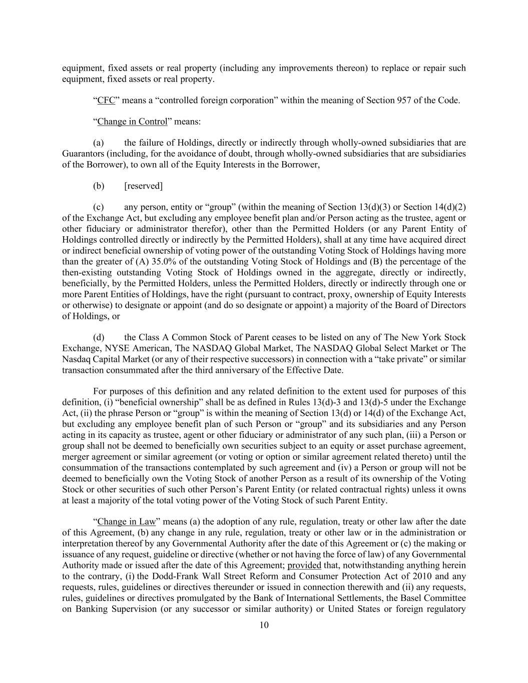 10 equipment, fixed assets or real property (including any improvements thereon) to replace or repair such equipment, fixed assets or real property. “CFC” means a “controlled foreign corporation” within the meaning of Section 957 of the Code. “Change in Control” means: (a) the failure of Holdings, directly or indirectly through wholly-owned subsidiaries that are Guarantors (including, for the avoidance of doubt, through wholly-owned subsidiaries that are subsidiaries of the Borrower), to own all of the Equity Interests in the Borrower, (b) [reserved] (c) any person, entity or “group” (within the meaning of Section 13(d)(3) or Section 14(d)(2) of the Exchange Act, but excluding any employee benefit plan and/or Person acting as the trustee, agent or other fiduciary or administrator therefor), other than the Permitted Holders (or any Parent Entity of Holdings controlled directly or indirectly by the Permitted Holders), shall at any time have acquired direct or indirect beneficial ownership of voting power of the outstanding Voting Stock of Holdings having more than the greater of (A) 35.0% of the outstanding Voting Stock of Holdings and (B) the percentage of the then-existing outstanding Voting Stock of Holdings owned in the aggregate, directly or indirectly, beneficially, by the Permitted Holders, unless the Permitted Holders, directly or indirectly through one or more Parent Entities of Holdings, have the right (pursuant to contract, proxy, ownership of Equity Interests or otherwise) to designate or appoint (and do so designate or appoint) a majority of the Board of Directors of Holdings, or (d) the Class A Common Stock of Parent ceases to be listed on any of The New York Stock Exchange, NYSE American, The NASDAQ Global Market, The NASDAQ Global Select Market or The Nasdaq Capital Market (or any of their respective successors) in connection with a “take private” or similar transaction consummated after the third anniversary of the Effective Date. For purposes of this definition and any related definition to the extent used for purposes of this definition, (i) “beneficial ownership” shall be as defined in Rules 13(d)-3 and 13(d)-5 under the Exchange Act, (ii) the phrase Person or “group” is within the meaning of Section 13(d) or 14(d) of the Exchange Act, but excluding any employee benefit plan of such Person or “group” and its subsidiaries and any Person acting in its capacity as trustee, agent or other fiduciary or administrator of any such plan, (iii) a Person or group shall not be deemed to beneficially own securities subject to an equity or asset purchase agreement, merger agreement or similar agreement (or voting or option or similar agreement related thereto) until the consummation of the transactions contemplated by such agreement and (iv) a Person or group will not be deemed to beneficially own the Voting Stock of another Person as a result of its ownership of the Voting Stock or other securities of such other Person’s Parent Entity (or related contractual rights) unless it owns at least a majority of the total voting power of the Voting Stock of such Parent Entity. “Change in Law” means (a) the adoption of any rule, regulation, treaty or other law after the date of this Agreement, (b) any change in any rule, regulation, treaty or other law or in the administration or interpretation thereof by any Governmental Authority after the date of this Agreement or (c) the making or issuance of any request, guideline or directive (whether or not having the force of law) of any Governmental Authority made or issued after the date of this Agreement; provided that, notwithstanding anything herein to the contrary, (i) the Dodd-Frank Wall Street Reform and Consumer Protection Act of 2010 and any requests, rules, guidelines or directives thereunder or issued in connection therewith and (ii) any requests, rules, guidelines or directives promulgated by the Bank of International Settlements, the Basel Committee on Banking Supervision (or any successor or similar authority) or United States or foreign regulatory