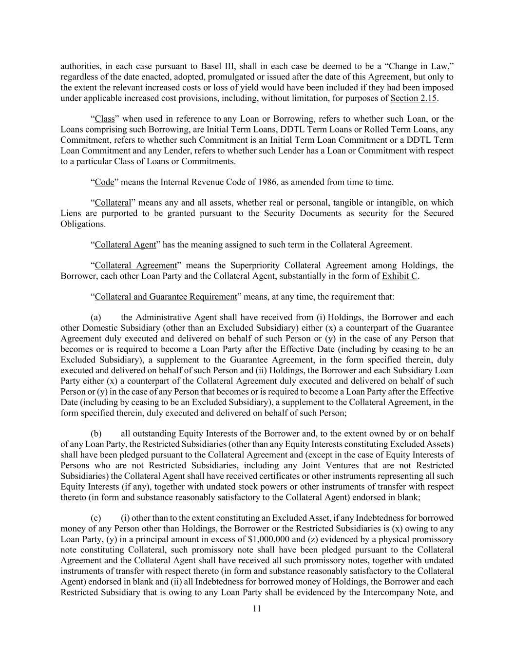 11 authorities, in each case pursuant to Basel III, shall in each case be deemed to be a “Change in Law,” regardless of the date enacted, adopted, promulgated or issued after the date of this Agreement, but only to the extent the relevant increased costs or loss of yield would have been included if they had been imposed under applicable increased cost provisions, including, without limitation, for purposes of Section 2.15. “Class” when used in reference to any Loan or Borrowing, refers to whether such Loan, or the Loans comprising such Borrowing, are Initial Term Loans, DDTL Term Loans or Rolled Term Loans, any Commitment, refers to whether such Commitment is an Initial Term Loan Commitment or a DDTL Term Loan Commitment and any Lender, refers to whether such Lender has a Loan or Commitment with respect to a particular Class of Loans or Commitments. “Code” means the Internal Revenue Code of 1986, as amended from time to time. “Collateral” means any and all assets, whether real or personal, tangible or intangible, on which Liens are purported to be granted pursuant to the Security Documents as security for the Secured Obligations. “Collateral Agent” has the meaning assigned to such term in the Collateral Agreement. “Collateral Agreement” means the Superpriority Collateral Agreement among Holdings, the Borrower, each other Loan Party and the Collateral Agent, substantially in the form of Exhibit C. “Collateral and Guarantee Requirement” means, at any time, the requirement that: (a) the Administrative Agent shall have received from (i) Holdings, the Borrower and each other Domestic Subsidiary (other than an Excluded Subsidiary) either (x) a counterpart of the Guarantee Agreement duly executed and delivered on behalf of such Person or (y) in the case of any Person that becomes or is required to become a Loan Party after the Effective Date (including by ceasing to be an Excluded Subsidiary), a supplement to the Guarantee Agreement, in the form specified therein, duly executed and delivered on behalf of such Person and (ii) Holdings, the Borrower and each Subsidiary Loan Party either (x) a counterpart of the Collateral Agreement duly executed and delivered on behalf of such Person or (y) in the case of any Person that becomes or is required to become a Loan Party after the Effective Date (including by ceasing to be an Excluded Subsidiary), a supplement to the Collateral Agreement, in the form specified therein, duly executed and delivered on behalf of such Person; (b) all outstanding Equity Interests of the Borrower and, to the extent owned by or on behalf of any Loan Party, the Restricted Subsidiaries (other than any Equity Interests constituting Excluded Assets) shall have been pledged pursuant to the Collateral Agreement and (except in the case of Equity Interests of Persons who are not Restricted Subsidiaries, including any Joint Ventures that are not Restricted Subsidiaries) the Collateral Agent shall have received certificates or other instruments representing all such Equity Interests (if any), together with undated stock powers or other instruments of transfer with respect thereto (in form and substance reasonably satisfactory to the Collateral Agent) endorsed in blank; (c) (i) other than to the extent constituting an Excluded Asset, if any Indebtedness for borrowed money of any Person other than Holdings, the Borrower or the Restricted Subsidiaries is (x) owing to any Loan Party, (y) in a principal amount in excess of $1,000,000 and (z) evidenced by a physical promissory note constituting Collateral, such promissory note shall have been pledged pursuant to the Collateral Agreement and the Collateral Agent shall have received all such promissory notes, together with undated instruments of transfer with respect thereto (in form and substance reasonably satisfactory to the Collateral Agent) endorsed in blank and (ii) all Indebtedness for borrowed money of Holdings, the Borrower and each Restricted Subsidiary that is owing to any Loan Party shall be evidenced by the Intercompany Note, and