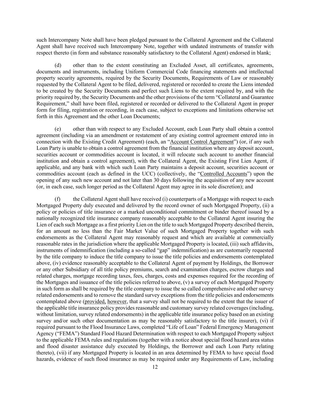 12 such Intercompany Note shall have been pledged pursuant to the Collateral Agreement and the Collateral Agent shall have received such Intercompany Note, together with undated instruments of transfer with respect thereto (in form and substance reasonably satisfactory to the Collateral Agent) endorsed in blank; (d) other than to the extent constituting an Excluded Asset, all certificates, agreements, documents and instruments, including Uniform Commercial Code financing statements and intellectual property security agreements, required by the Security Documents, Requirements of Law or reasonably requested by the Collateral Agent to be filed, delivered, registered or recorded to create the Liens intended to be created by the Security Documents and perfect such Liens to the extent required by, and with the priority required by, the Security Documents and the other provisions of the term “Collateral and Guarantee Requirement,” shall have been filed, registered or recorded or delivered to the Collateral Agent in proper form for filing, registration or recording, in each case, subject to exceptions and limitations otherwise set forth in this Agreement and the other Loan Documents; (e) other than with respect to any Excluded Account, each Loan Party shall obtain a control agreement (including via an amendment or restatement of any existing control agreement entered into in connection with the Existing Credit Agreement) (each, an “Account Control Agreement”) (or, if any such Loan Party is unable to obtain a control agreement from the financial institution where any deposit account, securities account or commodities account is located, it will relocate such account to another financial institution and obtain a control agreement), with the Collateral Agent, the Existing First Lien Agent, if applicable, and any bank with which such Loan Party maintains a deposit account, securities account or commodities account (each as defined in the UCC) (collectively, the “Controlled Accounts”) upon the opening of any such new account and not later than 30 days following the acquisition of any new account (or, in each case, such longer period as the Collateral Agent may agree in its sole discretion); and (f) the Collateral Agent shall have received (i) counterparts of a Mortgage with respect to each Mortgaged Property duly executed and delivered by the record owner of such Mortgaged Property, (ii) a policy or policies of title insurance or a marked unconditional commitment or binder thereof issued by a nationally recognized title insurance company reasonably acceptable to the Collateral Agent insuring the Lien of each such Mortgage as a first priority Lien on the title to such Mortgaged Property described therein, for an amount no less than the Fair Market Value of such Mortgaged Property together with such endorsements as the Collateral Agent may reasonably request and which are available at commercially reasonable rates in the jurisdiction where the applicable Mortgaged Property is located, (iii) such affidavits, instruments of indemnification (including a so-called “gap” indemnification) as are customarily requested by the title company to induce the title company to issue the title policies and endorsements contemplated above, (iv) evidence reasonably acceptable to the Collateral Agent of payment by Holdings, the Borrower or any other Subsidiary of all title policy premiums, search and examination charges, escrow charges and related charges, mortgage recording taxes, fees, charges, costs and expenses required for the recording of the Mortgages and issuance of the title policies referred to above, (v) a survey of each Mortgaged Property in such form as shall be required by the title company to issue the so called comprehensive and other survey related endorsements and to remove the standard survey exceptions from the title policies and endorsements contemplated above (provided, however, that a survey shall not be required to the extent that the issuer of the applicable title insurance policy provides reasonable and customary survey related coverages (including, without limitation, survey related endorsements) in the applicable title insurance policy based on an existing survey and/or such other documentation as may be reasonably satisfactory to the title insurer), (vi) if required pursuant to the Flood Insurance Laws, completed “Life of Loan” Federal Emergency Management Agency (“FEMA”) Standard Flood Hazard Determination with respect to each Mortgaged Property subject to the applicable FEMA rules and regulations (together with a notice about special flood hazard area status and flood disaster assistance duly executed by Holdings, the Borrower and each Loan Party relating thereto), (vii) if any Mortgaged Property is located in an area determined by FEMA to have special flood hazards, evidence of such flood insurance as may be required under any Requirements of Law, including