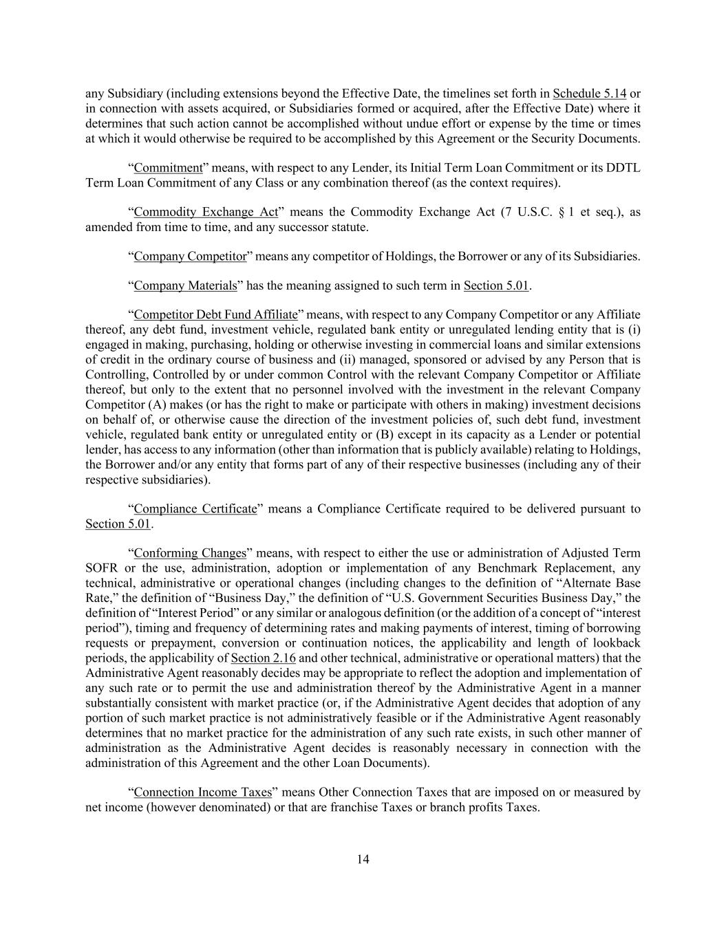 14 any Subsidiary (including extensions beyond the Effective Date, the timelines set forth in Schedule 5.14 or in connection with assets acquired, or Subsidiaries formed or acquired, after the Effective Date) where it determines that such action cannot be accomplished without undue effort or expense by the time or times at which it would otherwise be required to be accomplished by this Agreement or the Security Documents. “Commitment” means, with respect to any Lender, its Initial Term Loan Commitment or its DDTL Term Loan Commitment of any Class or any combination thereof (as the context requires). “Commodity Exchange Act” means the Commodity Exchange Act (7 U.S.C. § 1 et seq.), as amended from time to time, and any successor statute. “Company Competitor” means any competitor of Holdings, the Borrower or any of its Subsidiaries. “Company Materials” has the meaning assigned to such term in Section 5.01. “Competitor Debt Fund Affiliate” means, with respect to any Company Competitor or any Affiliate thereof, any debt fund, investment vehicle, regulated bank entity or unregulated lending entity that is (i) engaged in making, purchasing, holding or otherwise investing in commercial loans and similar extensions of credit in the ordinary course of business and (ii) managed, sponsored or advised by any Person that is Controlling, Controlled by or under common Control with the relevant Company Competitor or Affiliate thereof, but only to the extent that no personnel involved with the investment in the relevant Company Competitor (A) makes (or has the right to make or participate with others in making) investment decisions on behalf of, or otherwise cause the direction of the investment policies of, such debt fund, investment vehicle, regulated bank entity or unregulated entity or (B) except in its capacity as a Lender or potential lender, has access to any information (other than information that is publicly available) relating to Holdings, the Borrower and/or any entity that forms part of any of their respective businesses (including any of their respective subsidiaries). “Compliance Certificate” means a Compliance Certificate required to be delivered pursuant to Section 5.01. “Conforming Changes” means, with respect to either the use or administration of Adjusted Term SOFR or the use, administration, adoption or implementation of any Benchmark Replacement, any technical, administrative or operational changes (including changes to the definition of “Alternate Base Rate,” the definition of “Business Day,” the definition of “U.S. Government Securities Business Day,” the definition of “Interest Period” or any similar or analogous definition (or the addition of a concept of “interest period”), timing and frequency of determining rates and making payments of interest, timing of borrowing requests or prepayment, conversion or continuation notices, the applicability and length of lookback periods, the applicability of Section 2.16 and other technical, administrative or operational matters) that the Administrative Agent reasonably decides may be appropriate to reflect the adoption and implementation of any such rate or to permit the use and administration thereof by the Administrative Agent in a manner substantially consistent with market practice (or, if the Administrative Agent decides that adoption of any portion of such market practice is not administratively feasible or if the Administrative Agent reasonably determines that no market practice for the administration of any such rate exists, in such other manner of administration as the Administrative Agent decides is reasonably necessary in connection with the administration of this Agreement and the other Loan Documents). “Connection Income Taxes” means Other Connection Taxes that are imposed on or measured by net income (however denominated) or that are franchise Taxes or branch profits Taxes.