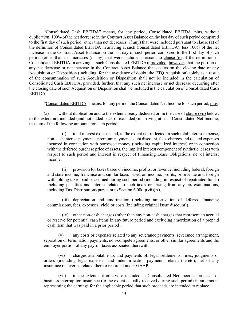 15 “Consolidated Cash EBITDA” means, for any period, Consolidated EBITDA, plus, without duplication, 100% of the net decrease in the Contract Asset Balance on the last day of such period compared to the first day of such period (other than net decreases (if any) that were included pursuant to clause (a) of the definition of Consolidated EBITDA in arriving at such Consolidated EBITDA), less 100% of the net increase in the Contract Asset Balance on the last day of such period compared to the first day of such period (other than net increases (if any) that were included pursuant to clause (c) of the definition of Consolidated EBITDA in arriving at such Consolidated EBITDA); provided, however, that the portion of any net decrease or net increase in the Contract Asset Balance that occurs on the closing date of any Acquisition or Disposition (including, for the avoidance of doubt, the ETQ Acquisition) solely as a result of the consummation of such Acquisition or Disposition shall not be included in the calculation of Consolidated Cash EBITDA; provided, further, that any such net increase or net decrease occurring after the closing date of such Acquisition or Disposition shall be included in the calculation of Consolidated Cash EBITDA. “Consolidated EBITDA” means, for any period, the Consolidated Net Income for such period, plus: (a) without duplication and to the extent already deducted or, in the case of clause (vii) below, to the extent not included (and not added back or excluded) in arriving at such Consolidated Net Income, the sum of the following amounts for such period: (i) total interest expense and, to the extent not reflected in such total interest expense, non-cash interest payments, premium payments, debt discount, fees, charges and related expenses incurred in connection with borrowed money (including capitalized interest) or in connection with the deferred purchase price of assets, the implied interest component of synthetic leases with respect to such period and interest in respect of Financing Lease Obligations, net of interest income, (ii) provision for taxes based on income, profits, or revenue, including federal, foreign and state income, franchise and similar taxes based on income, profits, or revenue and foreign withholding taxes paid or accrued during such period (including in respect of repatriated funds) including penalties and interest related to such taxes or arising from any tax examinations, including Tax Distributions pursuant to Section 6.08(a)(vii)(A), (iii) depreciation and amortization (including amortization of deferred financing commissions, fees, expenses, yield or costs (including original issue discount)), (iv) other non-cash charges (other than any non-cash charges that represent an accrual or reserve for potential cash items in any future period and excluding amortization of a prepaid cash item that was paid in a prior period), (v) any costs or expenses related to any severance payments, severance arrangement, separation or termination payments, non-compete agreements, or other similar agreements and the employer portion of any payroll taxes associated therewith, (vi) charges attributable to, and payments of, legal settlements, fines, judgments or orders (including legal expenses and indemnification payments related thereto), net of any insurance recoveries related thereto recorded under GAAP, (vii) to the extent not otherwise included in Consolidated Net Income, proceeds of business interruption insurance (to the extent actually received during such period) in an amount representing the earnings for the applicable period that such proceeds are intended to replace,
