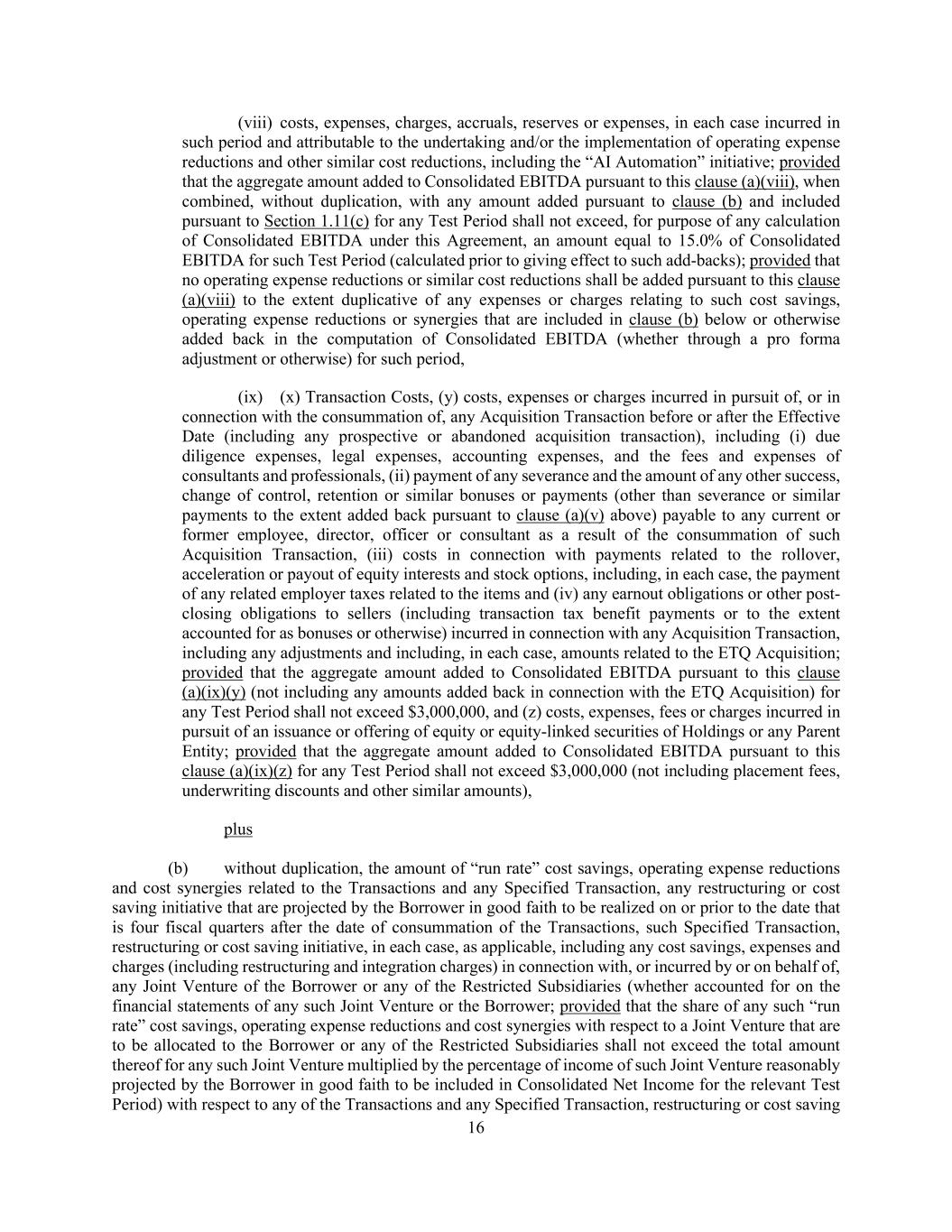 16 (viii) costs, expenses, charges, accruals, reserves or expenses, in each case incurred in such period and attributable to the undertaking and/or the implementation of operating expense reductions and other similar cost reductions, including the “AI Automation” initiative; provided that the aggregate amount added to Consolidated EBITDA pursuant to this clause (a)(viii), when combined, without duplication, with any amount added pursuant to clause (b) and included pursuant to Section 1.11(c) for any Test Period shall not exceed, for purpose of any calculation of Consolidated EBITDA under this Agreement, an amount equal to 15.0% of Consolidated EBITDA for such Test Period (calculated prior to giving effect to such add-backs); provided that no operating expense reductions or similar cost reductions shall be added pursuant to this clause (a)(viii) to the extent duplicative of any expenses or charges relating to such cost savings, operating expense reductions or synergies that are included in clause (b) below or otherwise added back in the computation of Consolidated EBITDA (whether through a pro forma adjustment or otherwise) for such period, (ix) (x) Transaction Costs, (y) costs, expenses or charges incurred in pursuit of, or in connection with the consummation of, any Acquisition Transaction before or after the Effective Date (including any prospective or abandoned acquisition transaction), including (i) due diligence expenses, legal expenses, accounting expenses, and the fees and expenses of consultants and professionals, (ii) payment of any severance and the amount of any other success, change of control, retention or similar bonuses or payments (other than severance or similar payments to the extent added back pursuant to clause (a)(v) above) payable to any current or former employee, director, officer or consultant as a result of the consummation of such Acquisition Transaction, (iii) costs in connection with payments related to the rollover, acceleration or payout of equity interests and stock options, including, in each case, the payment of any related employer taxes related to the items and (iv) any earnout obligations or other post- closing obligations to sellers (including transaction tax benefit payments or to the extent accounted for as bonuses or otherwise) incurred in connection with any Acquisition Transaction, including any adjustments and including, in each case, amounts related to the ETQ Acquisition; provided that the aggregate amount added to Consolidated EBITDA pursuant to this clause (a)(ix)(y) (not including any amounts added back in connection with the ETQ Acquisition) for any Test Period shall not exceed $3,000,000, and (z) costs, expenses, fees or charges incurred in pursuit of an issuance or offering of equity or equity-linked securities of Holdings or any Parent Entity; provided that the aggregate amount added to Consolidated EBITDA pursuant to this clause (a)(ix)(z) for any Test Period shall not exceed $3,000,000 (not including placement fees, underwriting discounts and other similar amounts), plus (b) without duplication, the amount of “run rate” cost savings, operating expense reductions and cost synergies related to the Transactions and any Specified Transaction, any restructuring or cost saving initiative that are projected by the Borrower in good faith to be realized on or prior to the date that is four fiscal quarters after the date of consummation of the Transactions, such Specified Transaction, restructuring or cost saving initiative, in each case, as applicable, including any cost savings, expenses and charges (including restructuring and integration charges) in connection with, or incurred by or on behalf of, any Joint Venture of the Borrower or any of the Restricted Subsidiaries (whether accounted for on the financial statements of any such Joint Venture or the Borrower; provided that the share of any such “run rate” cost savings, operating expense reductions and cost synergies with respect to a Joint Venture that are to be allocated to the Borrower or any of the Restricted Subsidiaries shall not exceed the total amount thereof for any such Joint Venture multiplied by the percentage of income of such Joint Venture reasonably projected by the Borrower in good faith to be included in Consolidated Net Income for the relevant Test Period) with respect to any of the Transactions and any Specified Transaction, restructuring or cost saving