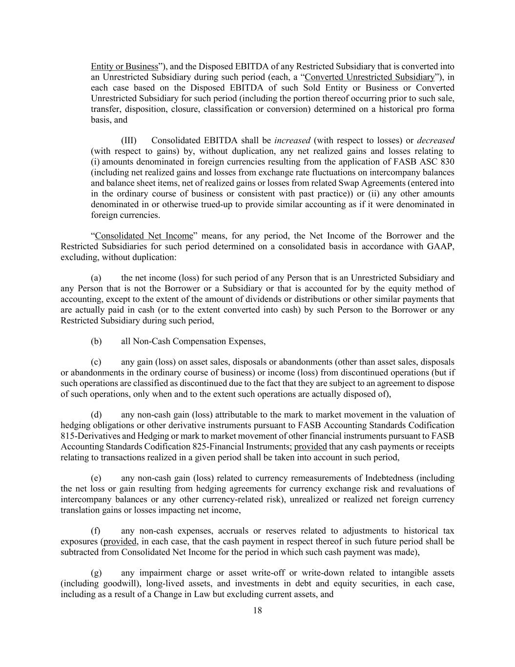18 Entity or Business”), and the Disposed EBITDA of any Restricted Subsidiary that is converted into an Unrestricted Subsidiary during such period (each, a “Converted Unrestricted Subsidiary”), in each case based on the Disposed EBITDA of such Sold Entity or Business or Converted Unrestricted Subsidiary for such period (including the portion thereof occurring prior to such sale, transfer, disposition, closure, classification or conversion) determined on a historical pro forma basis, and (III) Consolidated EBITDA shall be increased (with respect to losses) or decreased (with respect to gains) by, without duplication, any net realized gains and losses relating to (i) amounts denominated in foreign currencies resulting from the application of FASB ASC 830 (including net realized gains and losses from exchange rate fluctuations on intercompany balances and balance sheet items, net of realized gains or losses from related Swap Agreements (entered into in the ordinary course of business or consistent with past practice)) or (ii) any other amounts denominated in or otherwise trued-up to provide similar accounting as if it were denominated in foreign currencies. “Consolidated Net Income” means, for any period, the Net Income of the Borrower and the Restricted Subsidiaries for such period determined on a consolidated basis in accordance with GAAP, excluding, without duplication: (a) the net income (loss) for such period of any Person that is an Unrestricted Subsidiary and any Person that is not the Borrower or a Subsidiary or that is accounted for by the equity method of accounting, except to the extent of the amount of dividends or distributions or other similar payments that are actually paid in cash (or to the extent converted into cash) by such Person to the Borrower or any Restricted Subsidiary during such period, (b) all Non-Cash Compensation Expenses, (c) any gain (loss) on asset sales, disposals or abandonments (other than asset sales, disposals or abandonments in the ordinary course of business) or income (loss) from discontinued operations (but if such operations are classified as discontinued due to the fact that they are subject to an agreement to dispose of such operations, only when and to the extent such operations are actually disposed of), (d) any non-cash gain (loss) attributable to the mark to market movement in the valuation of hedging obligations or other derivative instruments pursuant to FASB Accounting Standards Codification 815-Derivatives and Hedging or mark to market movement of other financial instruments pursuant to FASB Accounting Standards Codification 825-Financial Instruments; provided that any cash payments or receipts relating to transactions realized in a given period shall be taken into account in such period, (e) any non-cash gain (loss) related to currency remeasurements of Indebtedness (including the net loss or gain resulting from hedging agreements for currency exchange risk and revaluations of intercompany balances or any other currency-related risk), unrealized or realized net foreign currency translation gains or losses impacting net income, (f) any non-cash expenses, accruals or reserves related to adjustments to historical tax exposures (provided, in each case, that the cash payment in respect thereof in such future period shall be subtracted from Consolidated Net Income for the period in which such cash payment was made), (g) any impairment charge or asset write-off or write-down related to intangible assets (including goodwill), long-lived assets, and investments in debt and equity securities, in each case, including as a result of a Change in Law but excluding current assets, and