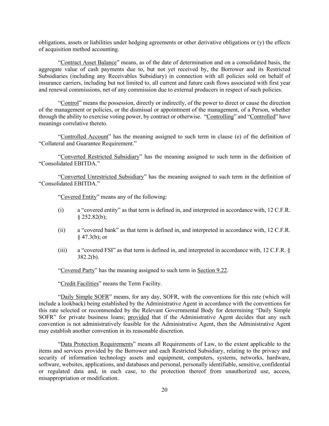 20 obligations, assets or liabilities under hedging agreements or other derivative obligations or (y) the effects of acquisition method accounting. “Contract Asset Balance” means, as of the date of determination and on a consolidated basis, the aggregate value of cash payments due to, but not yet received by, the Borrower and its Restricted Subsidiaries (including any Receivables Subsidiary) in connection with all policies sold on behalf of insurance carriers, including but not limited to, all current and future cash flows associated with first year and renewal commissions, net of any commission due to external producers in respect of such policies. “Control” means the possession, directly or indirectly, of the power to direct or cause the direction of the management or policies, or the dismissal or appointment of the management, of a Person, whether through the ability to exercise voting power, by contract or otherwise. “Controlling” and “Controlled” have meanings correlative thereto. “Controlled Account” has the meaning assigned to such term in clause (e) of the definition of “Collateral and Guarantee Requirement.” “Converted Restricted Subsidiary” has the meaning assigned to such term in the definition of “Consolidated EBITDA.” “Converted Unrestricted Subsidiary” has the meaning assigned to such term in the definition of “Consolidated EBITDA.” “Covered Entity” means any of the following: (i) a “covered entity” as that term is defined in, and interpreted in accordance with, 12 C.F.R. § 252.82(b); (ii) a “covered bank” as that term is defined in, and interpreted in accordance with, 12 C.F.R. § 47.3(b); or (iii) a “covered FSI” as that term is defined in, and interpreted in accordance with, 12 C.F.R. § 382.2(b). “Covered Party” has the meaning assigned to such term in Section 9.22. “Credit Facilities” means the Term Facility. “Daily Simple SOFR” means, for any day, SOFR, with the conventions for this rate (which will include a lookback) being established by the Administrative Agent in accordance with the conventions for this rate selected or recommended by the Relevant Governmental Body for determining “Daily Simple SOFR” for private business loans; provided that if the Administrative Agent decides that any such convention is not administratively feasible for the Administrative Agent, then the Administrative Agent may establish another convention in its reasonable discretion. “Data Protection Requirements” means all Requirements of Law, to the extent applicable to the items and services provided by the Borrower and each Restricted Subsidiary, relating to the privacy and security of information technology assets and equipment, computers, systems, networks, hardware, software, websites, applications, and databases and personal, personally identifiable, sensitive, confidential or regulated data and, in each case, to the protection thereof from unauthorized use, access, misappropriation or modification.