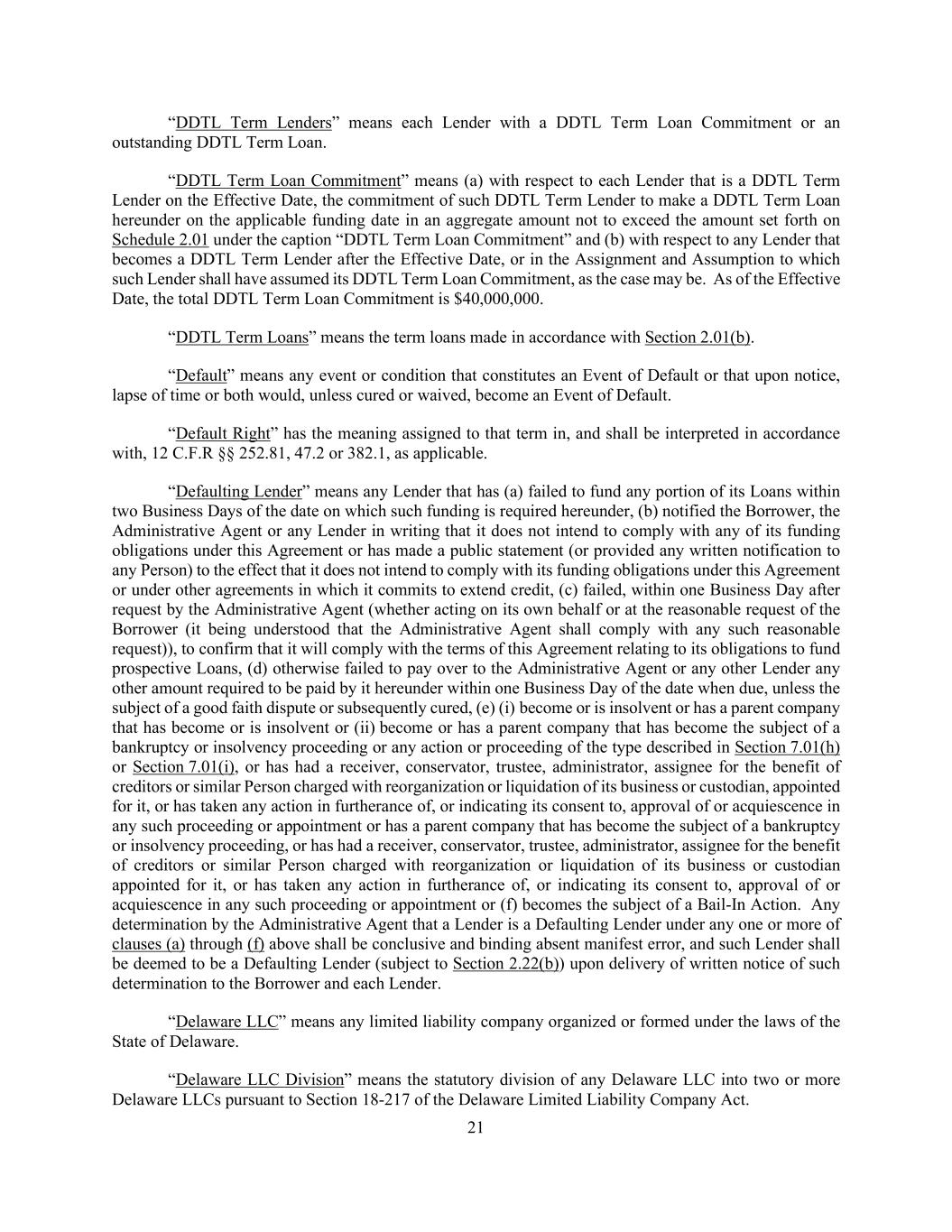 21 “DDTL Term Lenders” means each Lender with a DDTL Term Loan Commitment or an outstanding DDTL Term Loan. “DDTL Term Loan Commitment” means (a) with respect to each Lender that is a DDTL Term Lender on the Effective Date, the commitment of such DDTL Term Lender to make a DDTL Term Loan hereunder on the applicable funding date in an aggregate amount not to exceed the amount set forth on Schedule 2.01 under the caption “DDTL Term Loan Commitment” and (b) with respect to any Lender that becomes a DDTL Term Lender after the Effective Date, or in the Assignment and Assumption to which such Lender shall have assumed its DDTL Term Loan Commitment, as the case may be. As of the Effective Date, the total DDTL Term Loan Commitment is $40,000,000. “DDTL Term Loans” means the term loans made in accordance with Section 2.01(b). “Default” means any event or condition that constitutes an Event of Default or that upon notice, lapse of time or both would, unless cured or waived, become an Event of Default. “Default Right” has the meaning assigned to that term in, and shall be interpreted in accordance with, 12 C.F.R §§ 252.81, 47.2 or 382.1, as applicable. “Defaulting Lender” means any Lender that has (a) failed to fund any portion of its Loans within two Business Days of the date on which such funding is required hereunder, (b) notified the Borrower, the Administrative Agent or any Lender in writing that it does not intend to comply with any of its funding obligations under this Agreement or has made a public statement (or provided any written notification to any Person) to the effect that it does not intend to comply with its funding obligations under this Agreement or under other agreements in which it commits to extend credit, (c) failed, within one Business Day after request by the Administrative Agent (whether acting on its own behalf or at the reasonable request of the Borrower (it being understood that the Administrative Agent shall comply with any such reasonable request)), to confirm that it will comply with the terms of this Agreement relating to its obligations to fund prospective Loans, (d) otherwise failed to pay over to the Administrative Agent or any other Lender any other amount required to be paid by it hereunder within one Business Day of the date when due, unless the subject of a good faith dispute or subsequently cured, (e) (i) become or is insolvent or has a parent company that has become or is insolvent or (ii) become or has a parent company that has become the subject of a bankruptcy or insolvency proceeding or any action or proceeding of the type described in Section 7.01(h) or Section 7.01(i), or has had a receiver, conservator, trustee, administrator, assignee for the benefit of creditors or similar Person charged with reorganization or liquidation of its business or custodian, appointed for it, or has taken any action in furtherance of, or indicating its consent to, approval of or acquiescence in any such proceeding or appointment or has a parent company that has become the subject of a bankruptcy or insolvency proceeding, or has had a receiver, conservator, trustee, administrator, assignee for the benefit of creditors or similar Person charged with reorganization or liquidation of its business or custodian appointed for it, or has taken any action in furtherance of, or indicating its consent to, approval of or acquiescence in any such proceeding or appointment or (f) becomes the subject of a Bail-In Action. Any determination by the Administrative Agent that a Lender is a Defaulting Lender under any one or more of clauses (a) through (f) above shall be conclusive and binding absent manifest error, and such Lender shall be deemed to be a Defaulting Lender (subject to Section 2.22(b)) upon delivery of written notice of such determination to the Borrower and each Lender. “Delaware LLC” means any limited liability company organized or formed under the laws of the State of Delaware. “Delaware LLC Division” means the statutory division of any Delaware LLC into two or more Delaware LLCs pursuant to Section 18-217 of the Delaware Limited Liability Company Act.